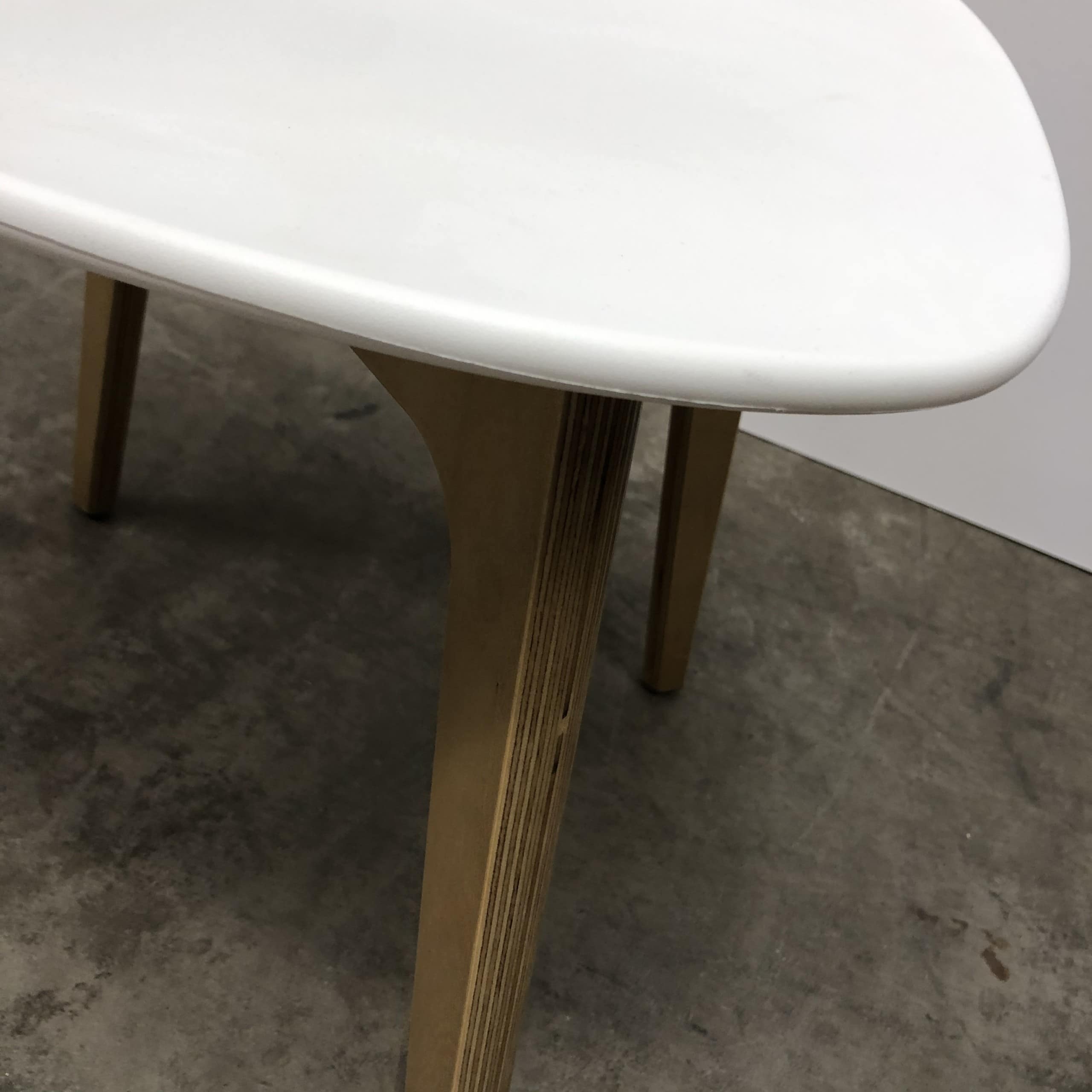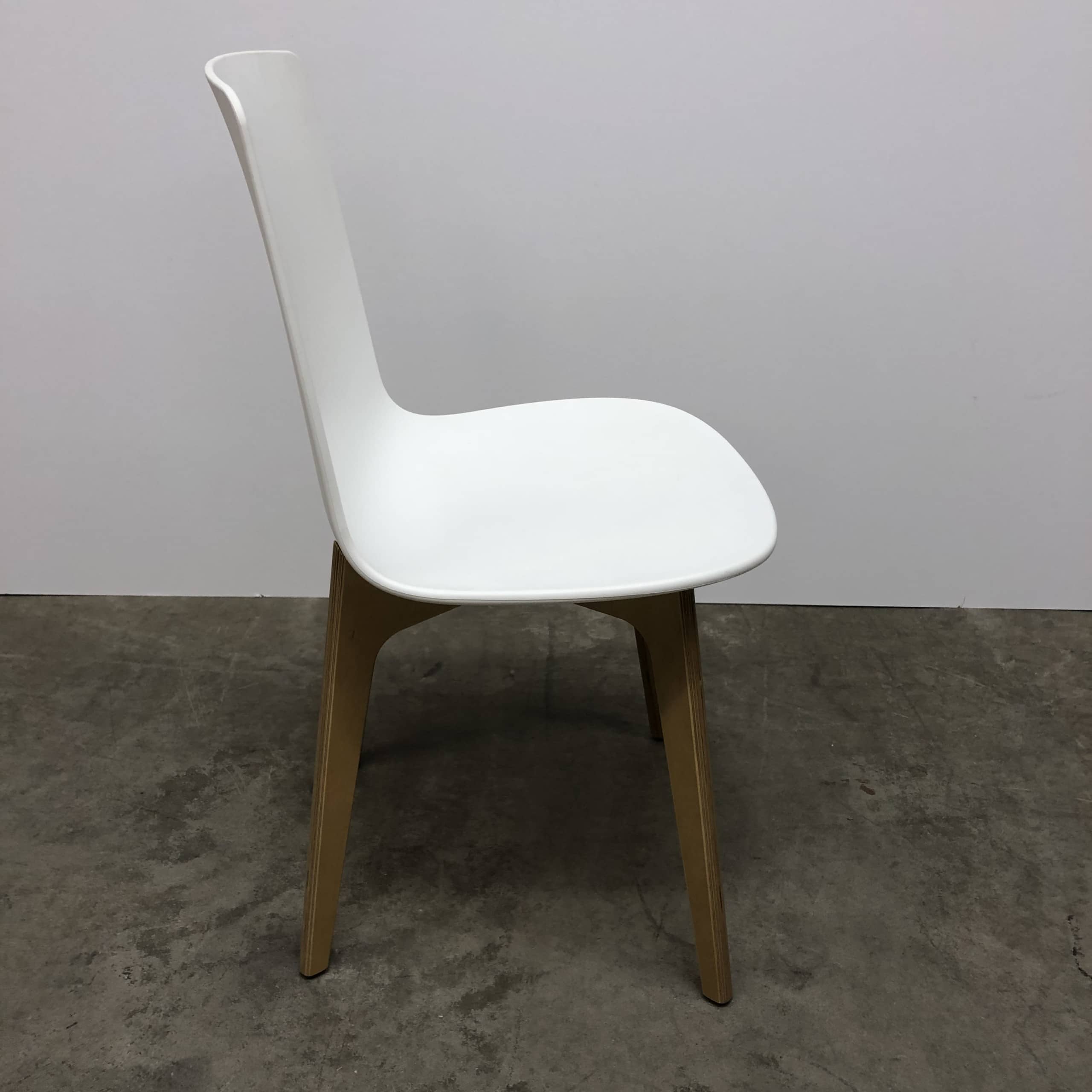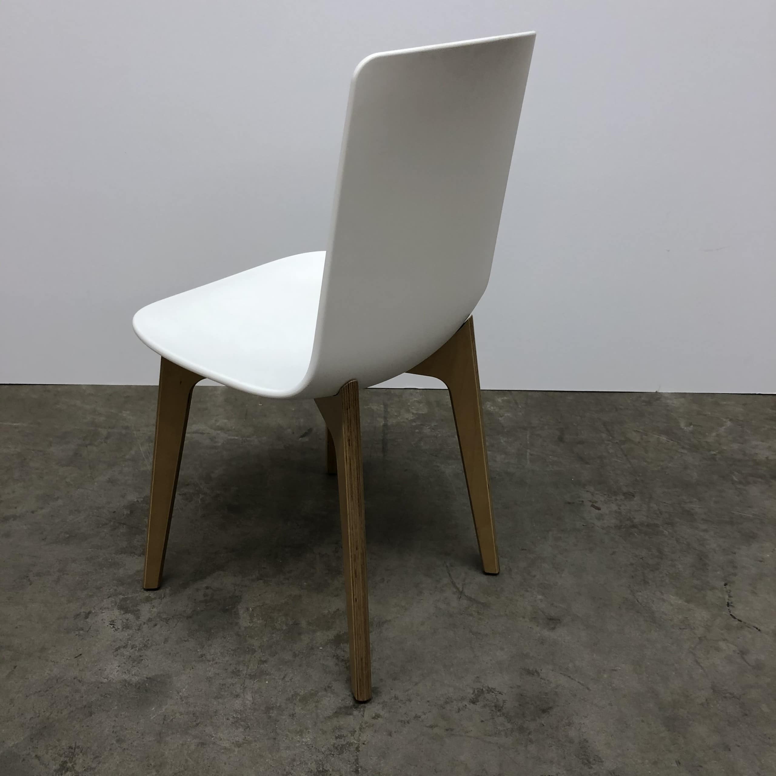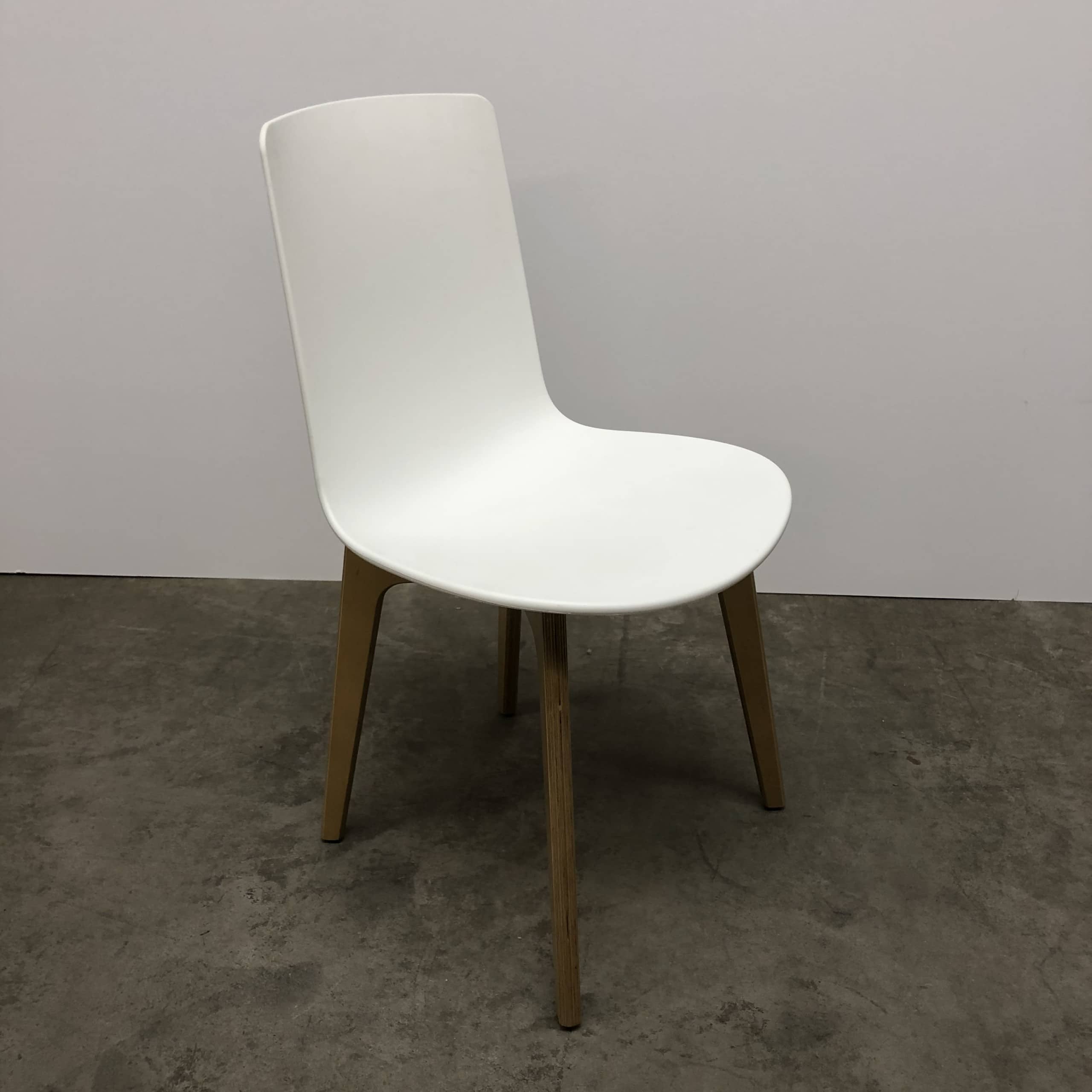 Seat and backrest in plastic (white). Legs in wood (oak).