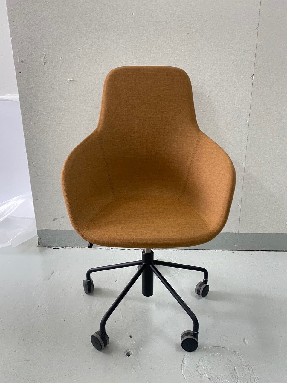 Seat and backrest in fabric (yellow). Star base in metal (black). Adjustable height.
