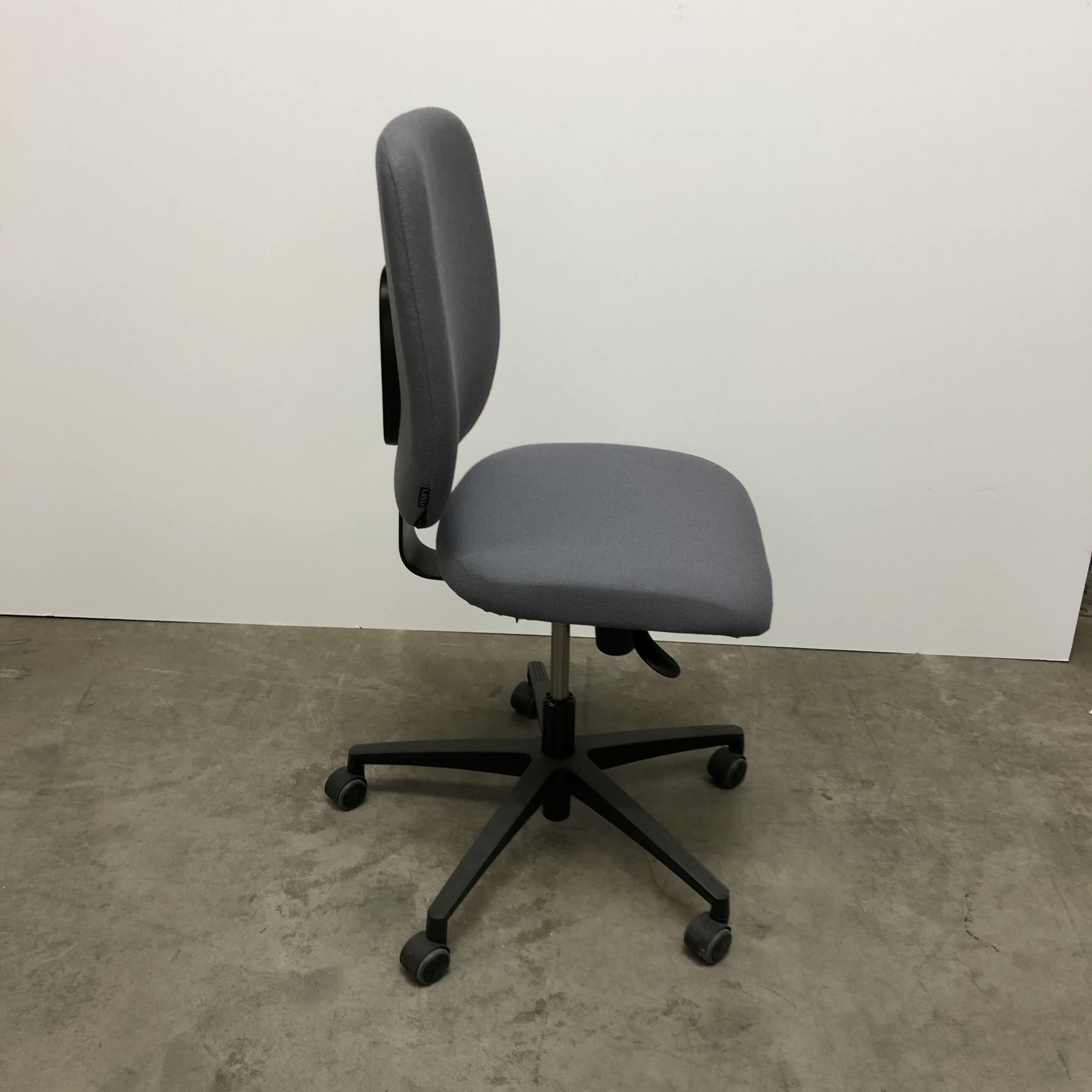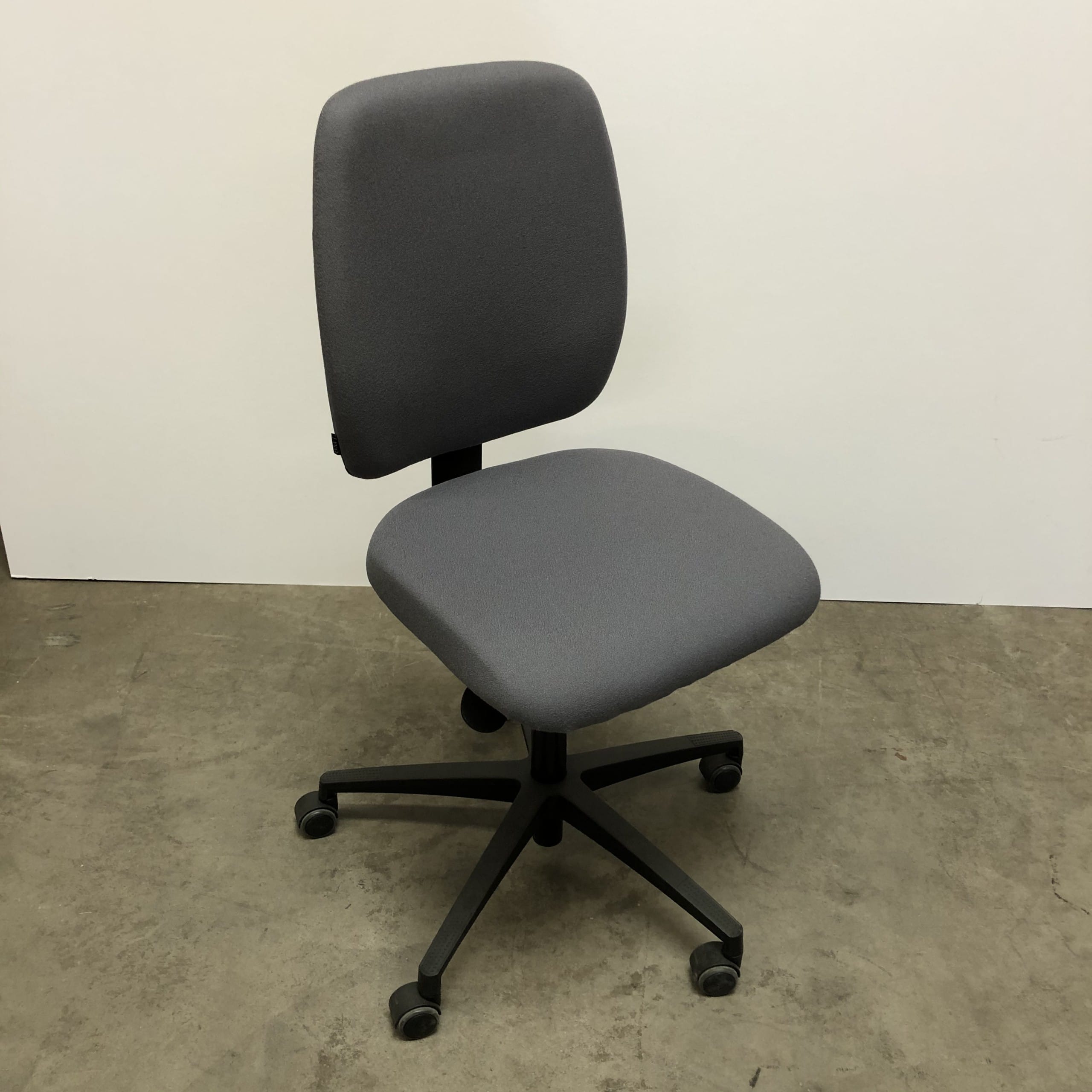 Seat and backrest in fabric (grey). Star base in plastic (black). Adjustable height.