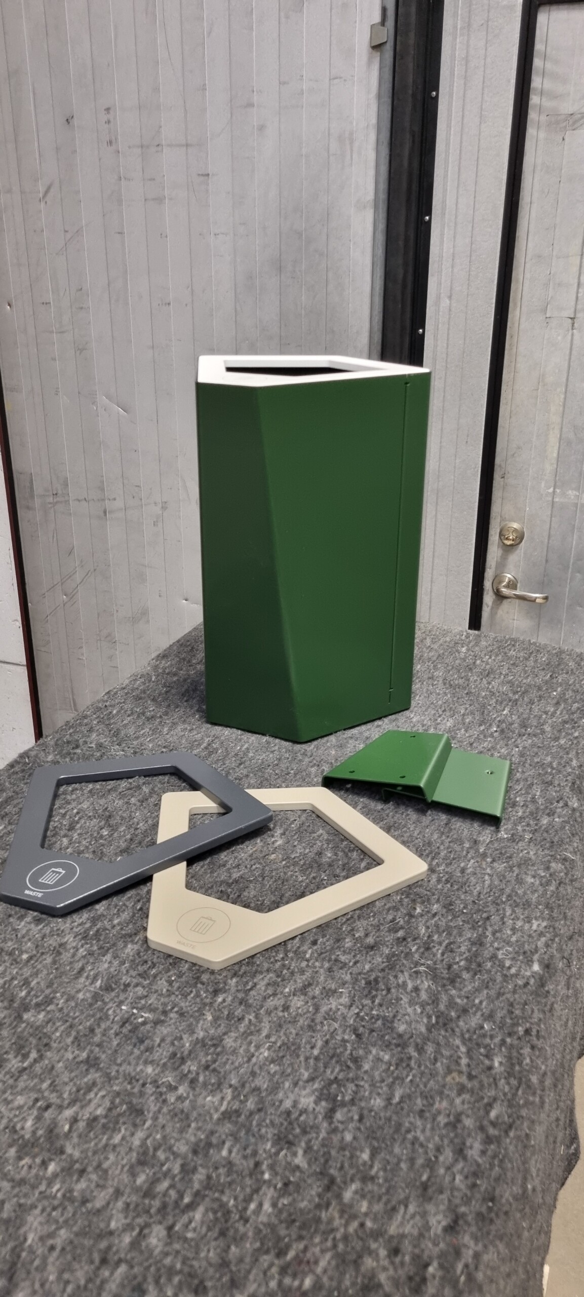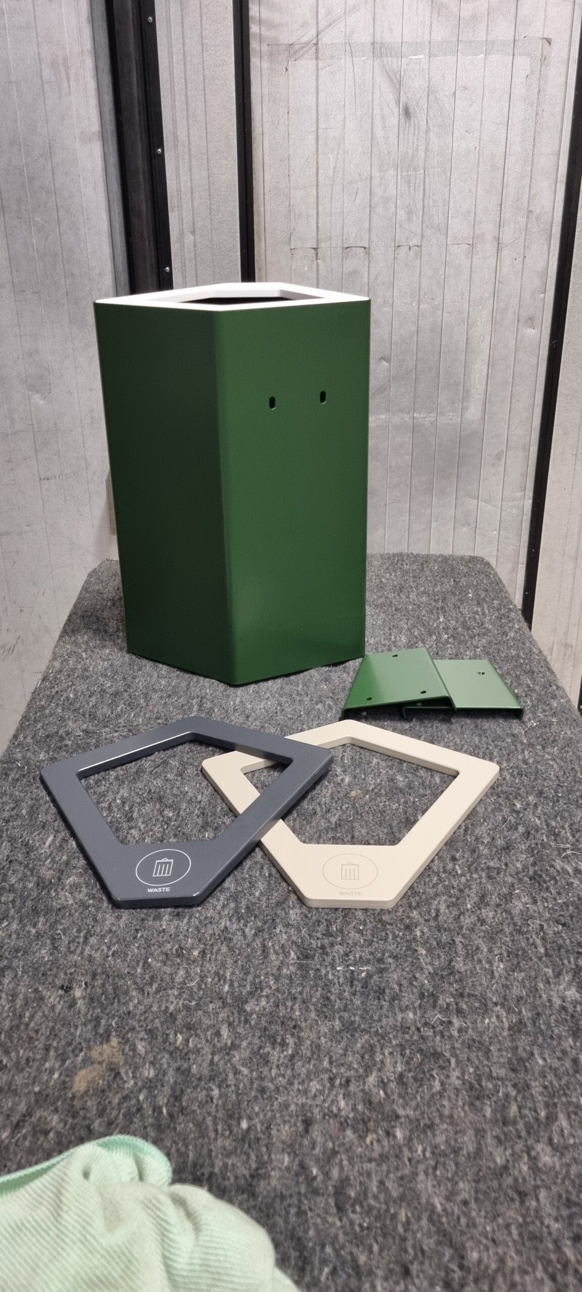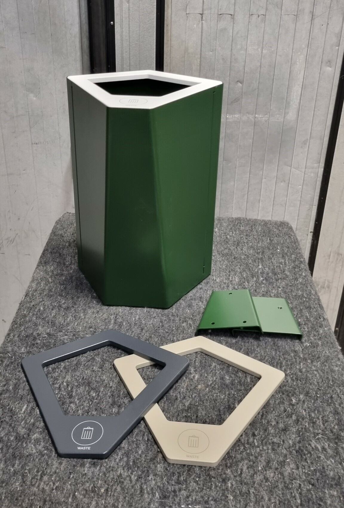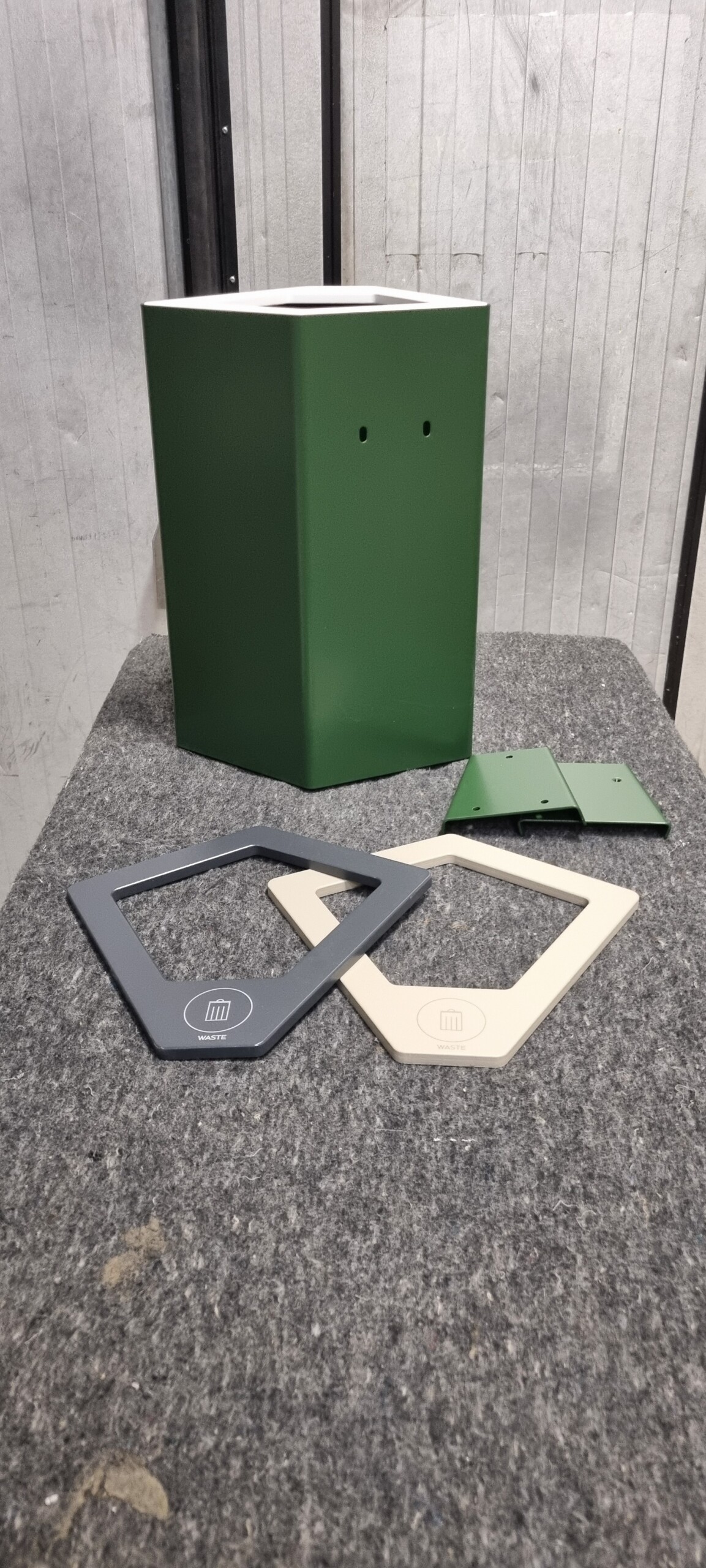 Wall mount included to hang it on the wall. Lid available in white, anthracite and olive gray with different symbols.