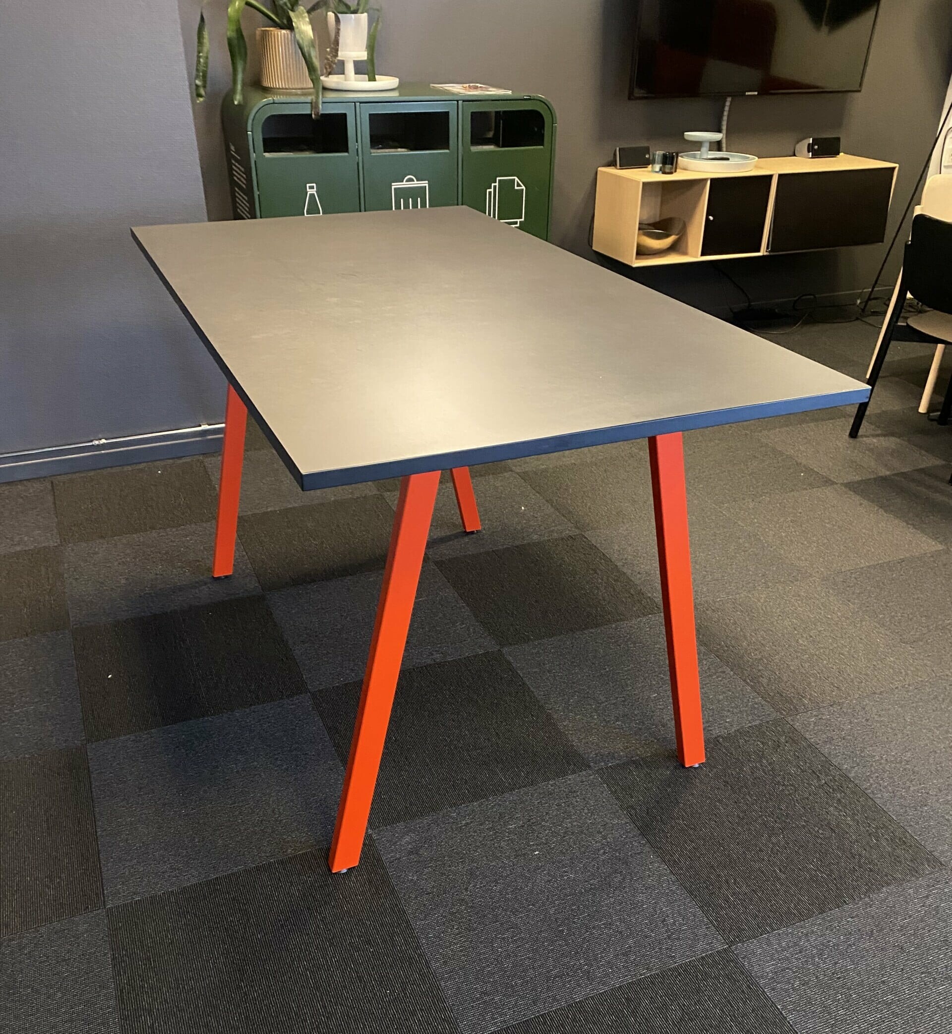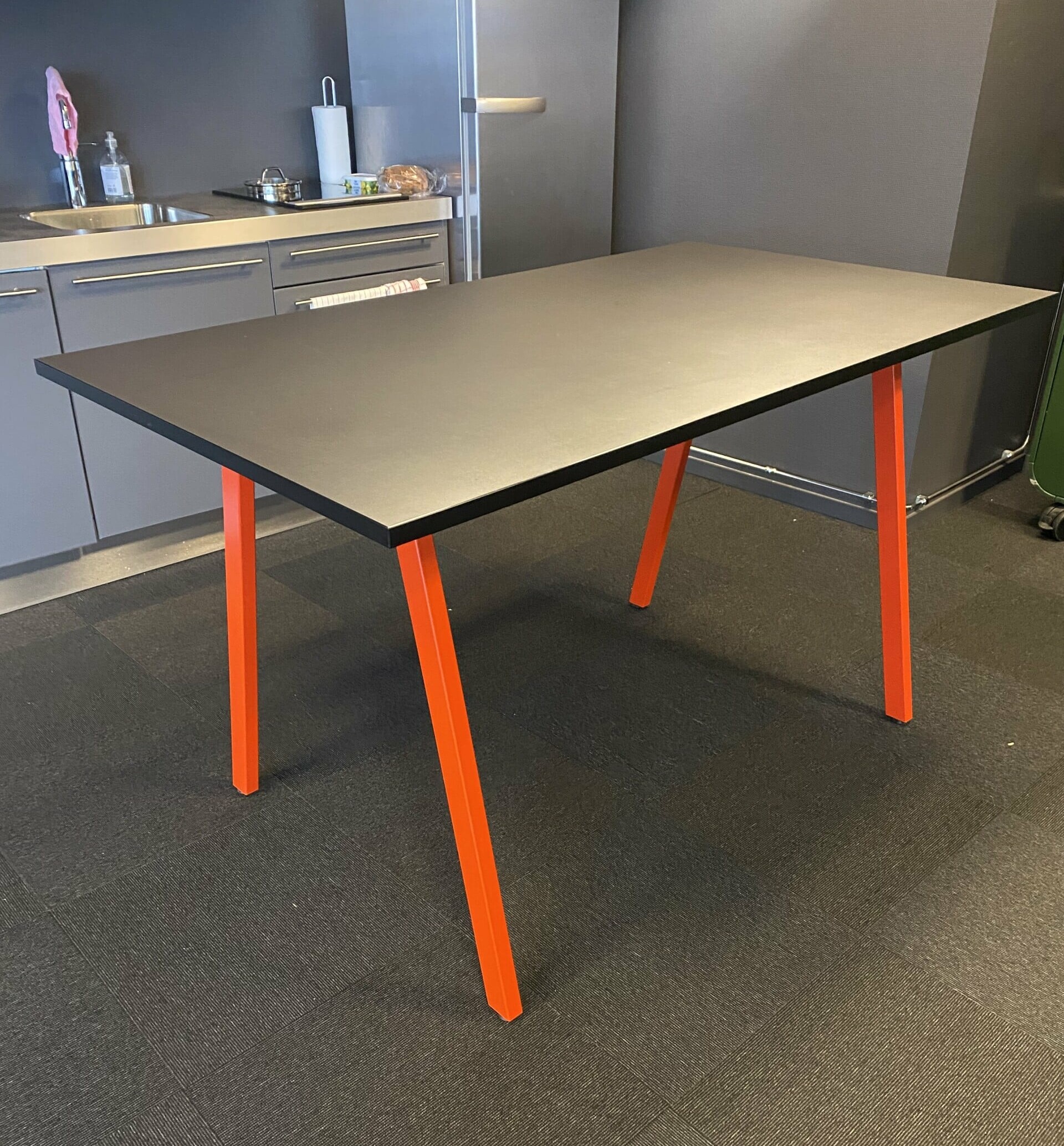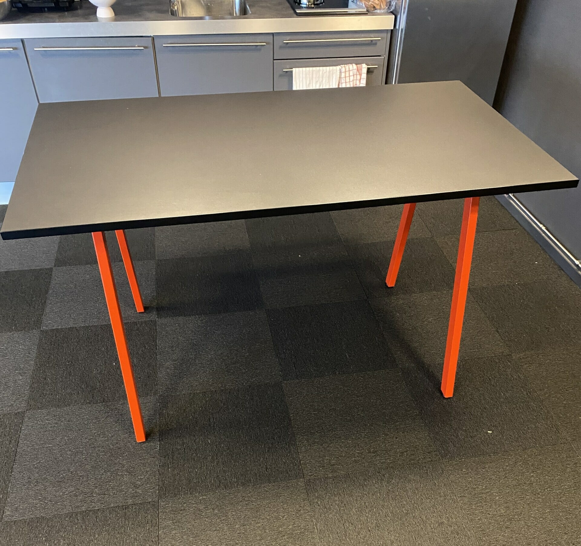Table top in linoleum (black). Base in metal (red).