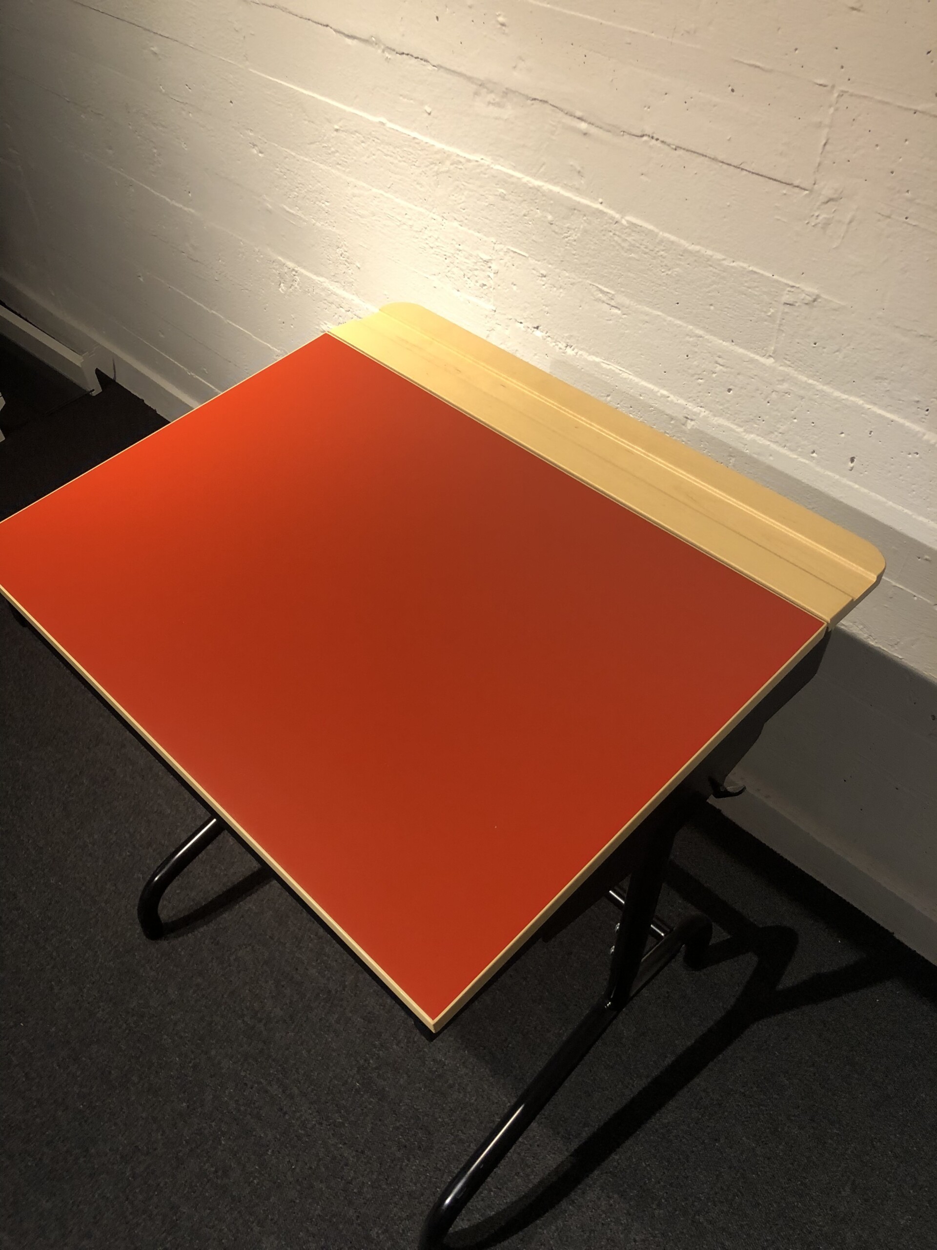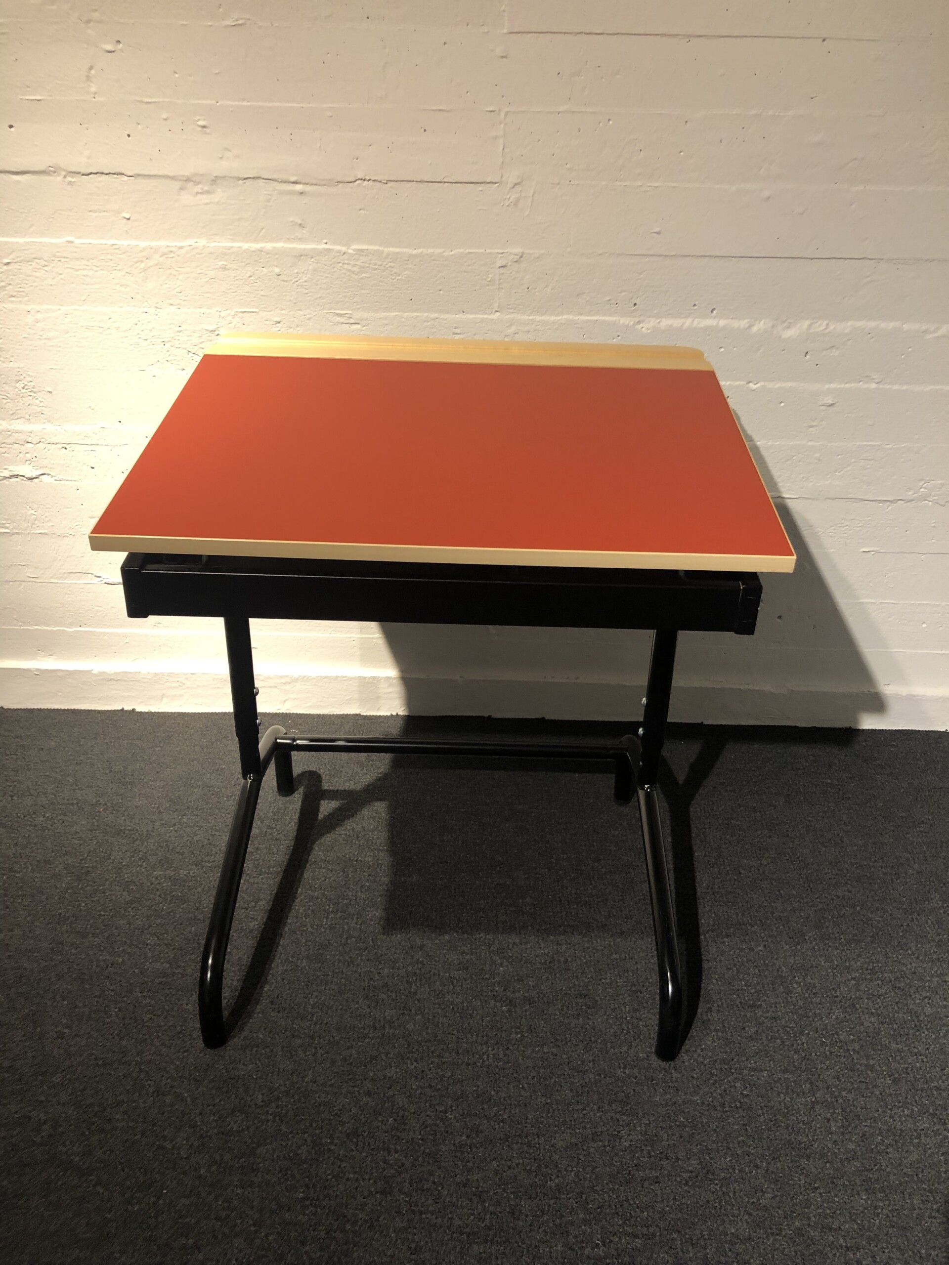 Table top in laminat (red). Base in metal (black). Adjustable height.