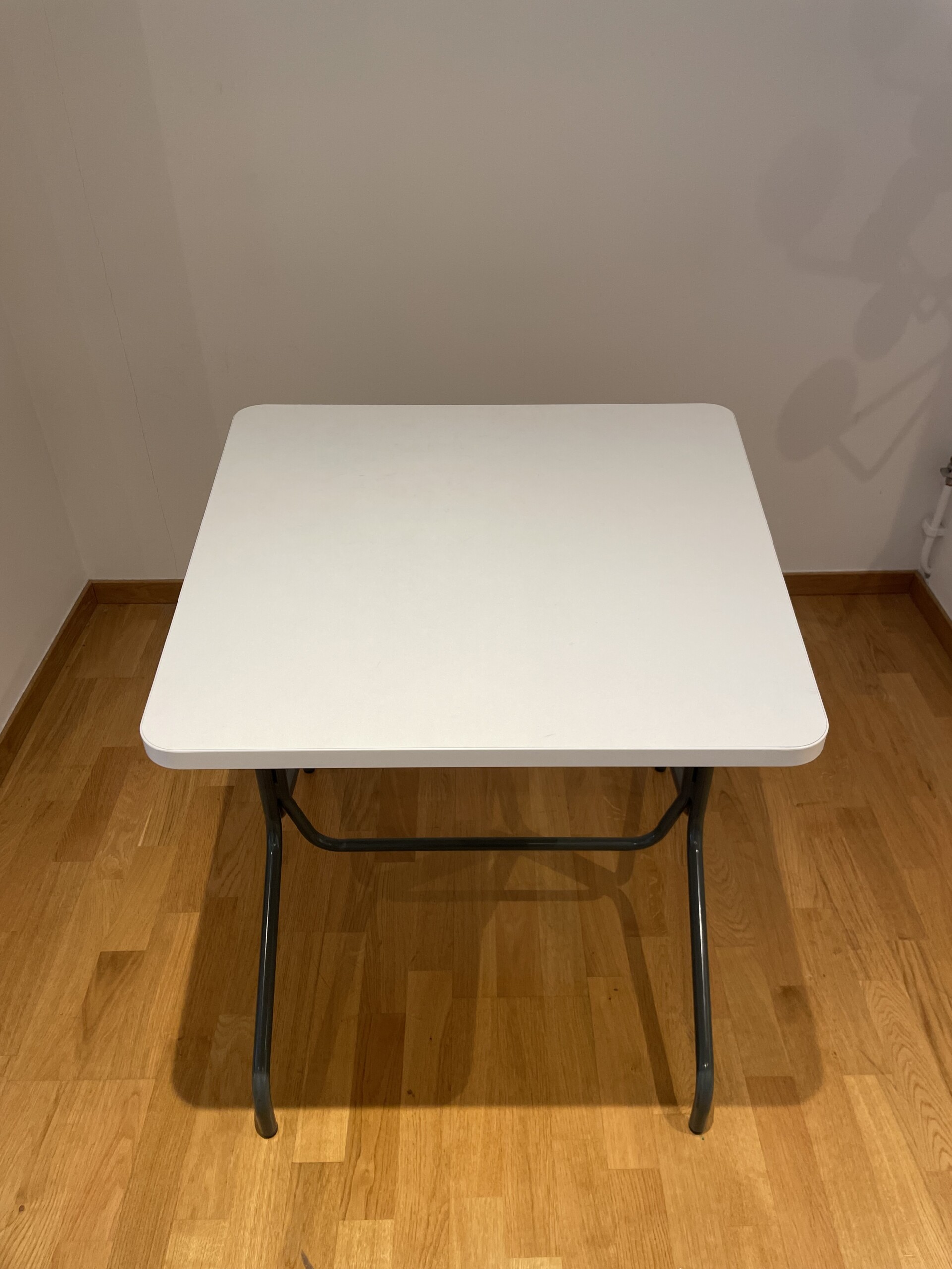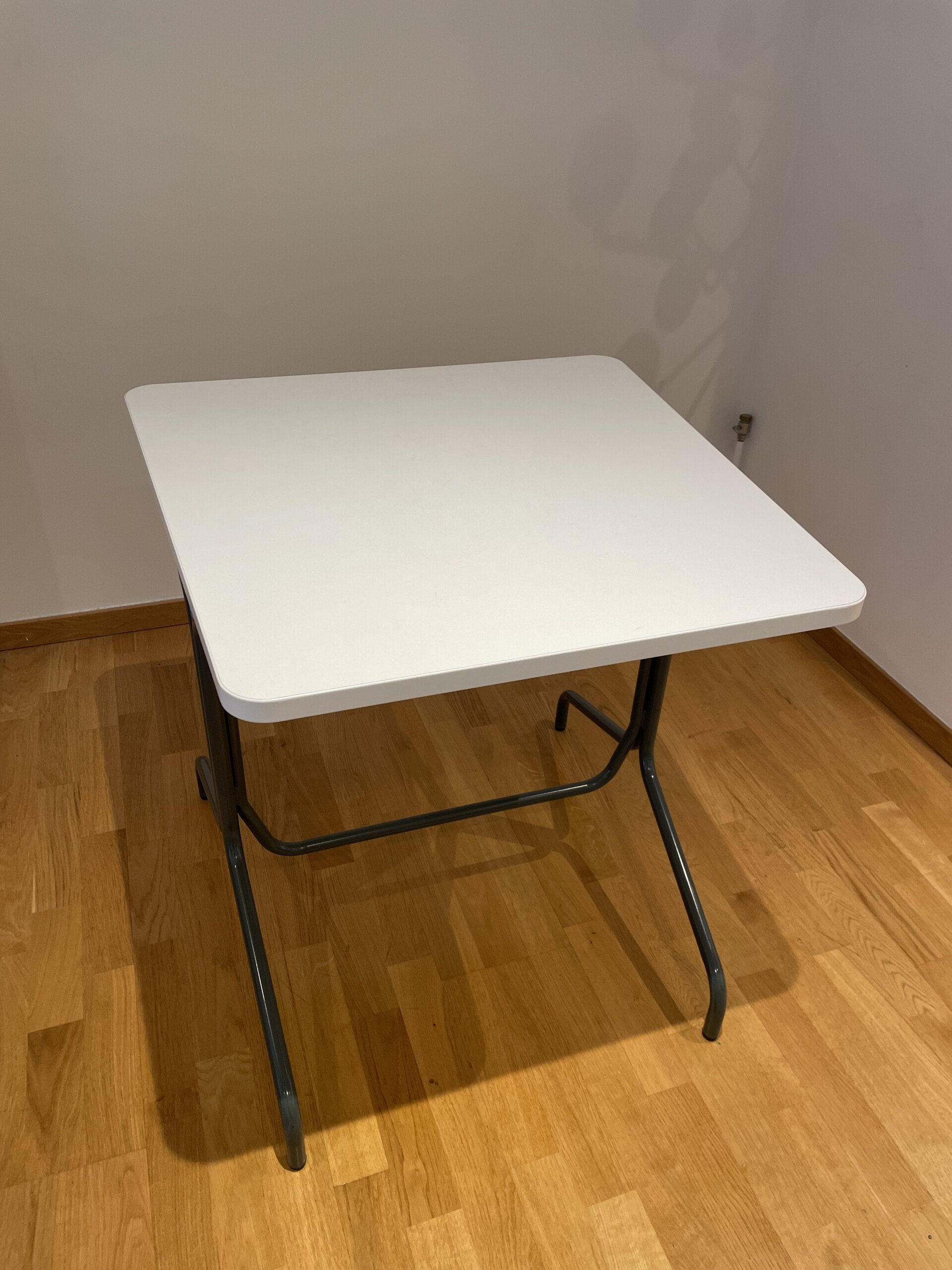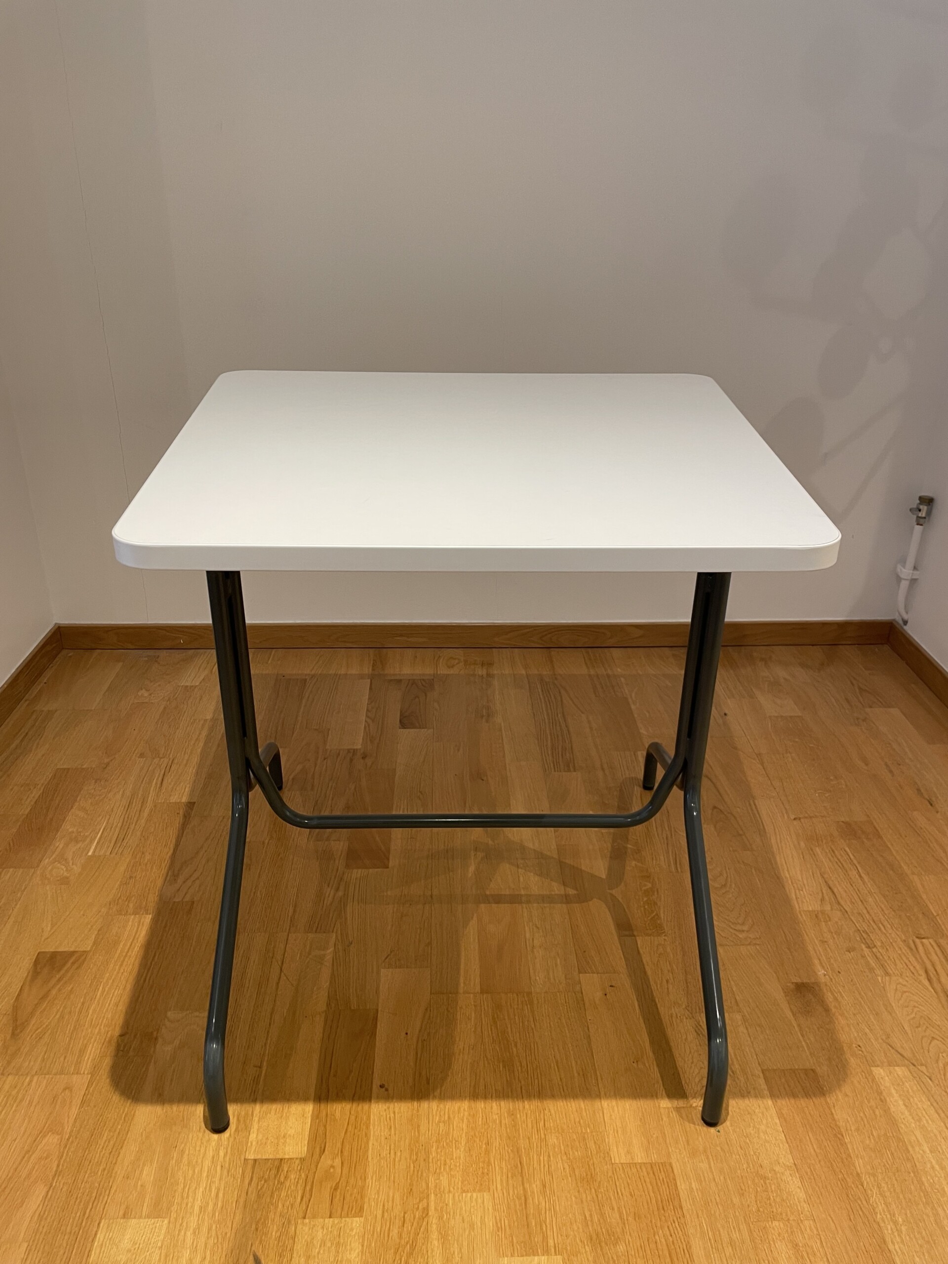 Table top in laminat (white). Base in metal (grey).