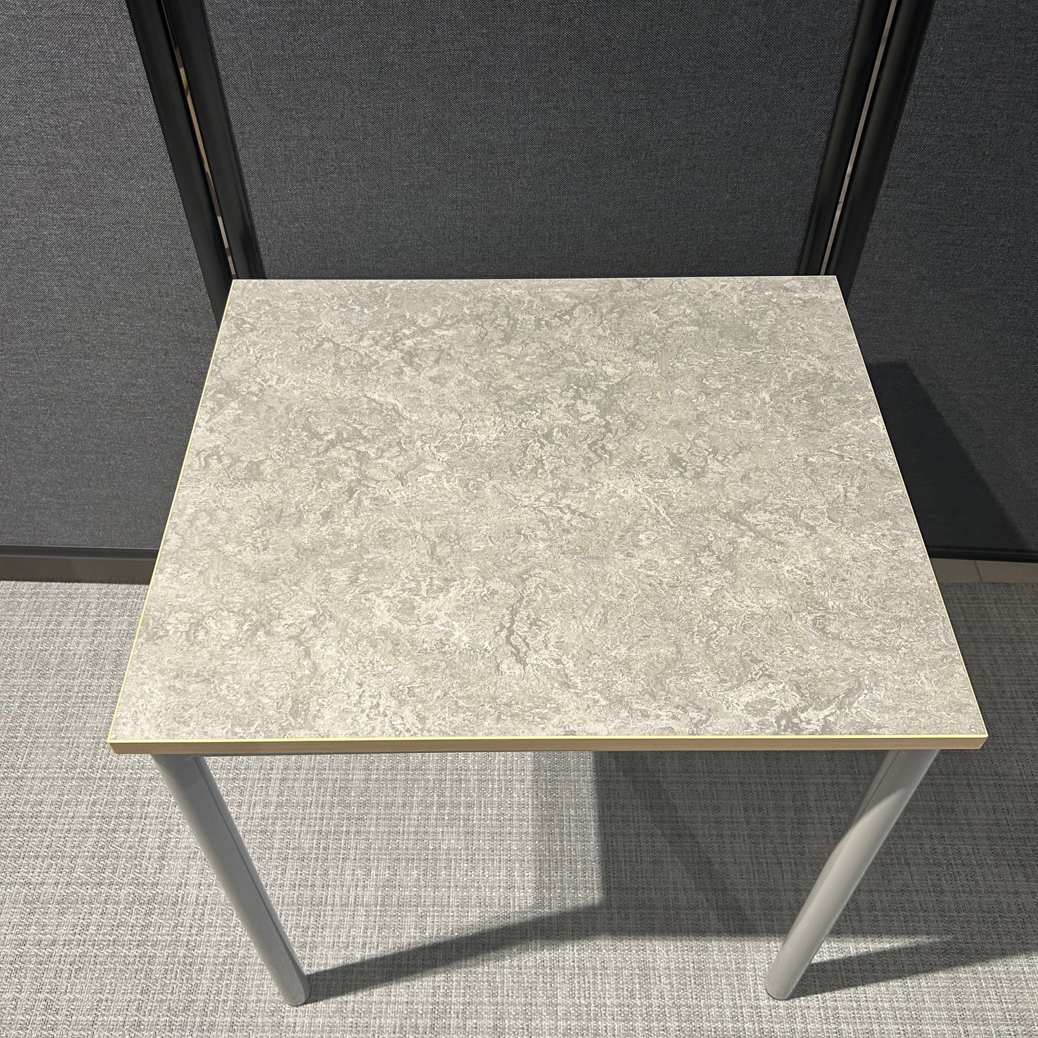 Table top in linoleum (grey). Base in metal (silver).