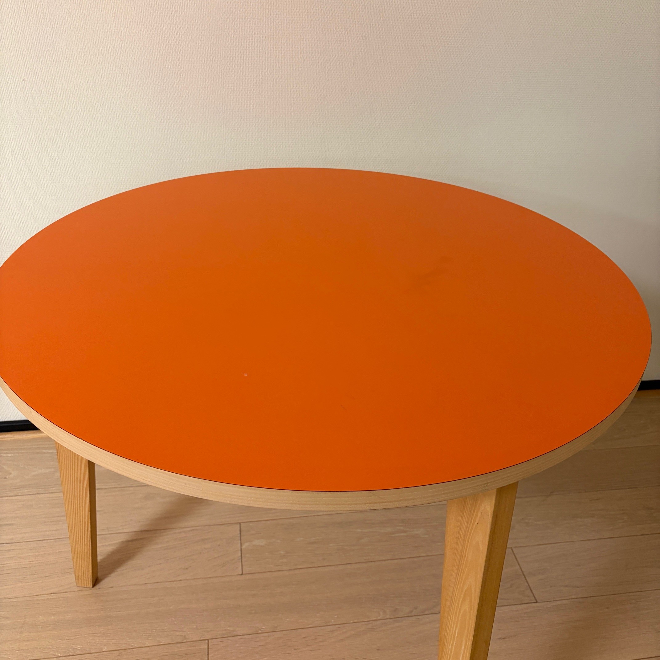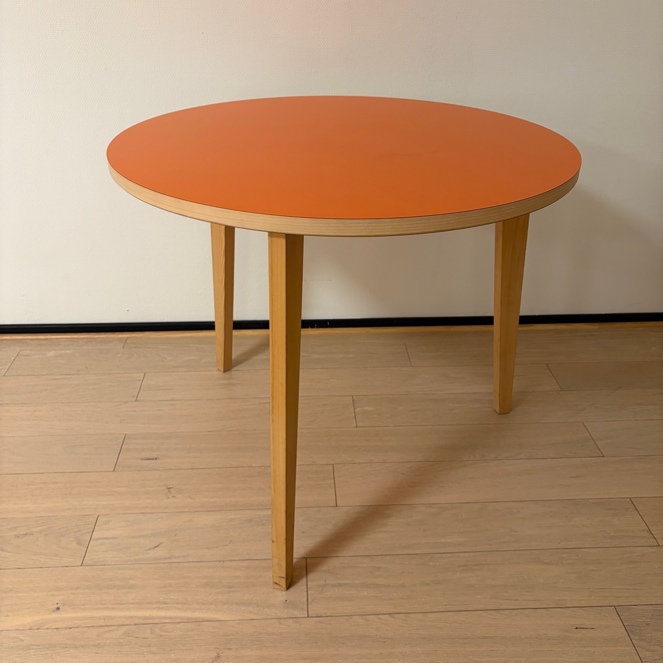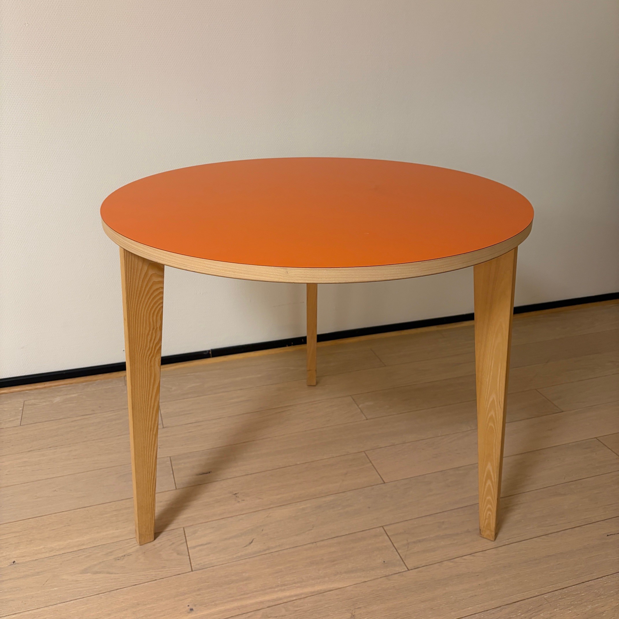 Table top in wood (orange). Base in wood (ash).