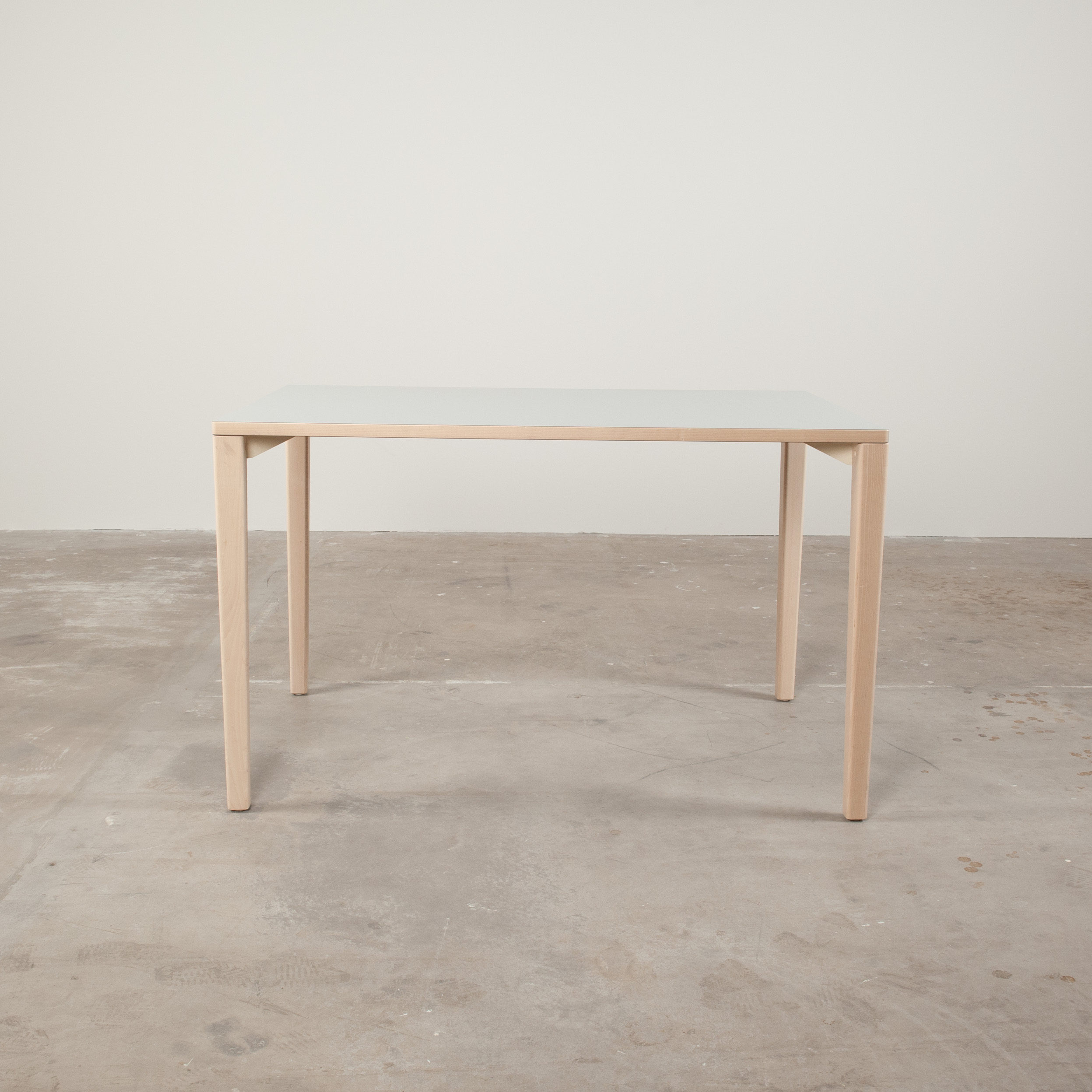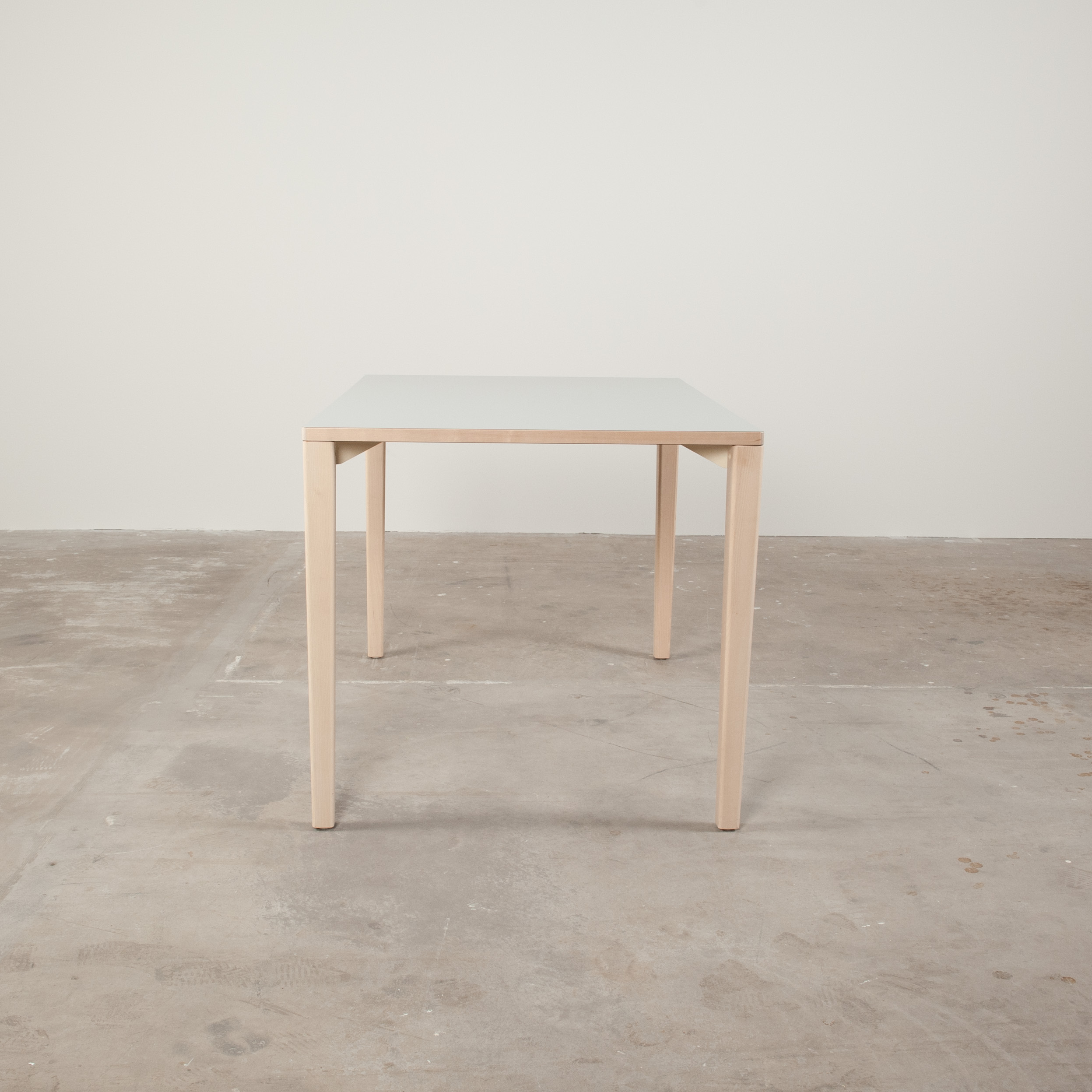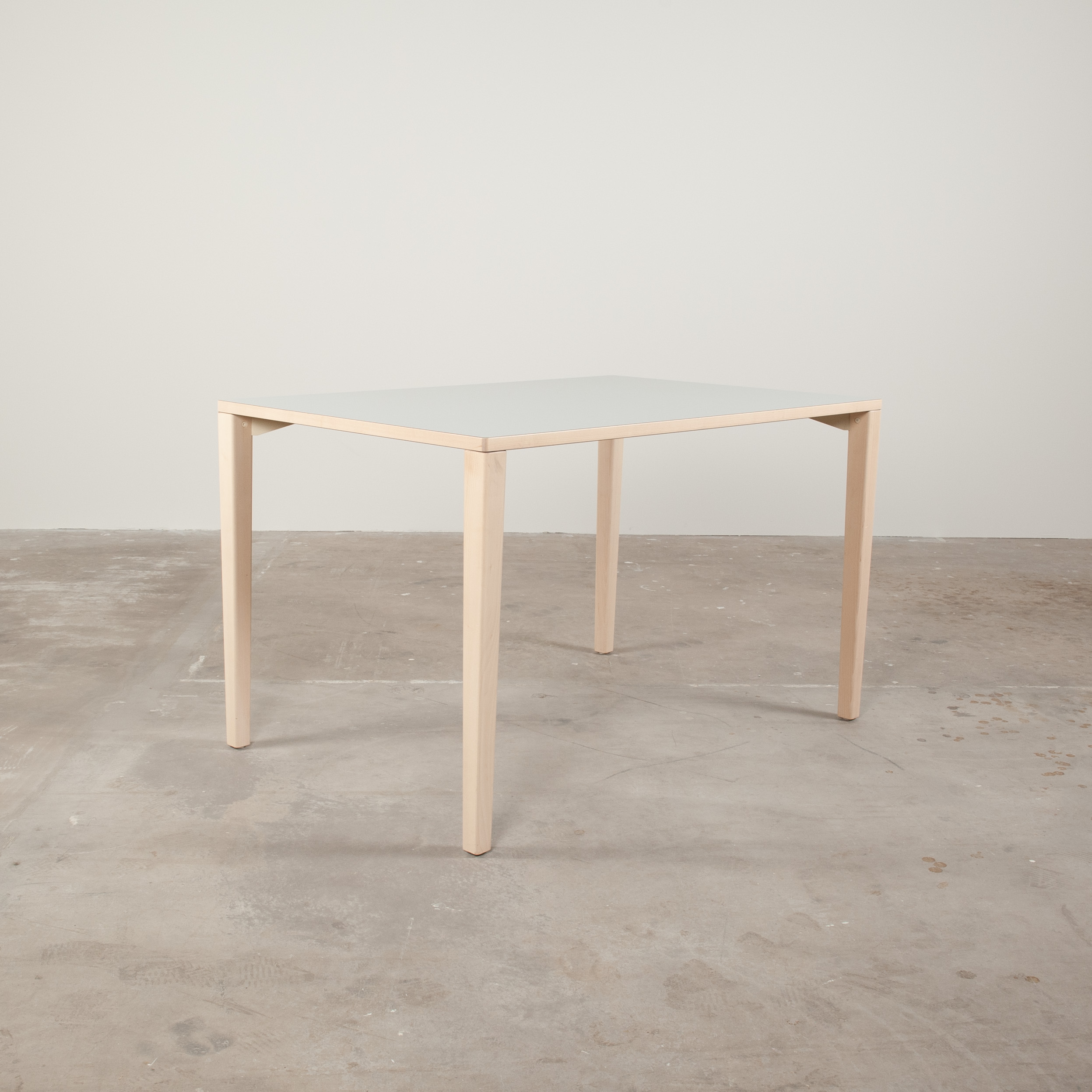 Table top in laminat (grey). Base in wood (birch).
