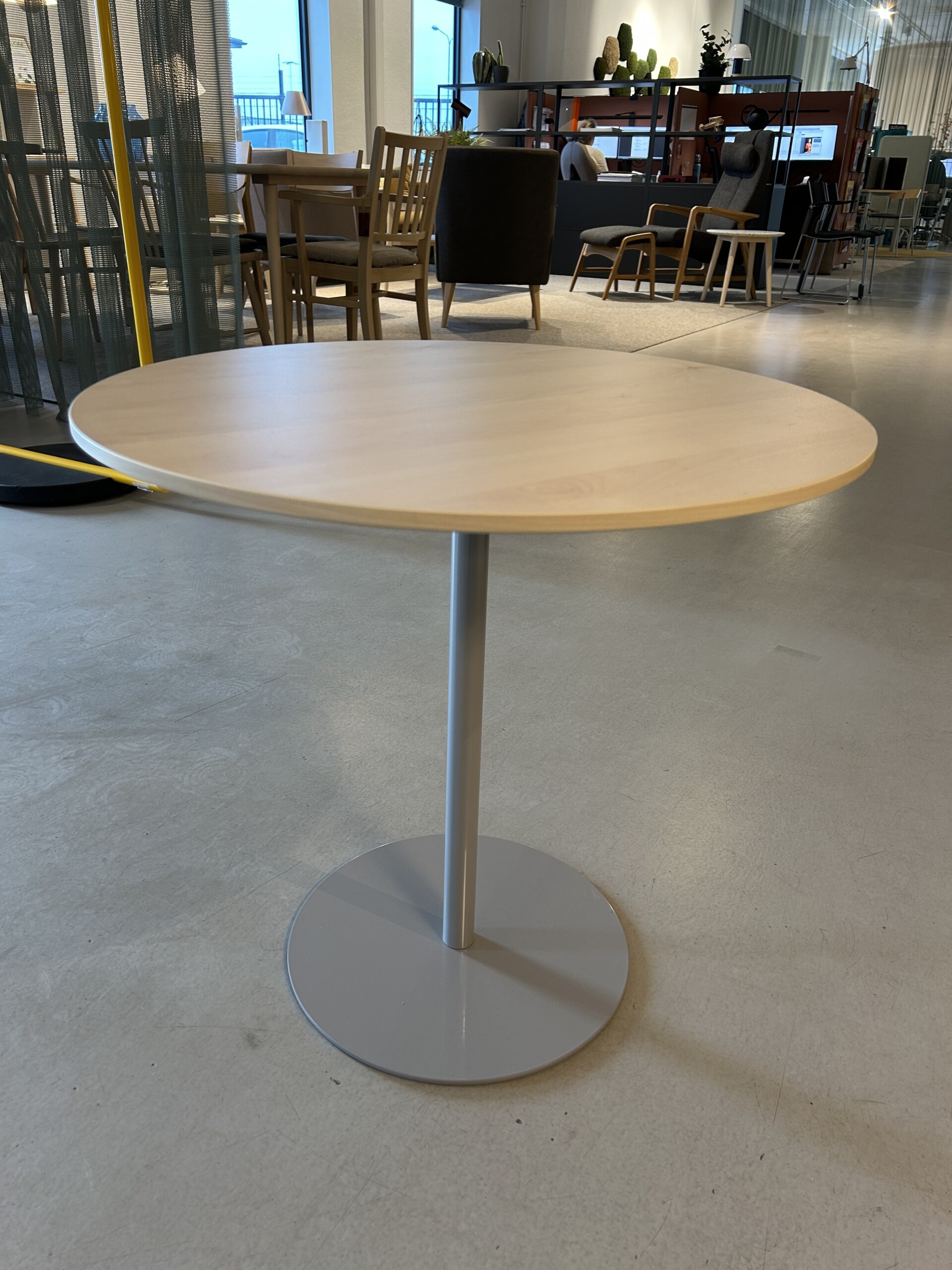 Table top in laminat (birch). Base in metal (silver). Adjustable height.