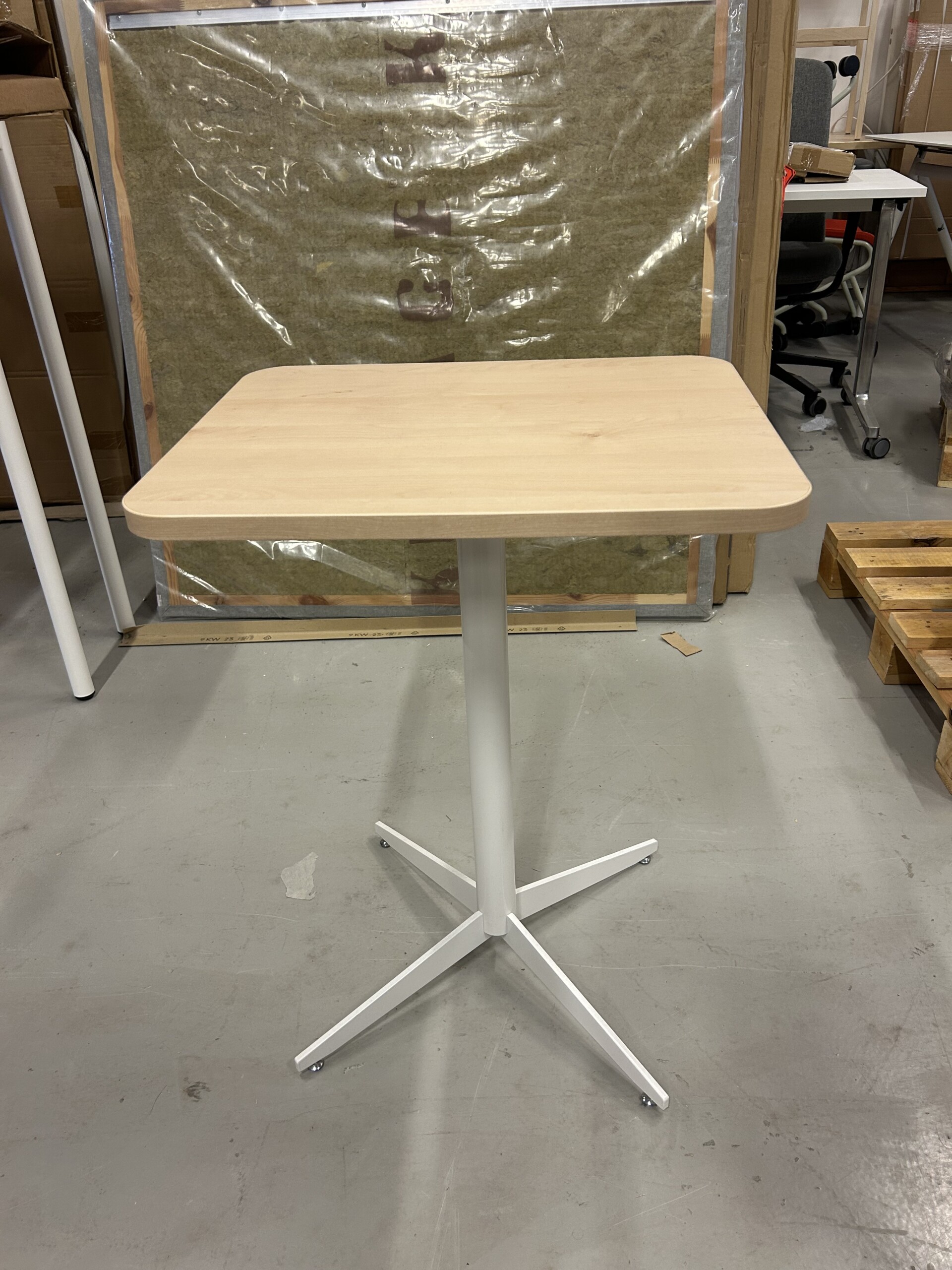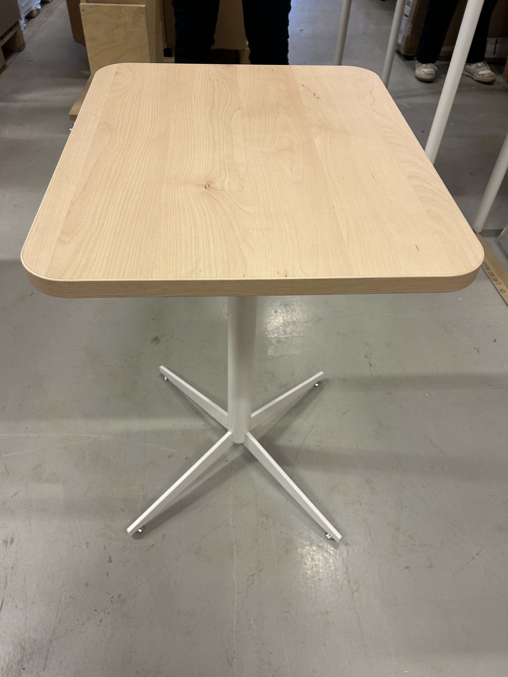 Table top in laminat (birch). Base in metal (white).