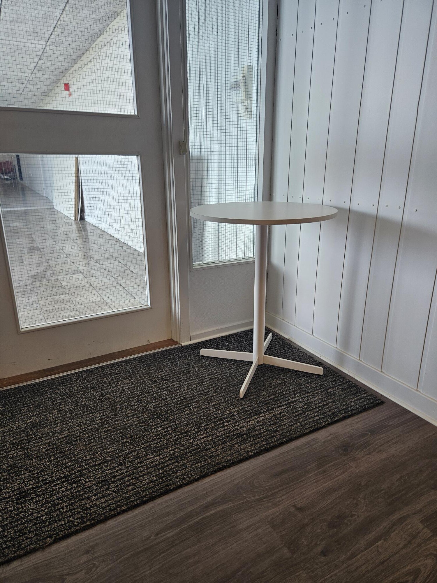 Table top in laminat (white). Base in metal (white).