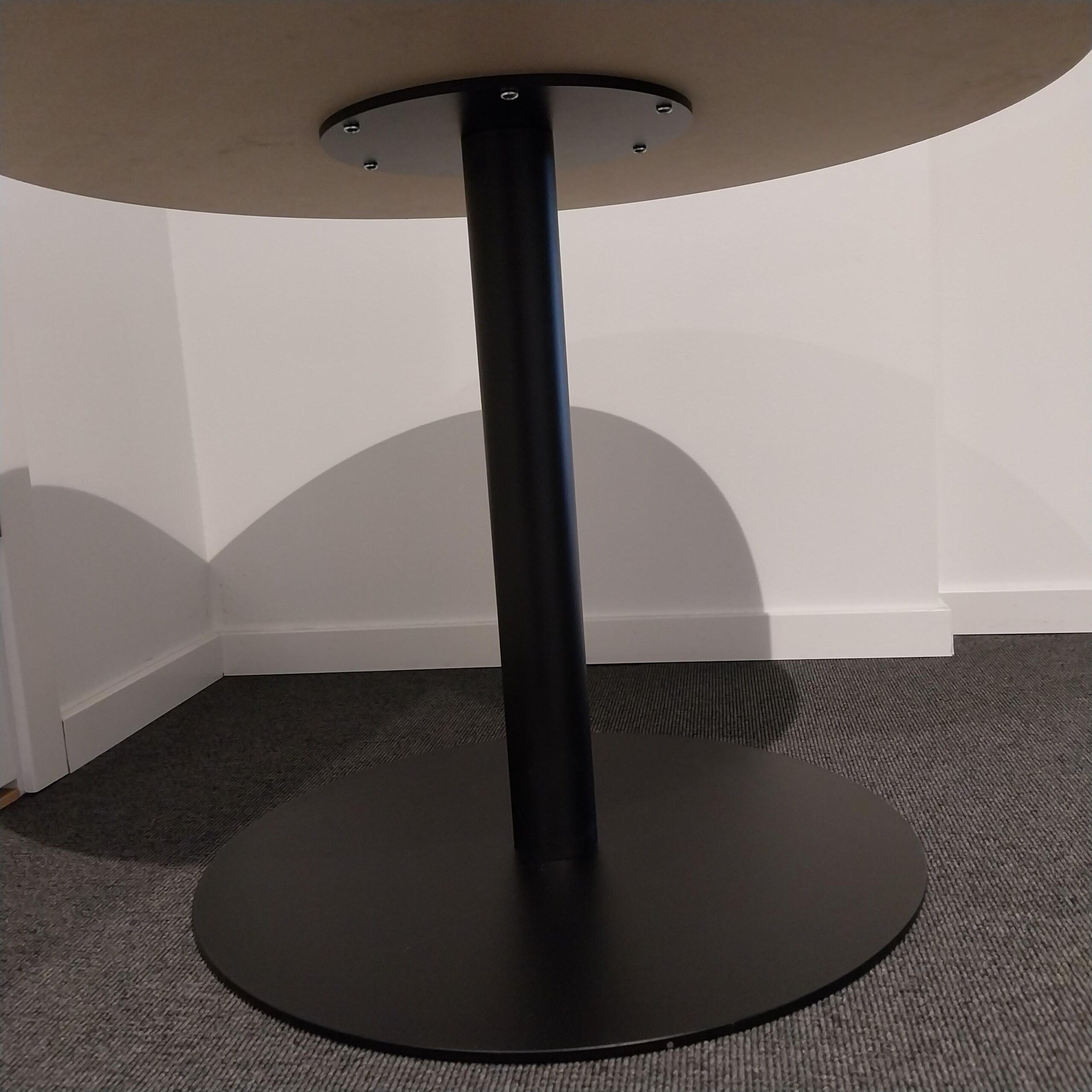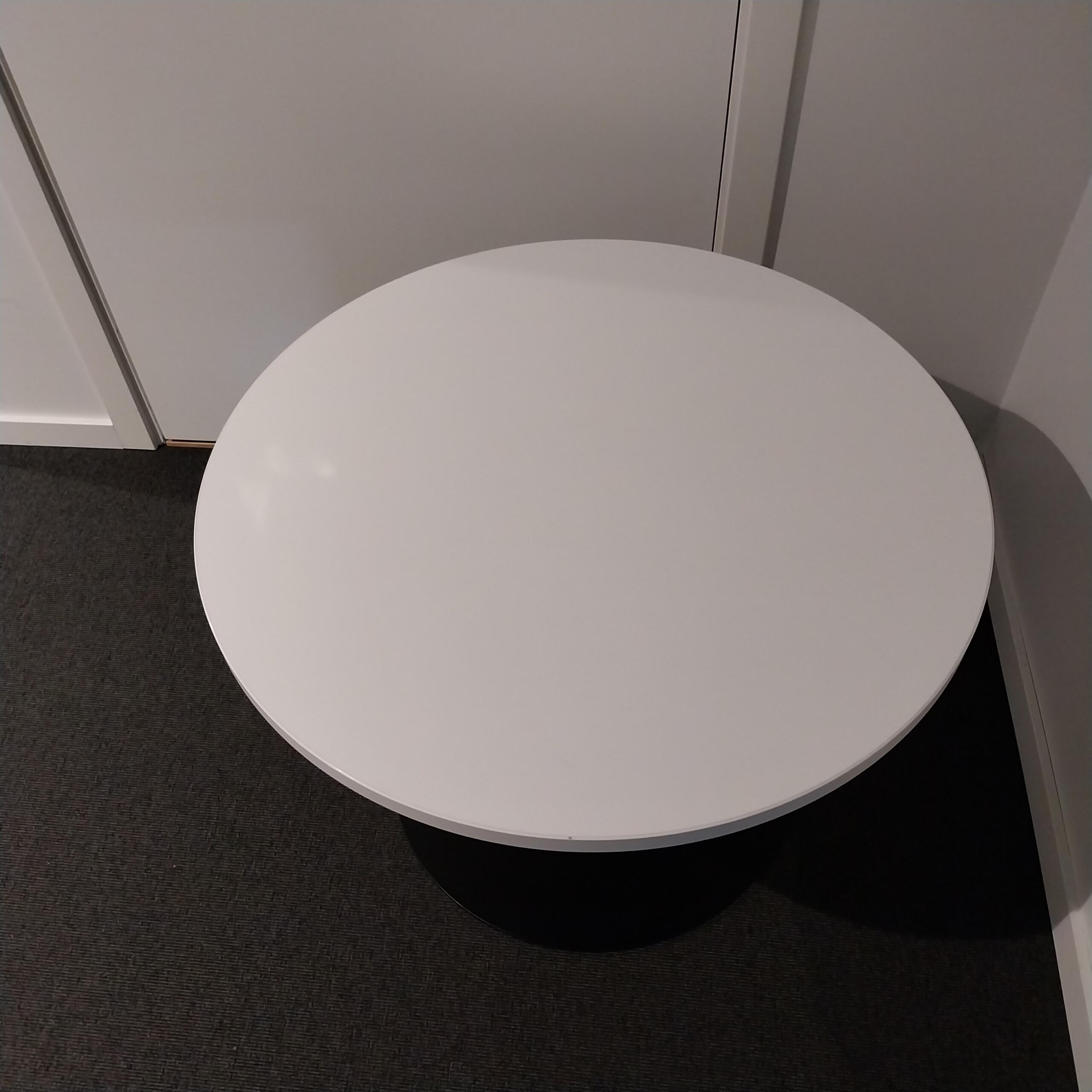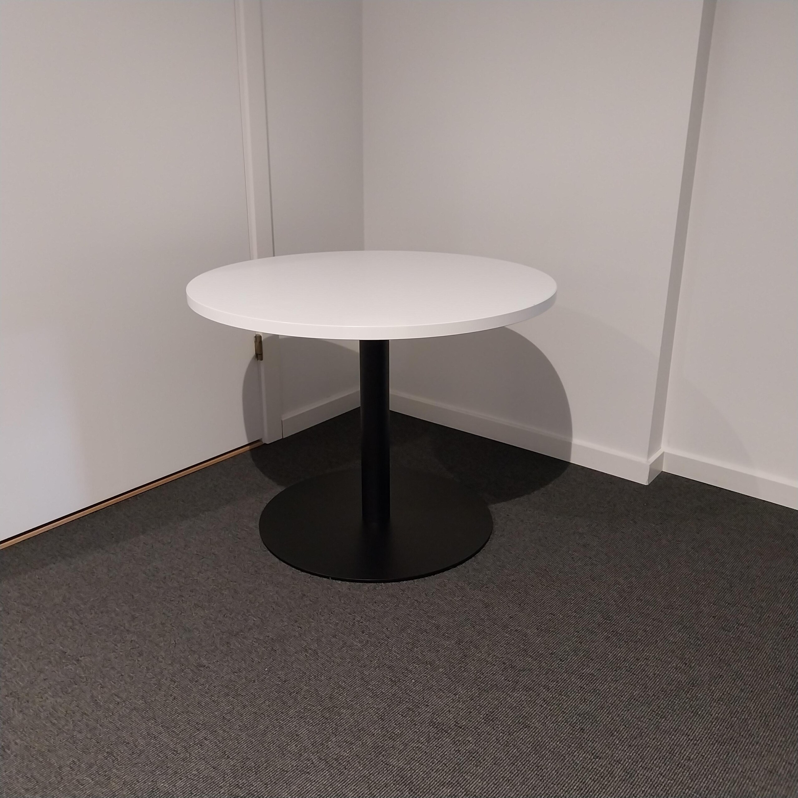 Table top in laminat (white). Base in metal (black).