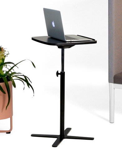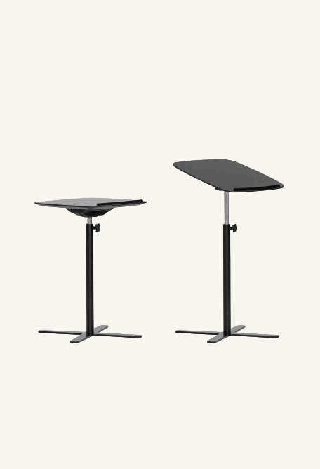 Table top in laminat (black). Base in metal (black). Adjustable height.