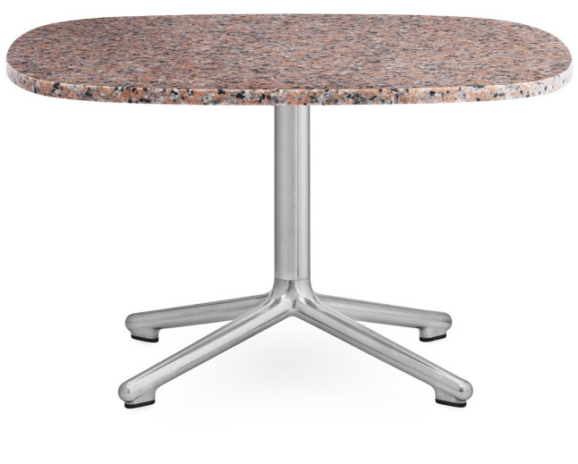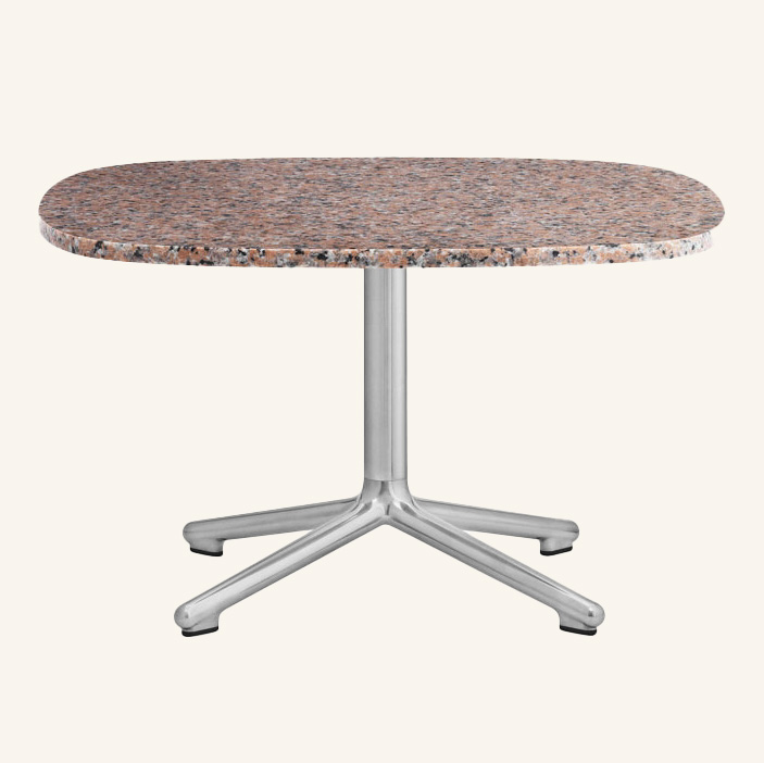 Table top in stone. Base in metal (aluminium).