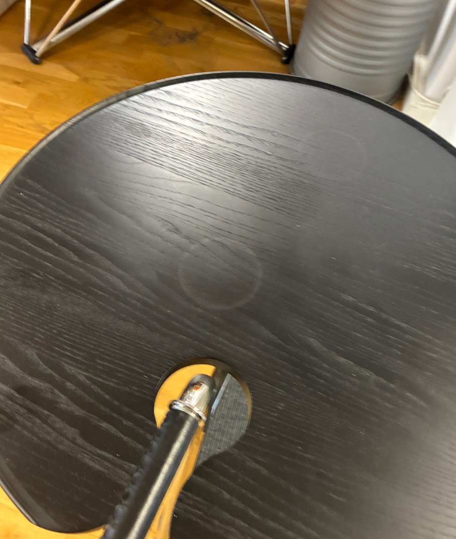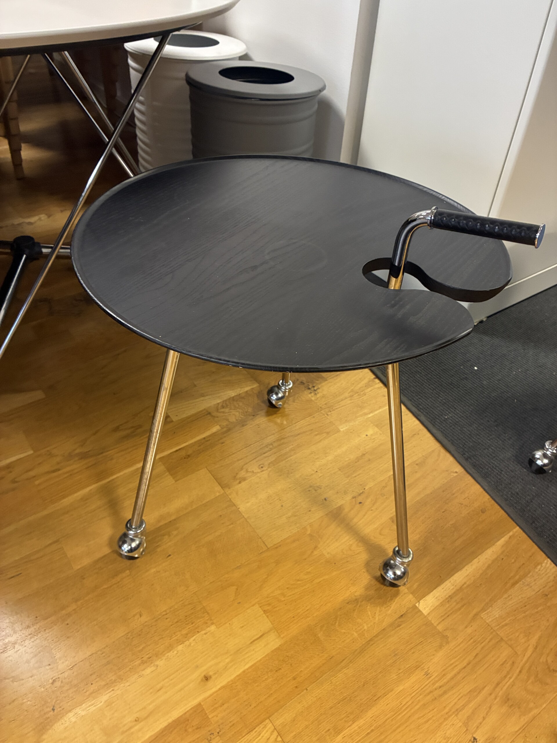 Table top in wood (black). Base in metal (chrome).
