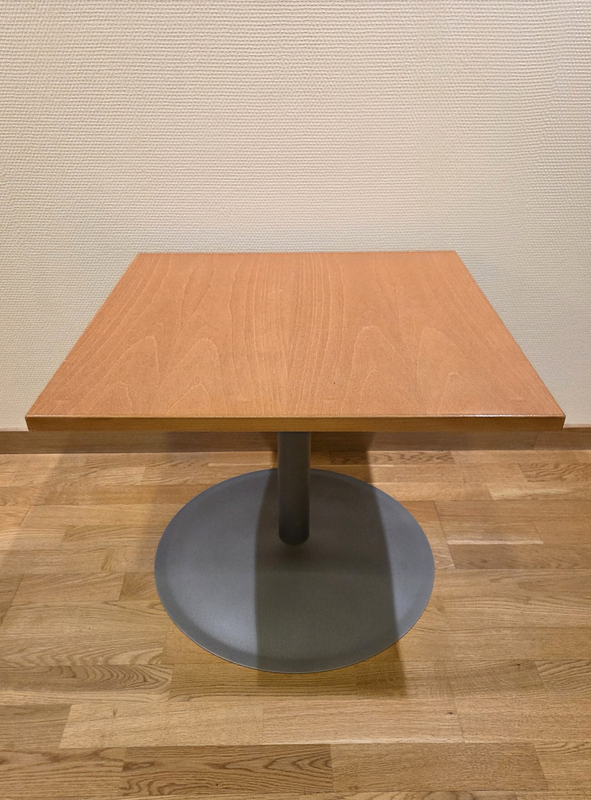 Table top in wood. Base in metal (grey).