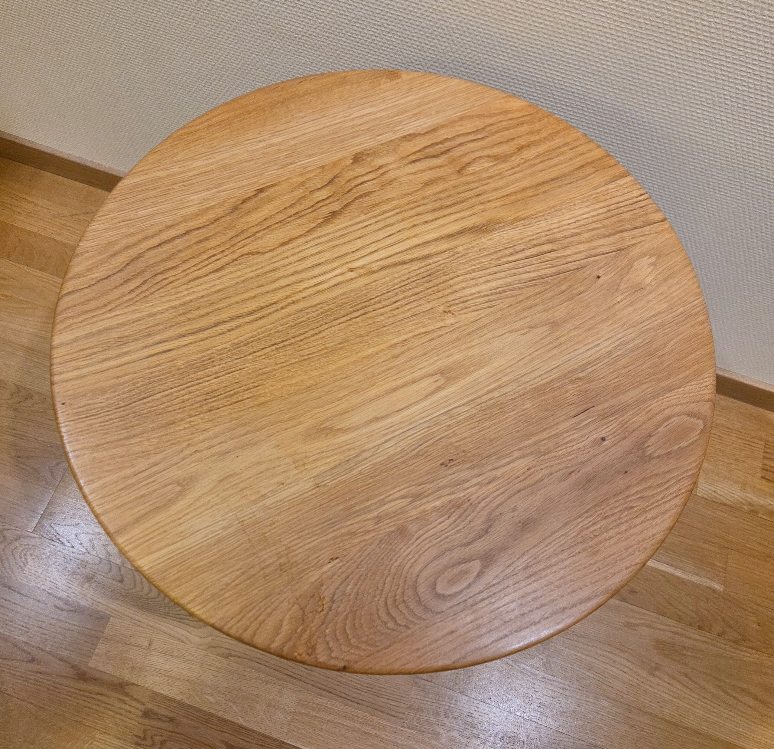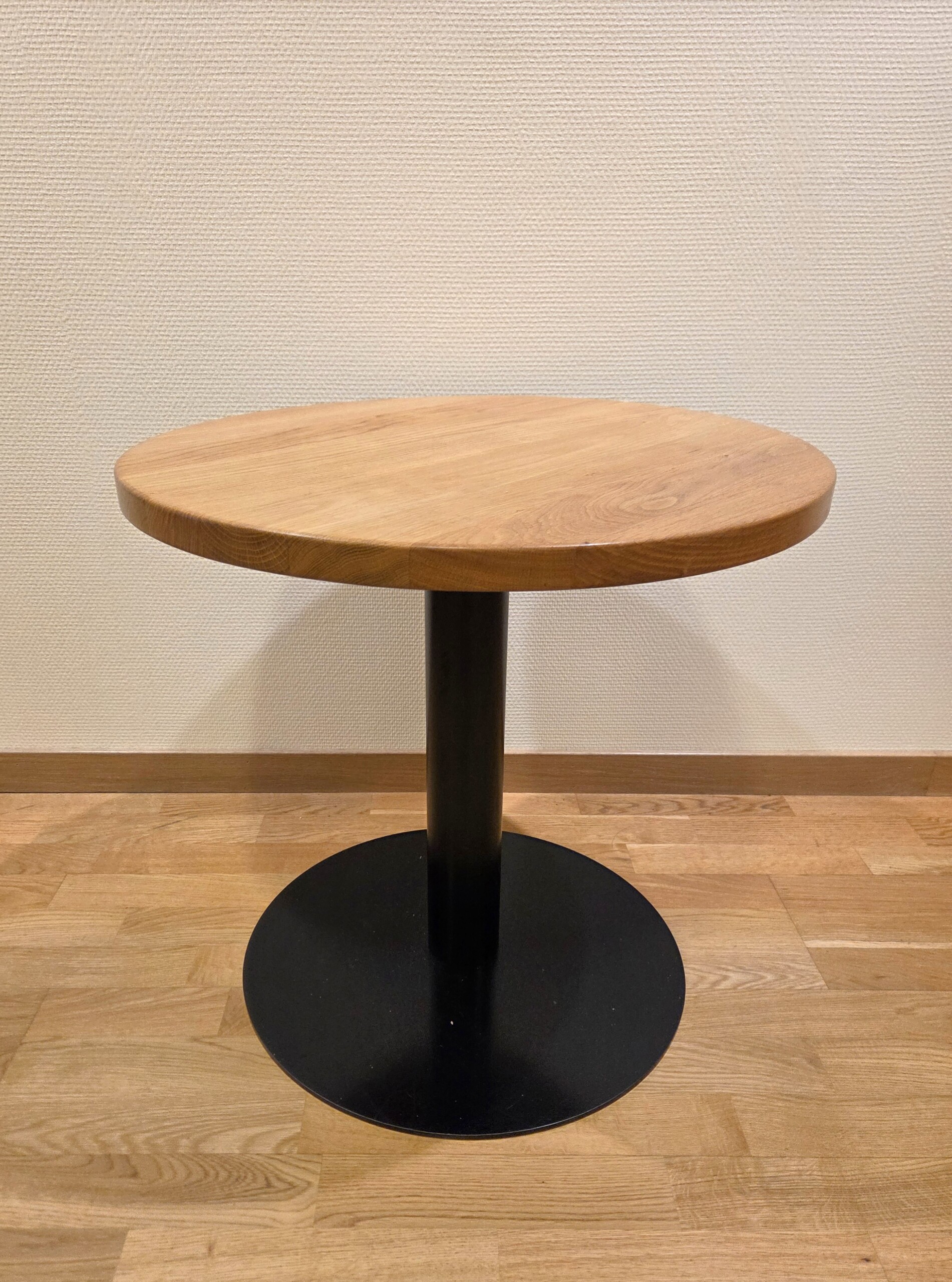 Table top in wood (oak). Base in metal (black).