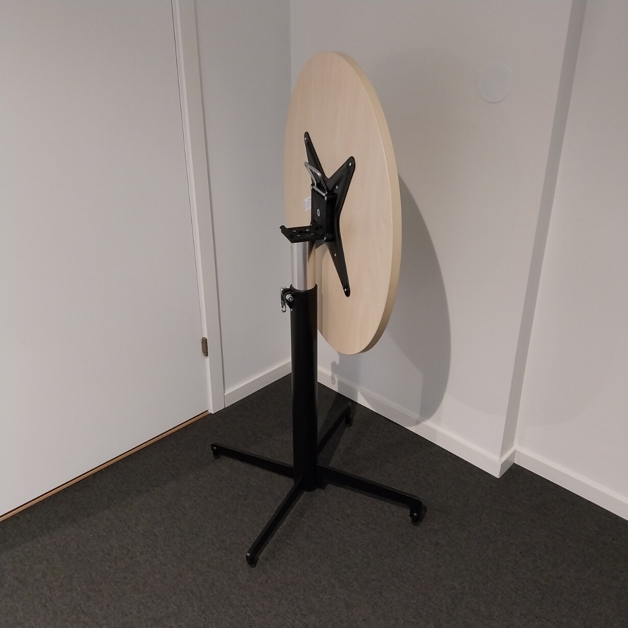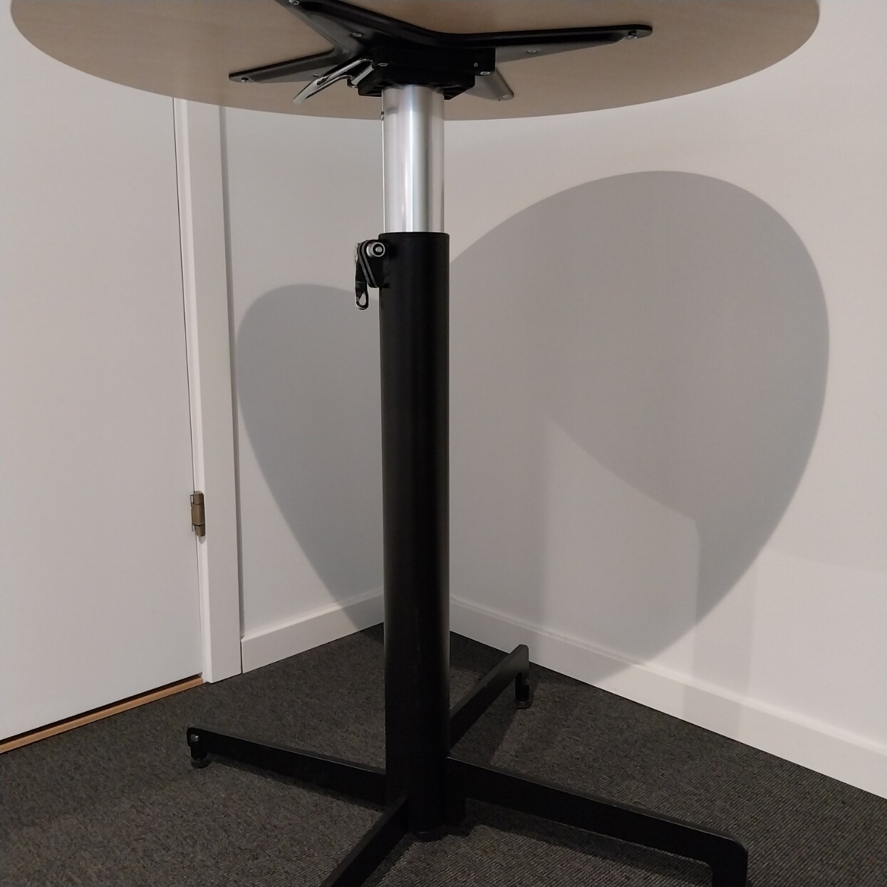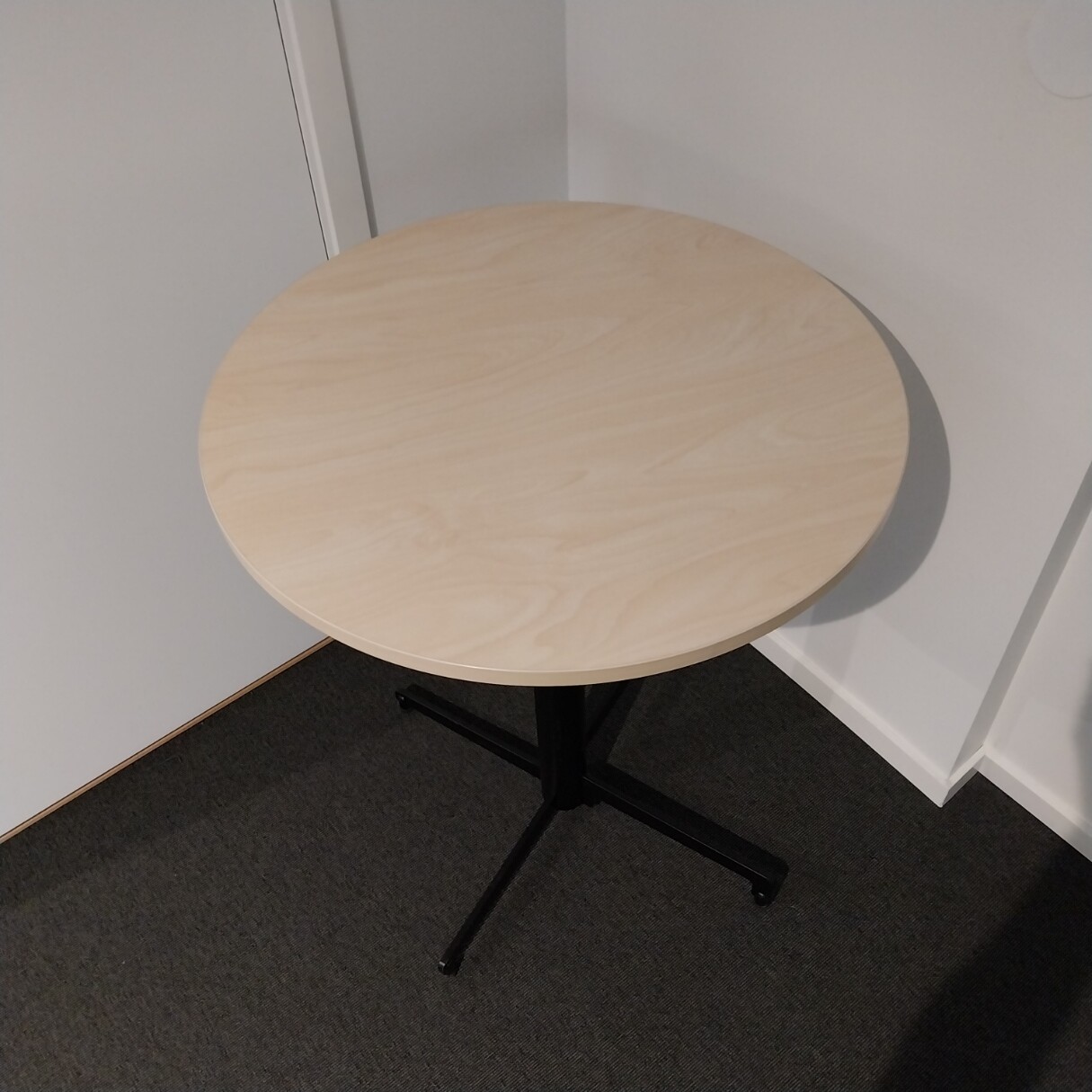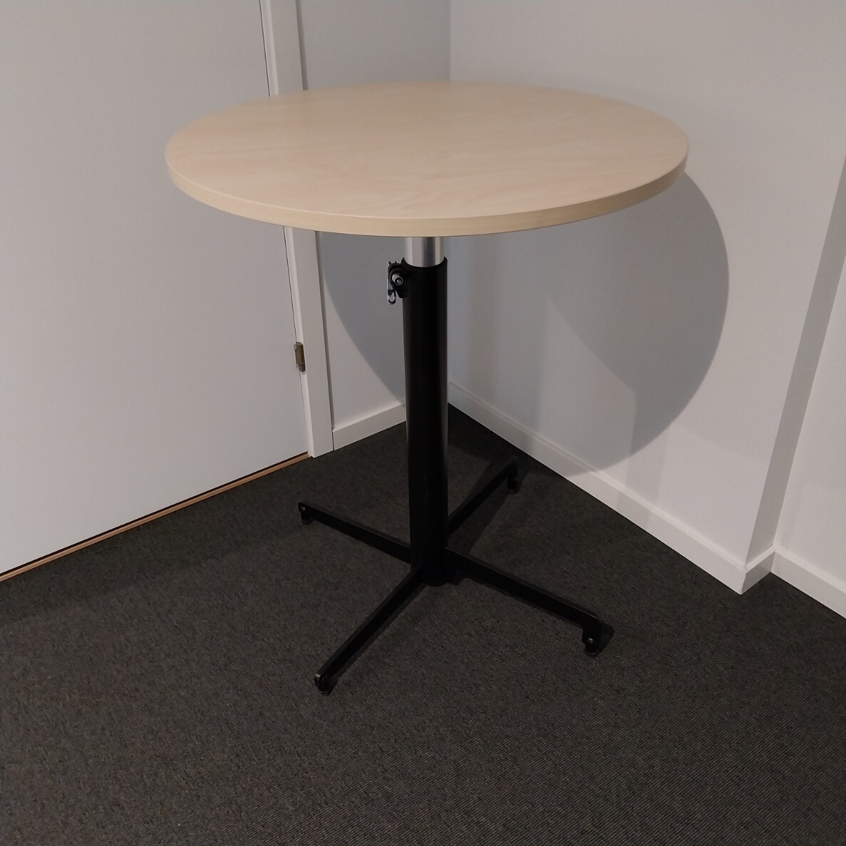 Table top in laminat (birch). Base in metal (black). Adjustable height.
