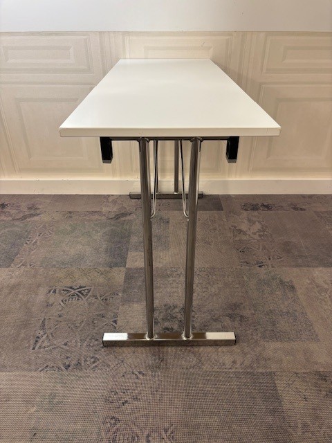 Table top in laminat (white). Base in metal (chrome).