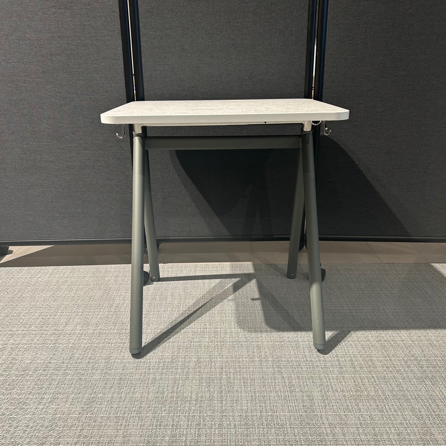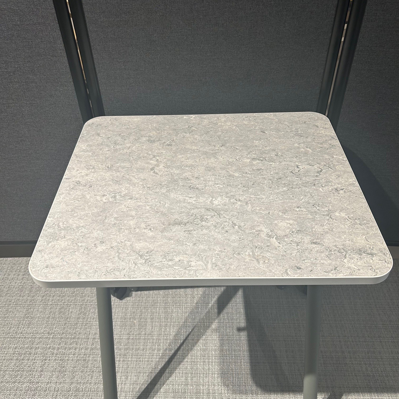 Table top in linoleum (grey). Base in metal (grey). Adjustable height.