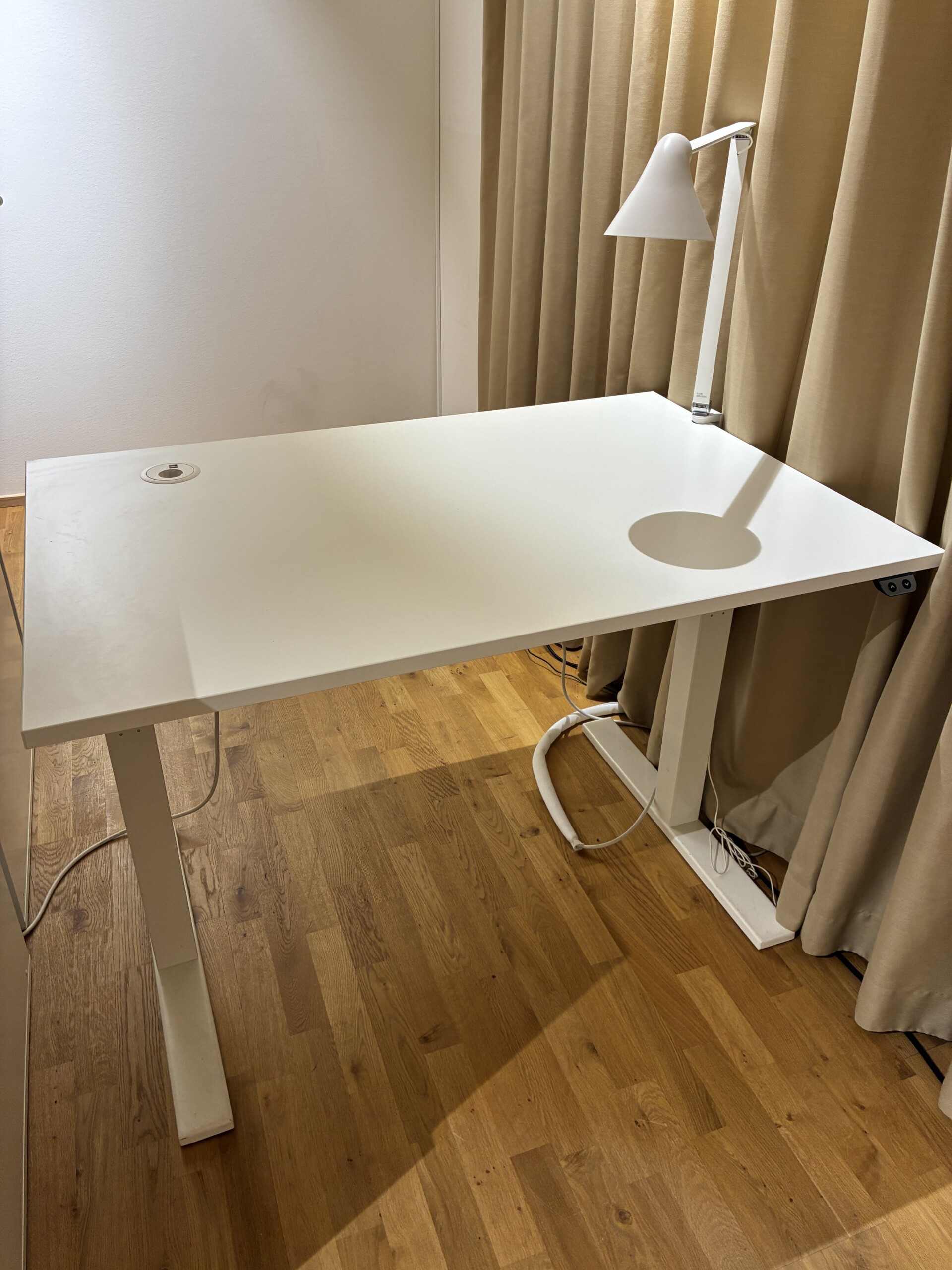 Table top in laminat (white). Base in metal (white). Adjustable height.
