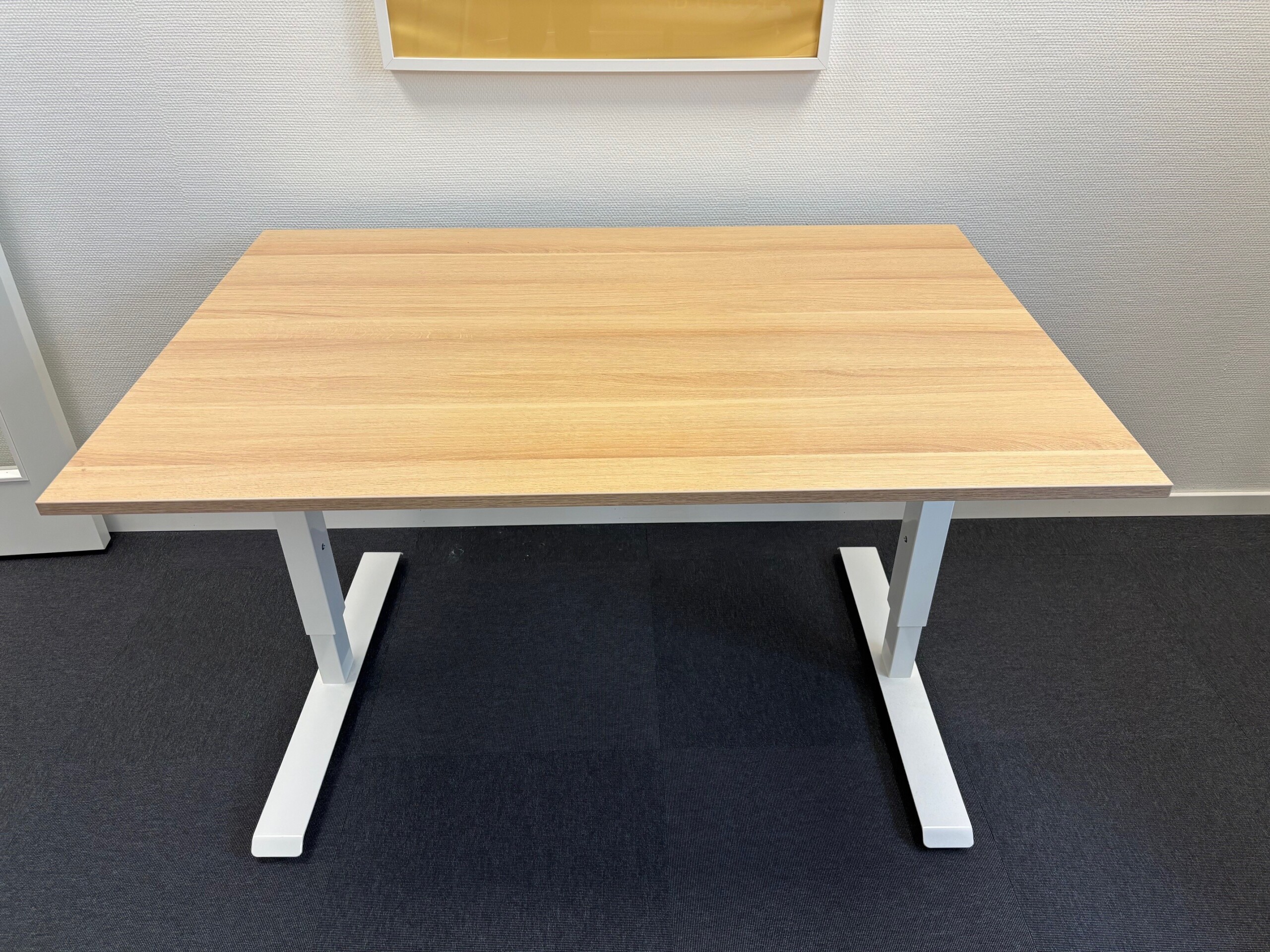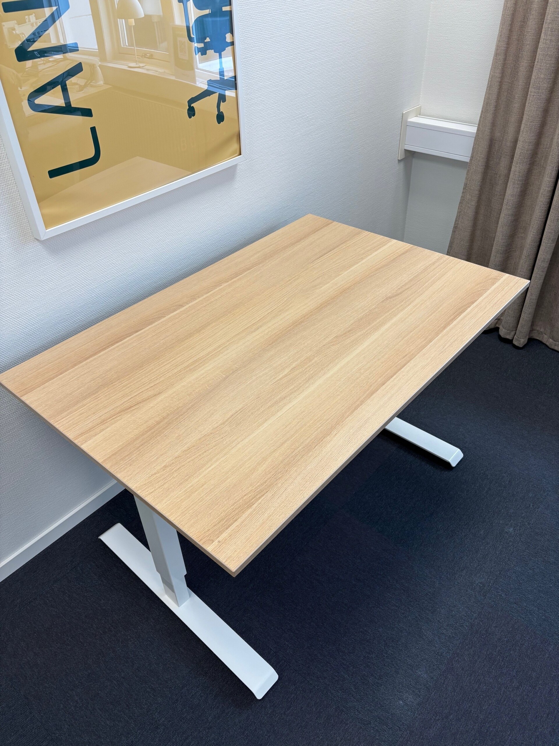 Table top in laminat (oak). Base in metal (white). Adjustable height.