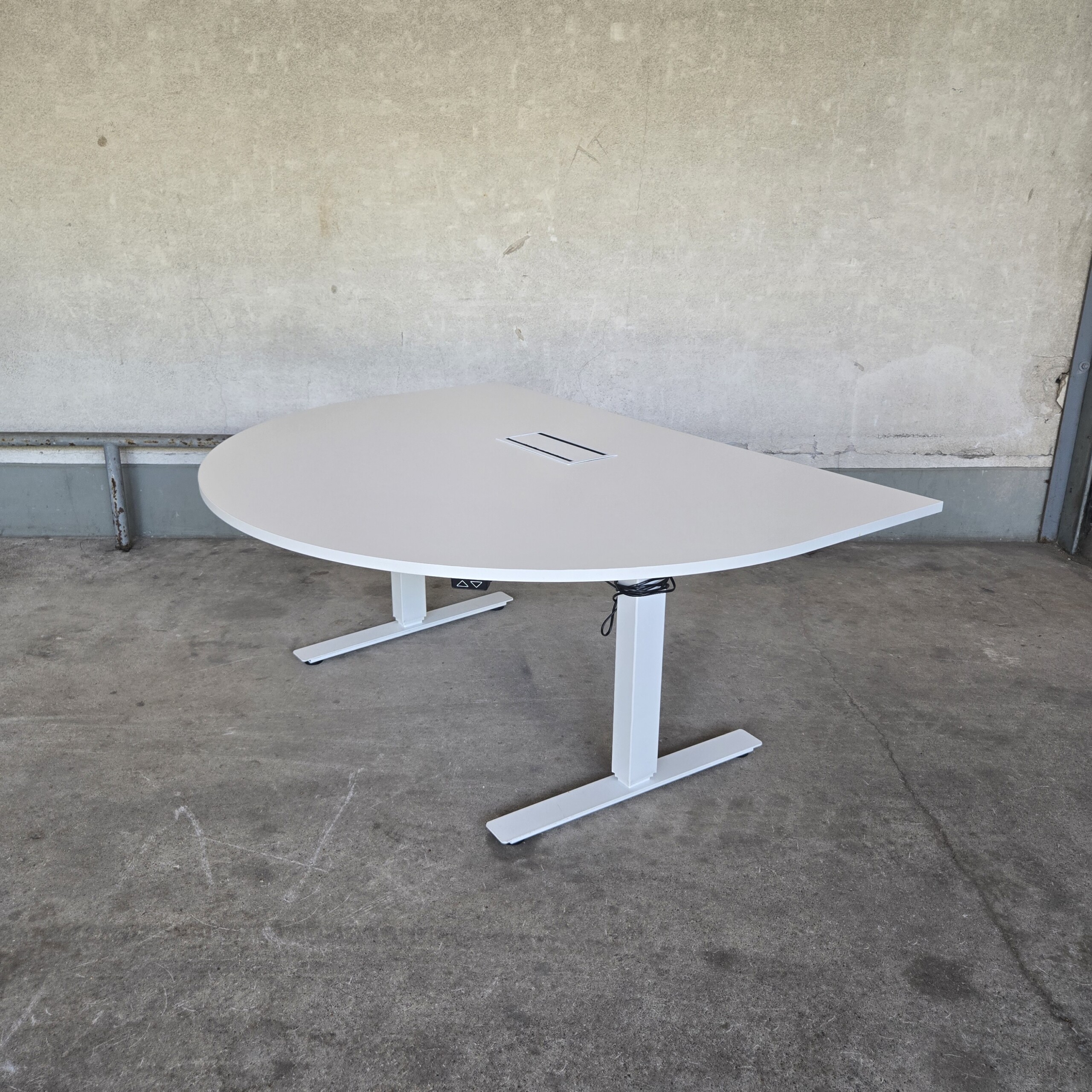 Table top in laminat (white). Base in metal (white). Adjustable height.