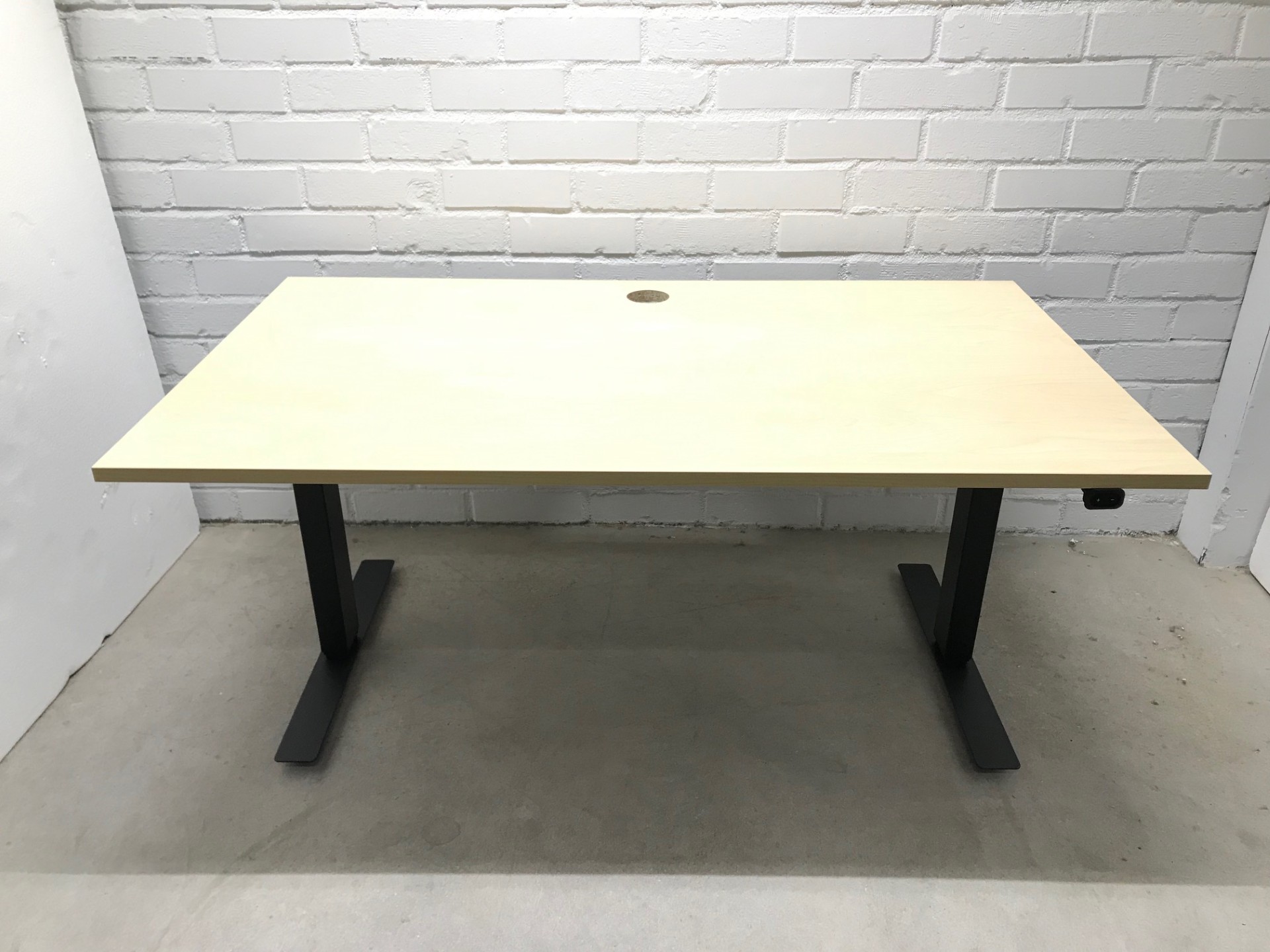 Table top in laminat (birch). Base in metal (black). Adjustable height.