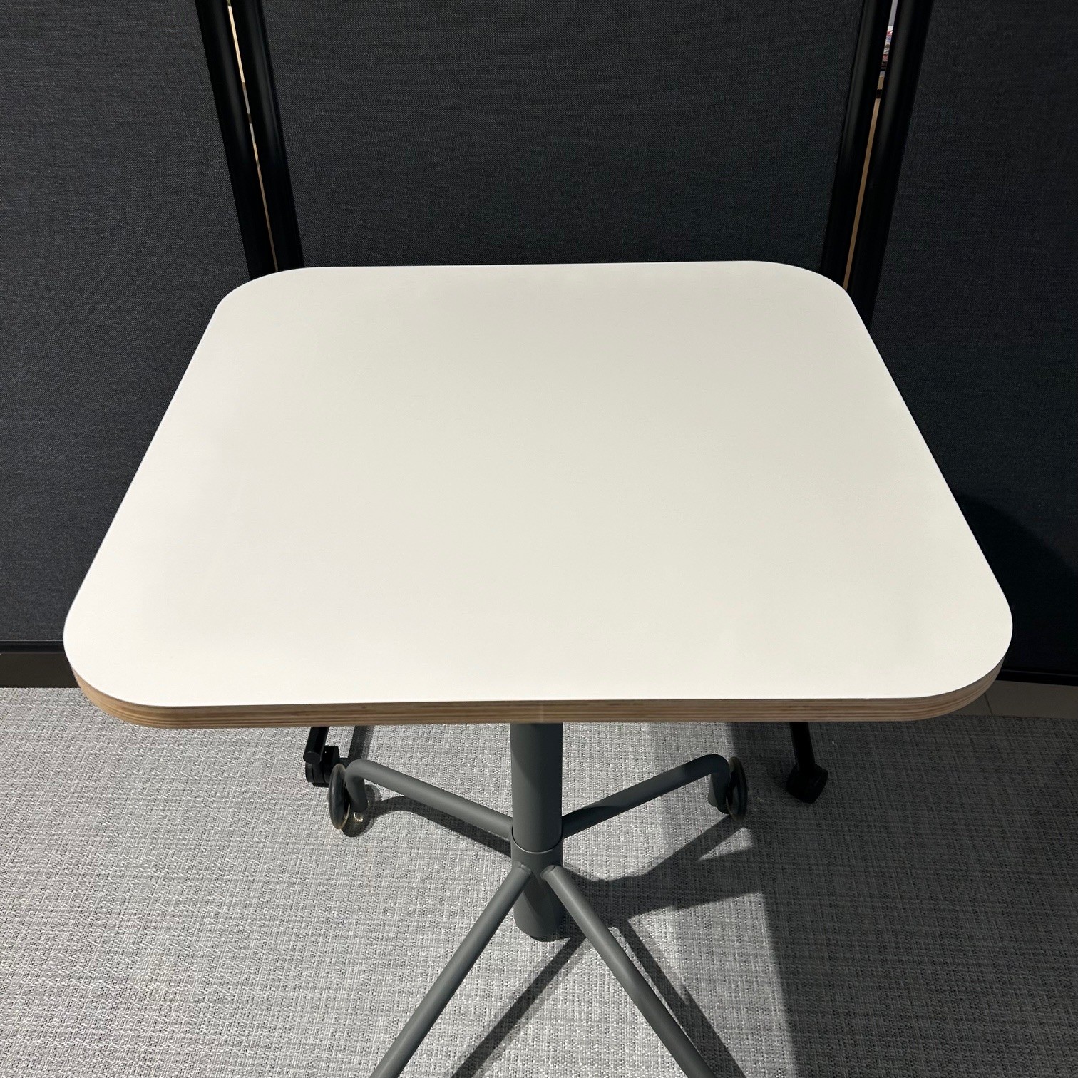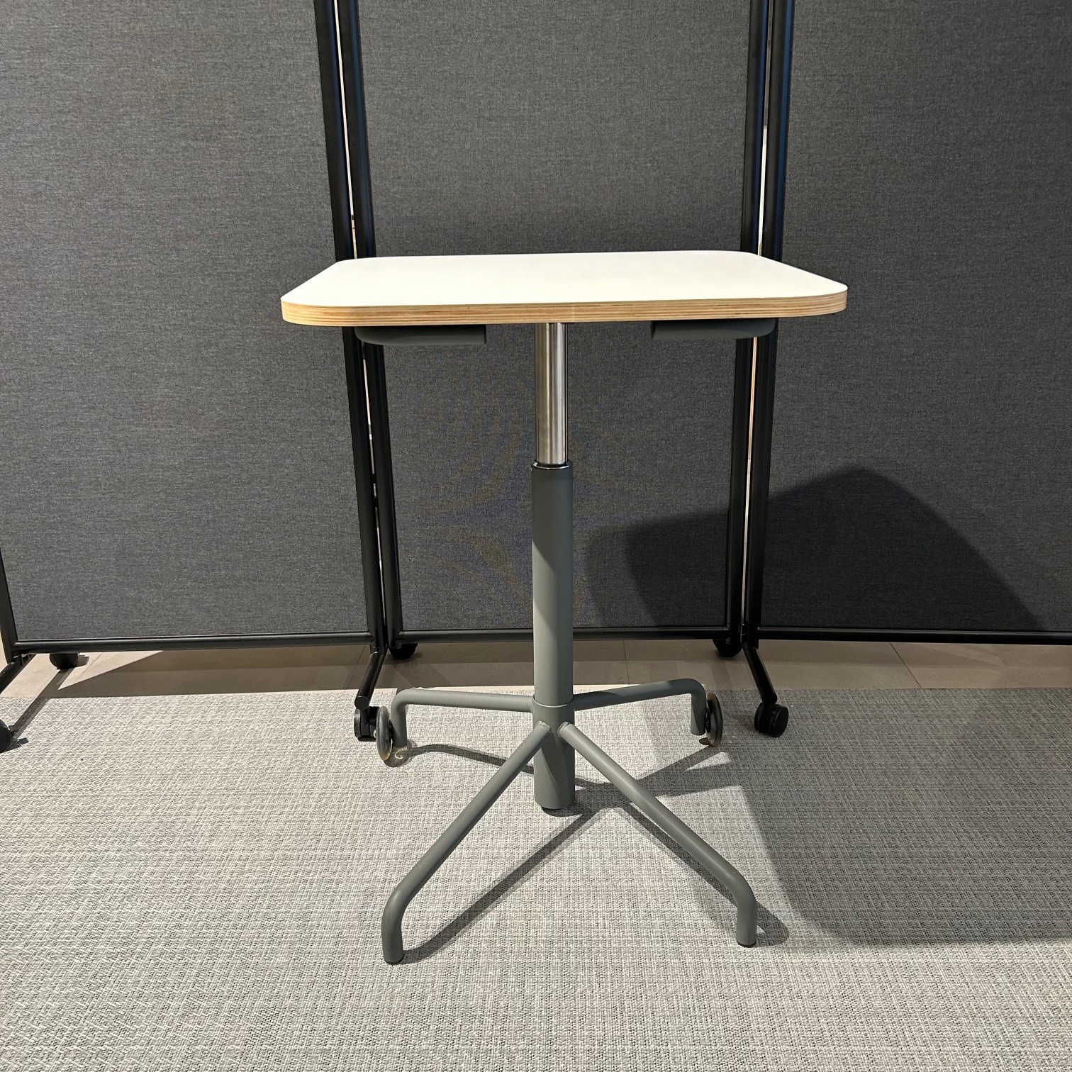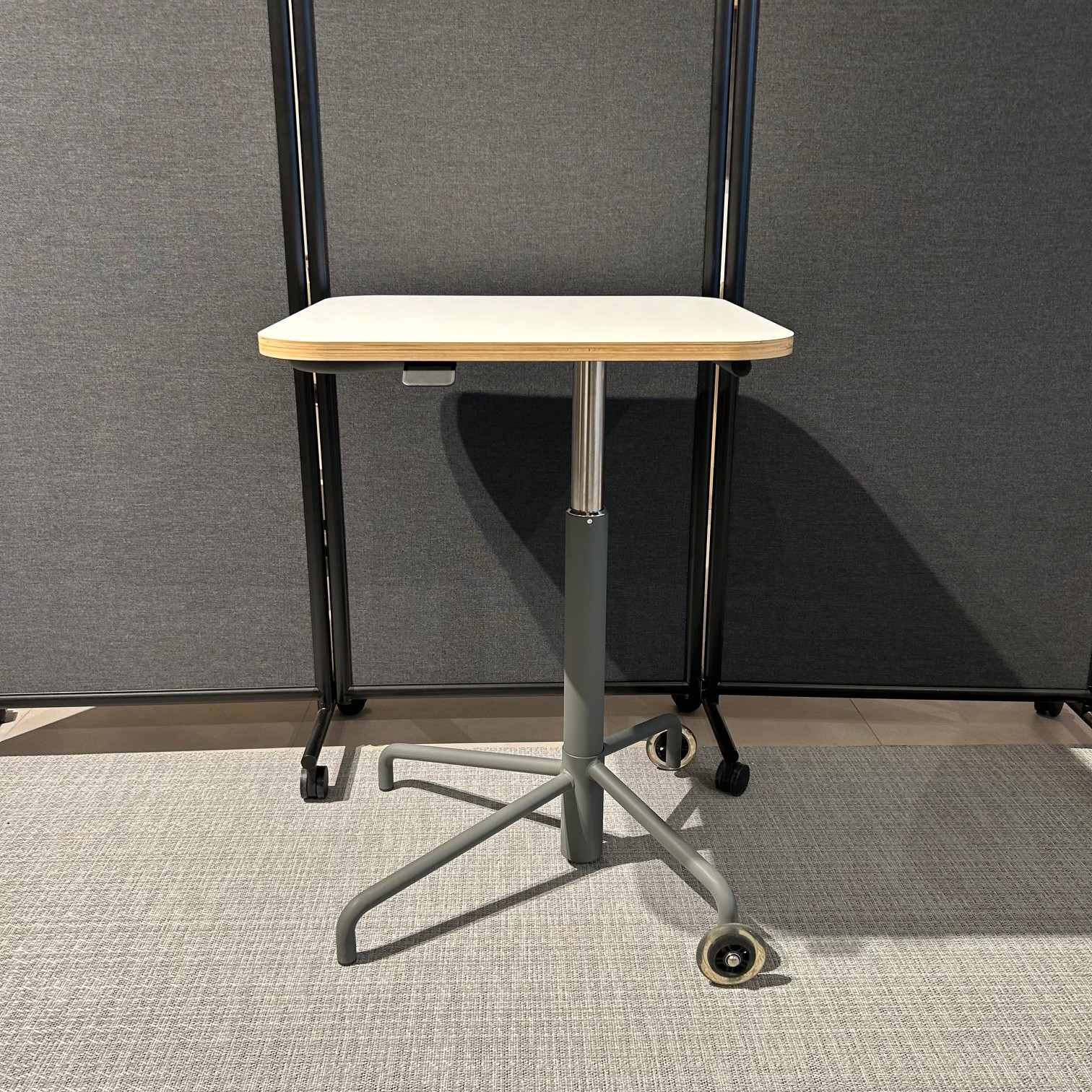Table top in laminat (white). Base in metal (grey). Adjustable height.