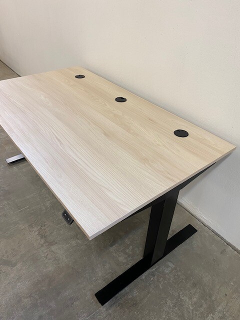 Table top in laminat (ash). Base in metal (black). Adjustable height.