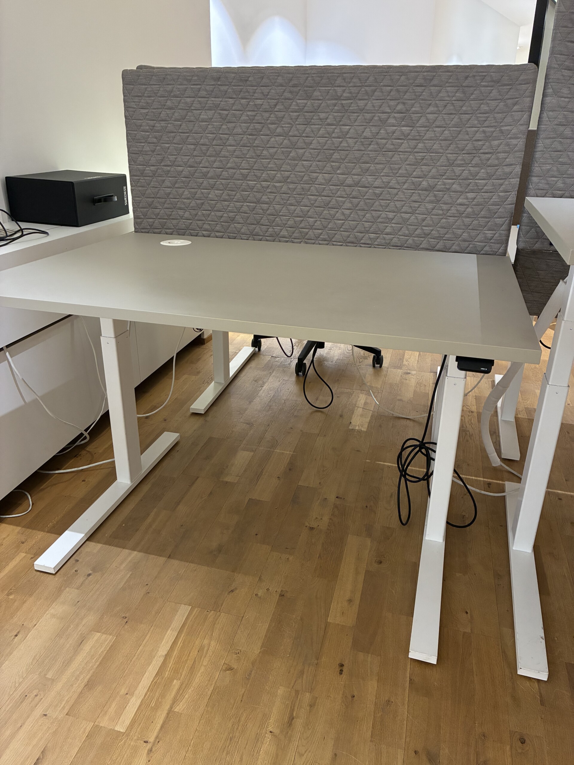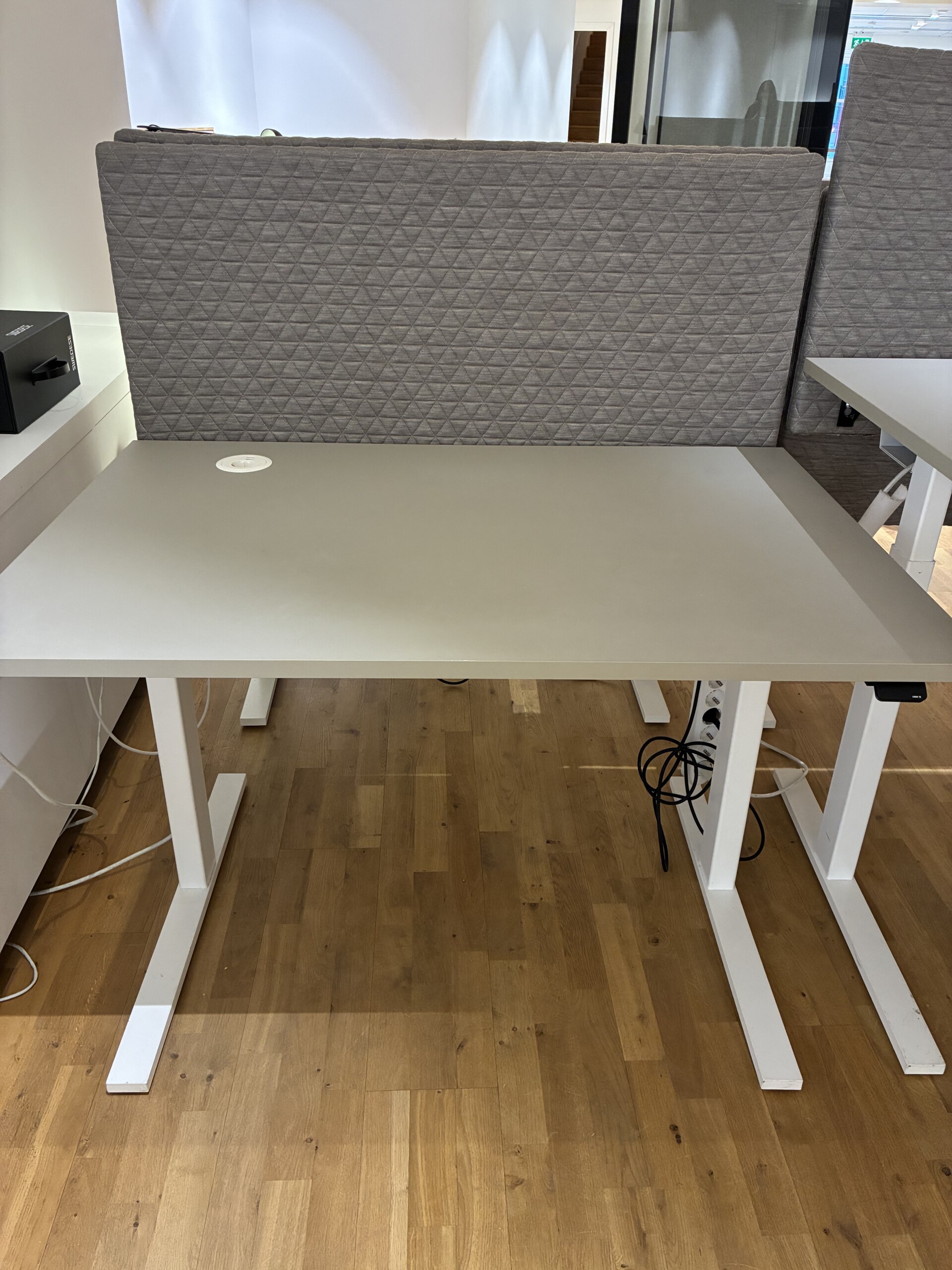 Bordsskärm, kabelränna, uttag.