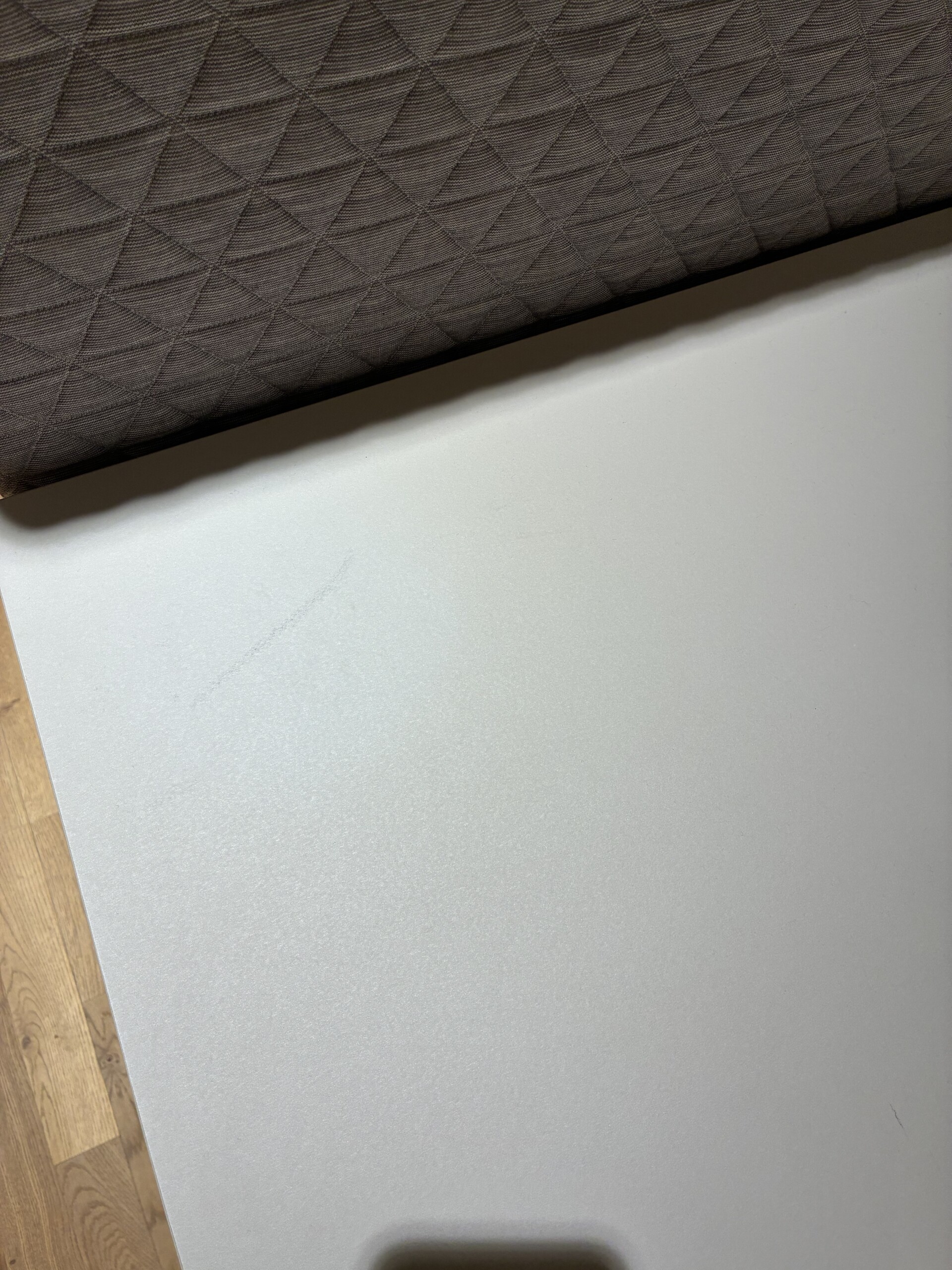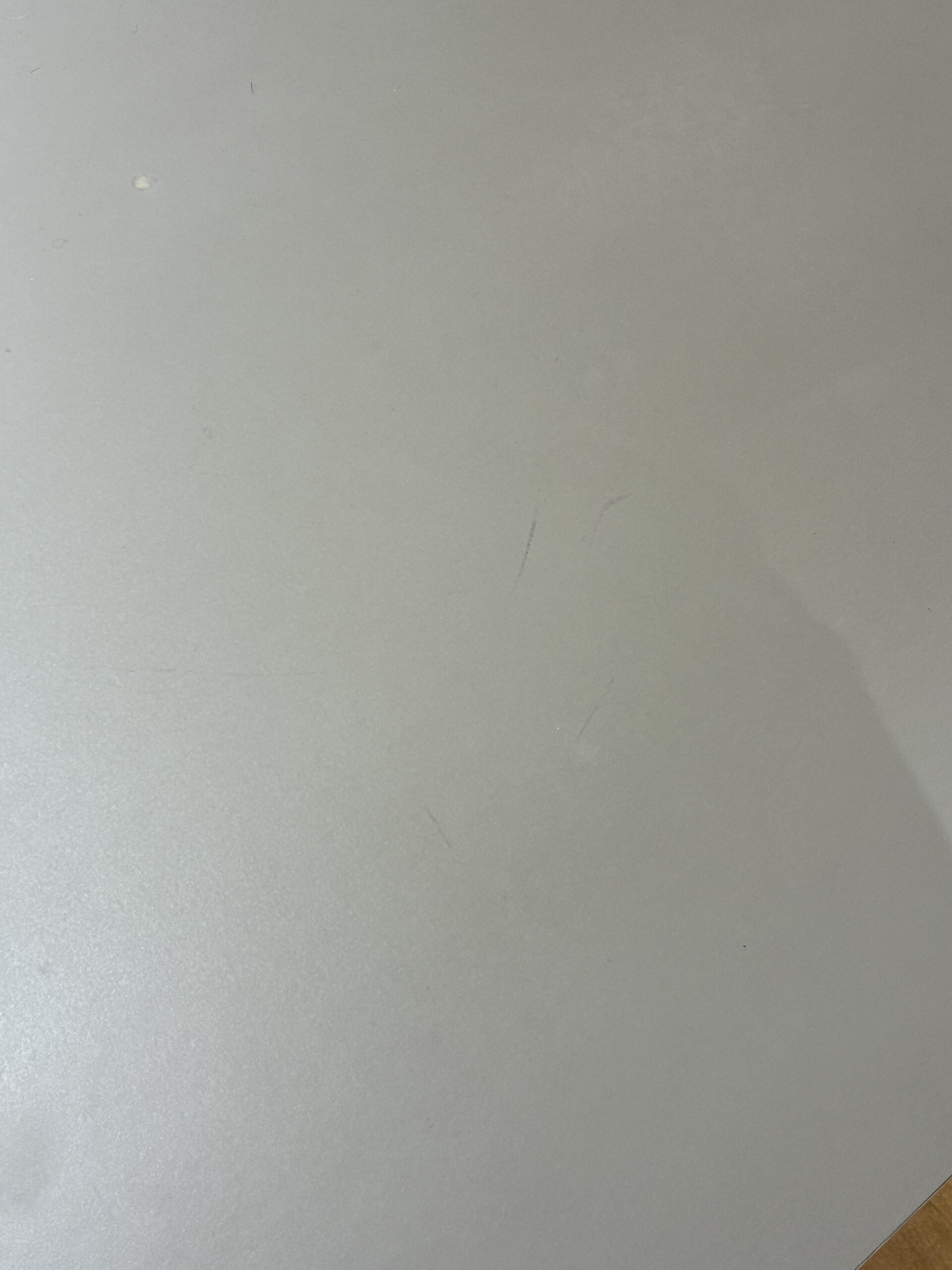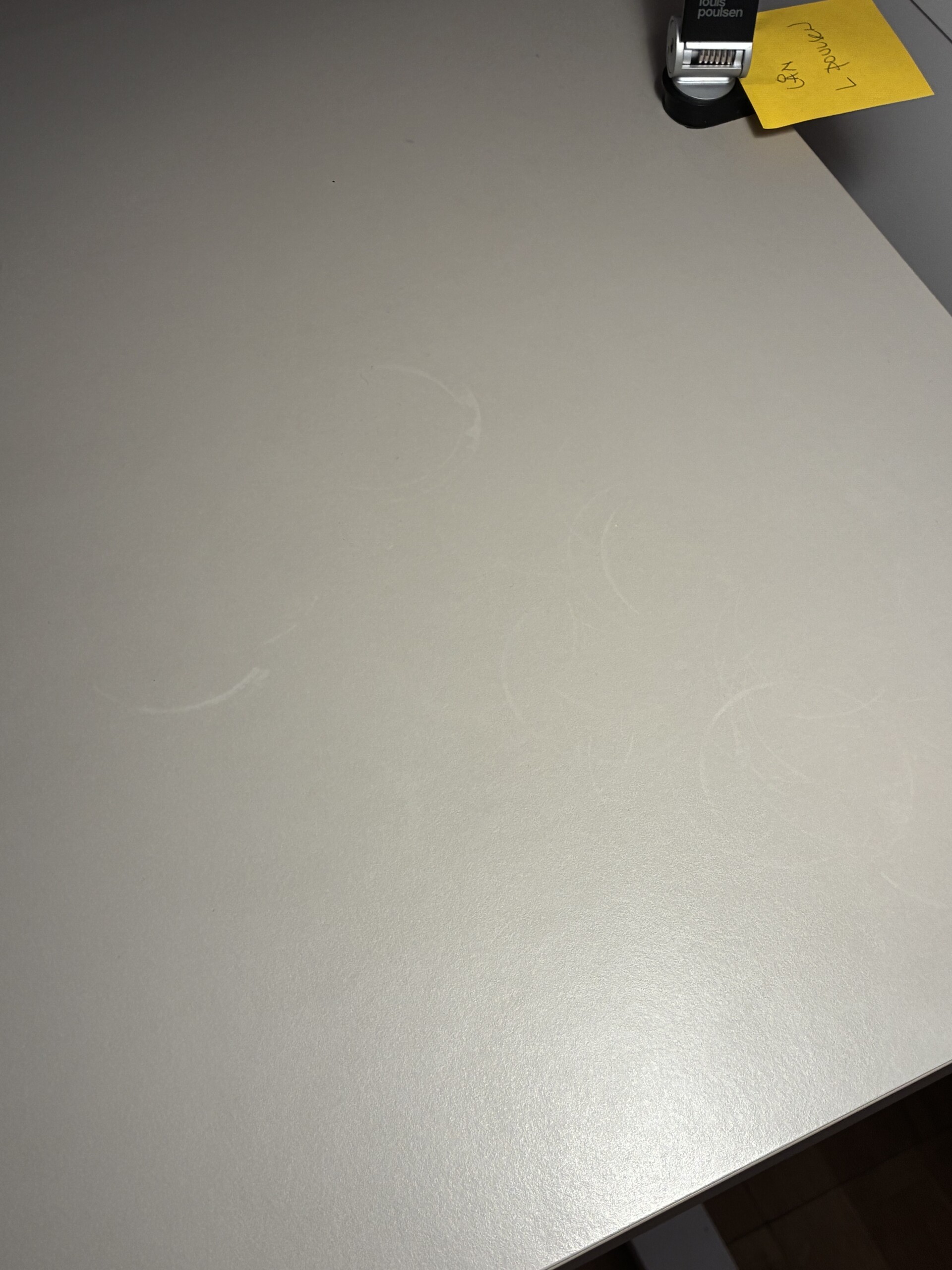Table top in linoleum (grey). Base in metal (white). Adjustable height.