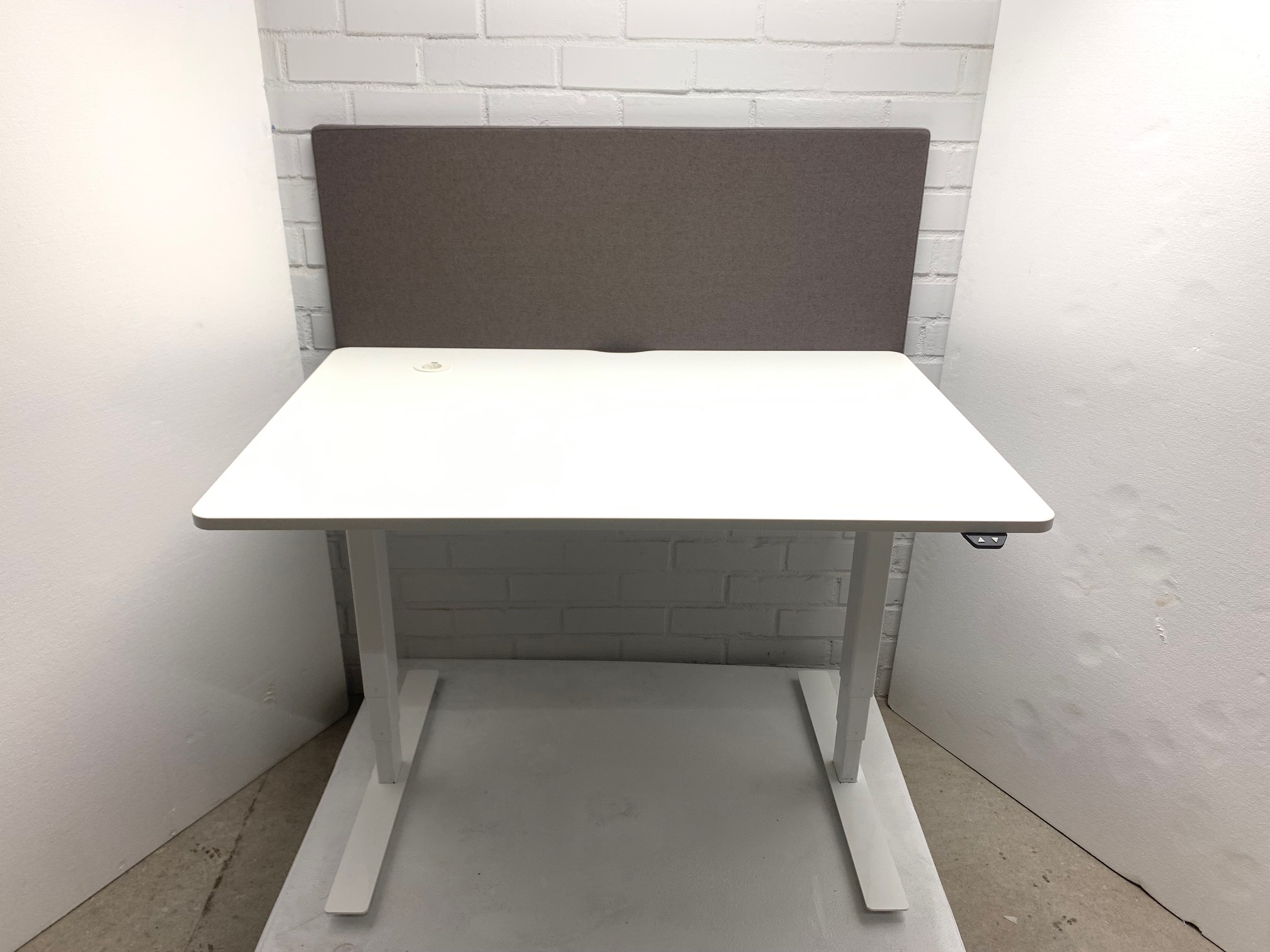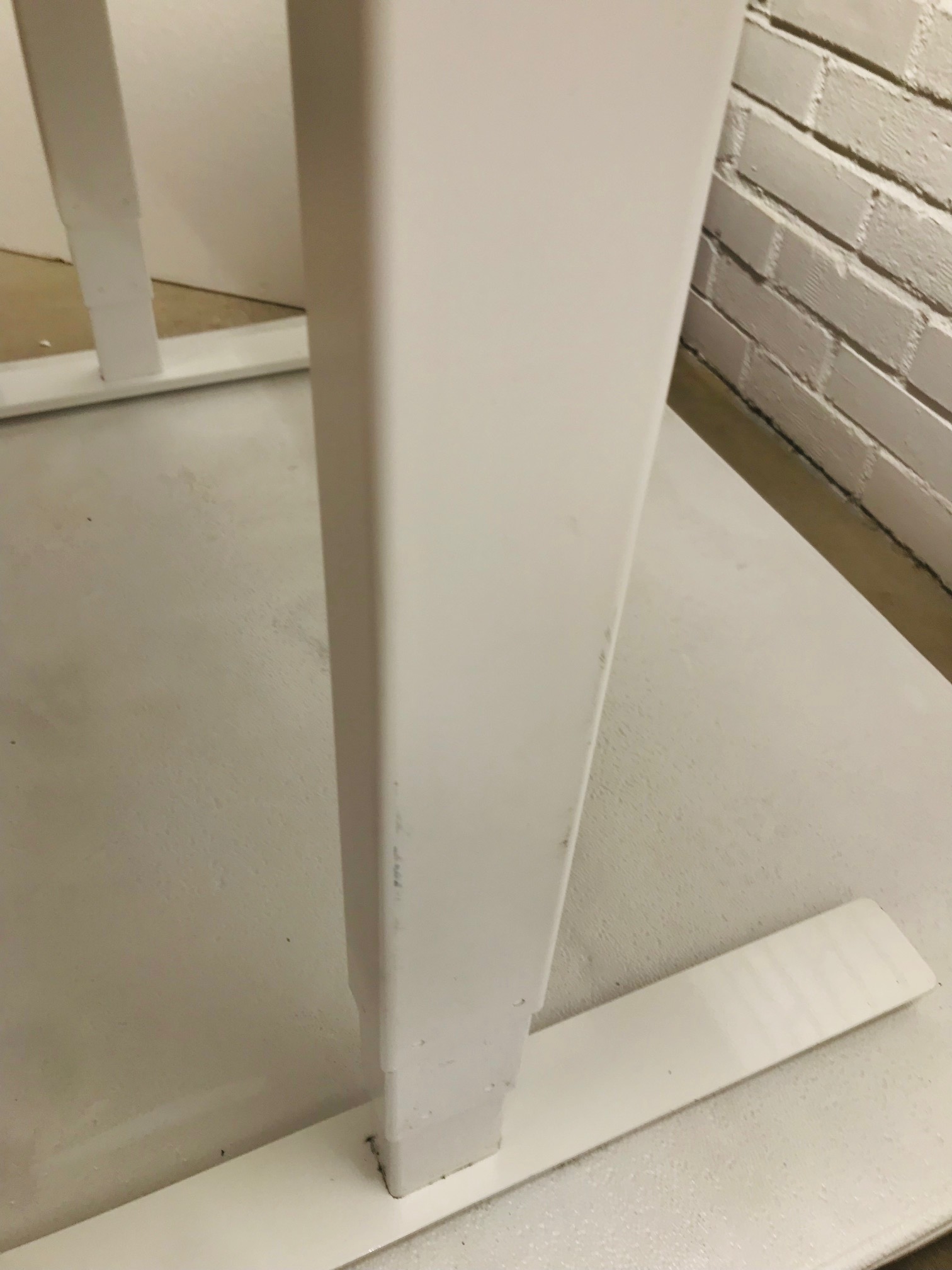 Table top in laminat (white). Base in metal (white). Adjustable height.