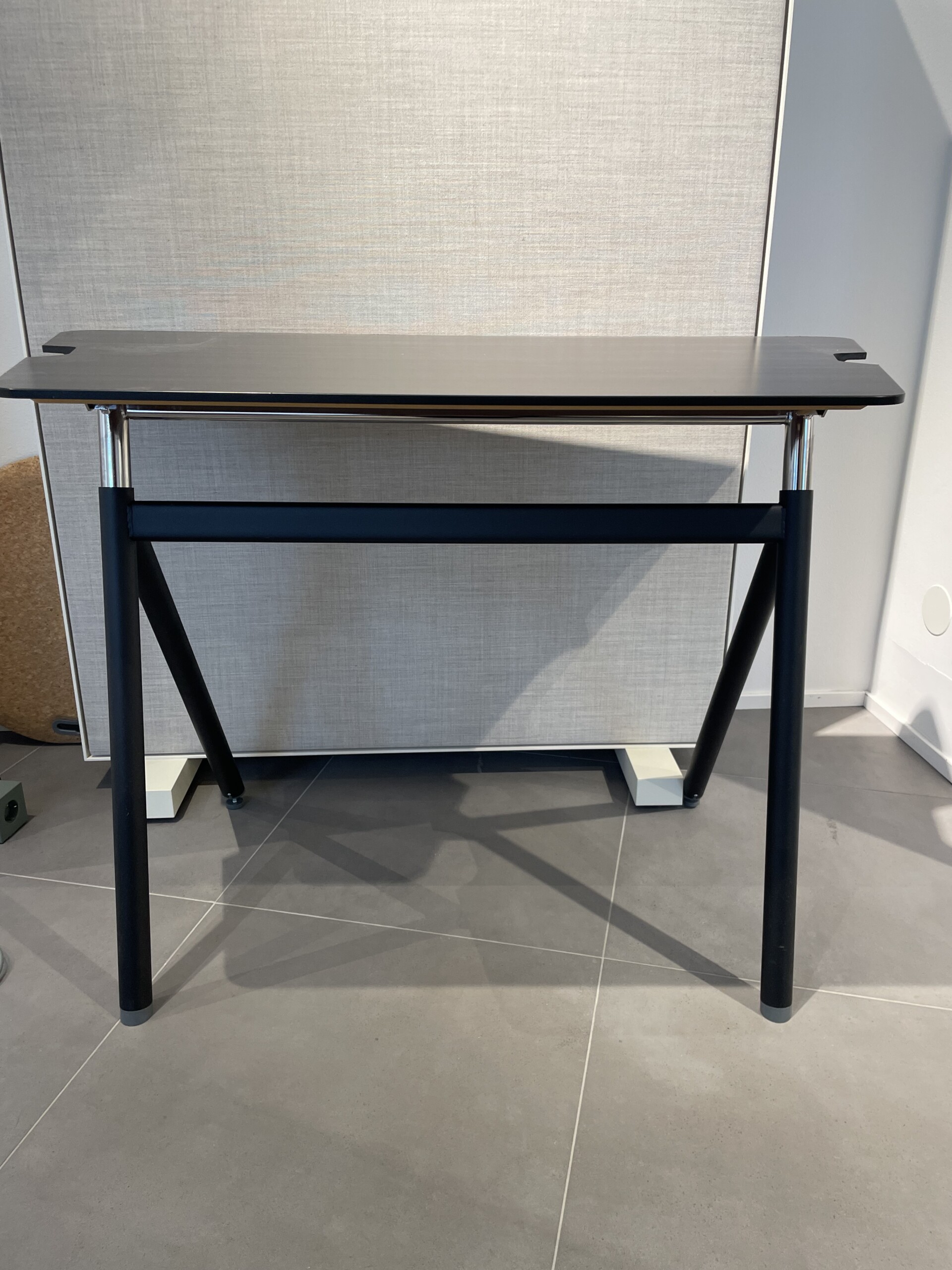 Table top in wood (black). Base in metal (black). Adjustable height.
