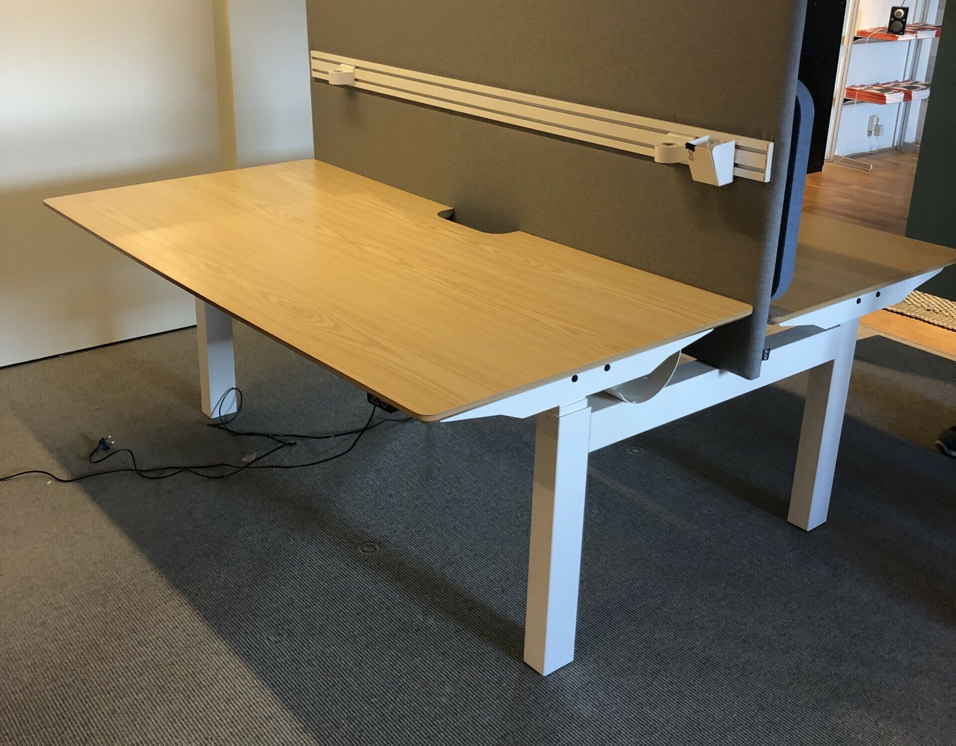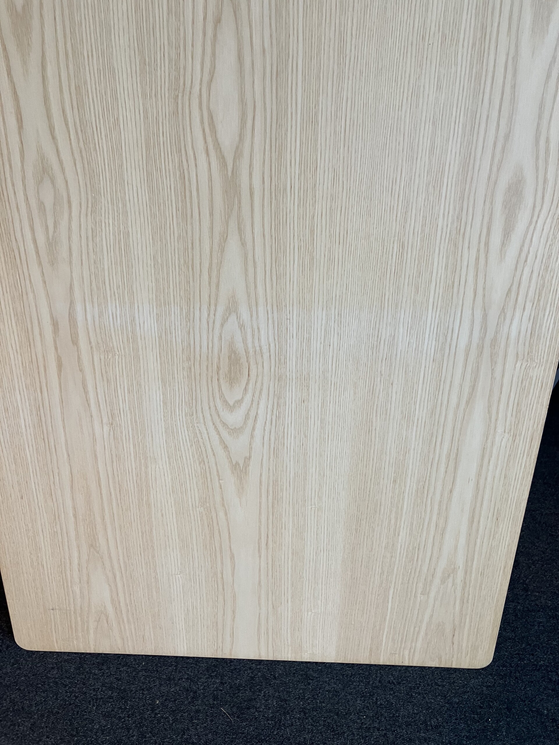 Table top in wood (ash). Base in metal (white). Adjustable height.