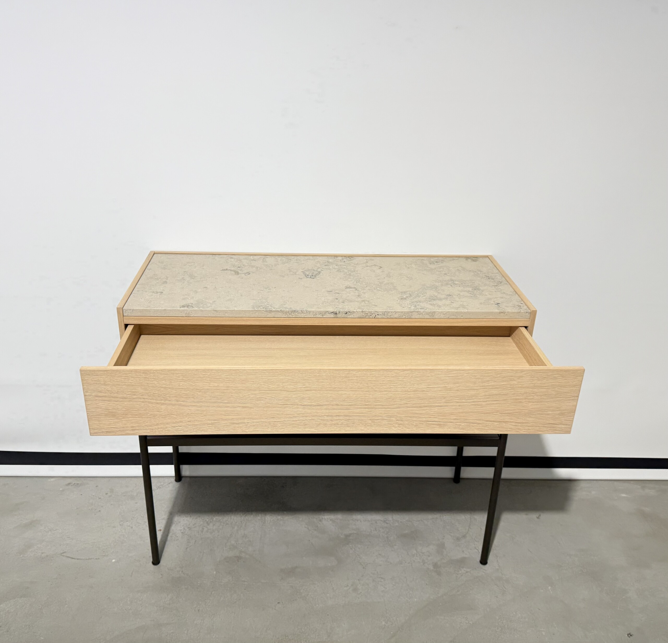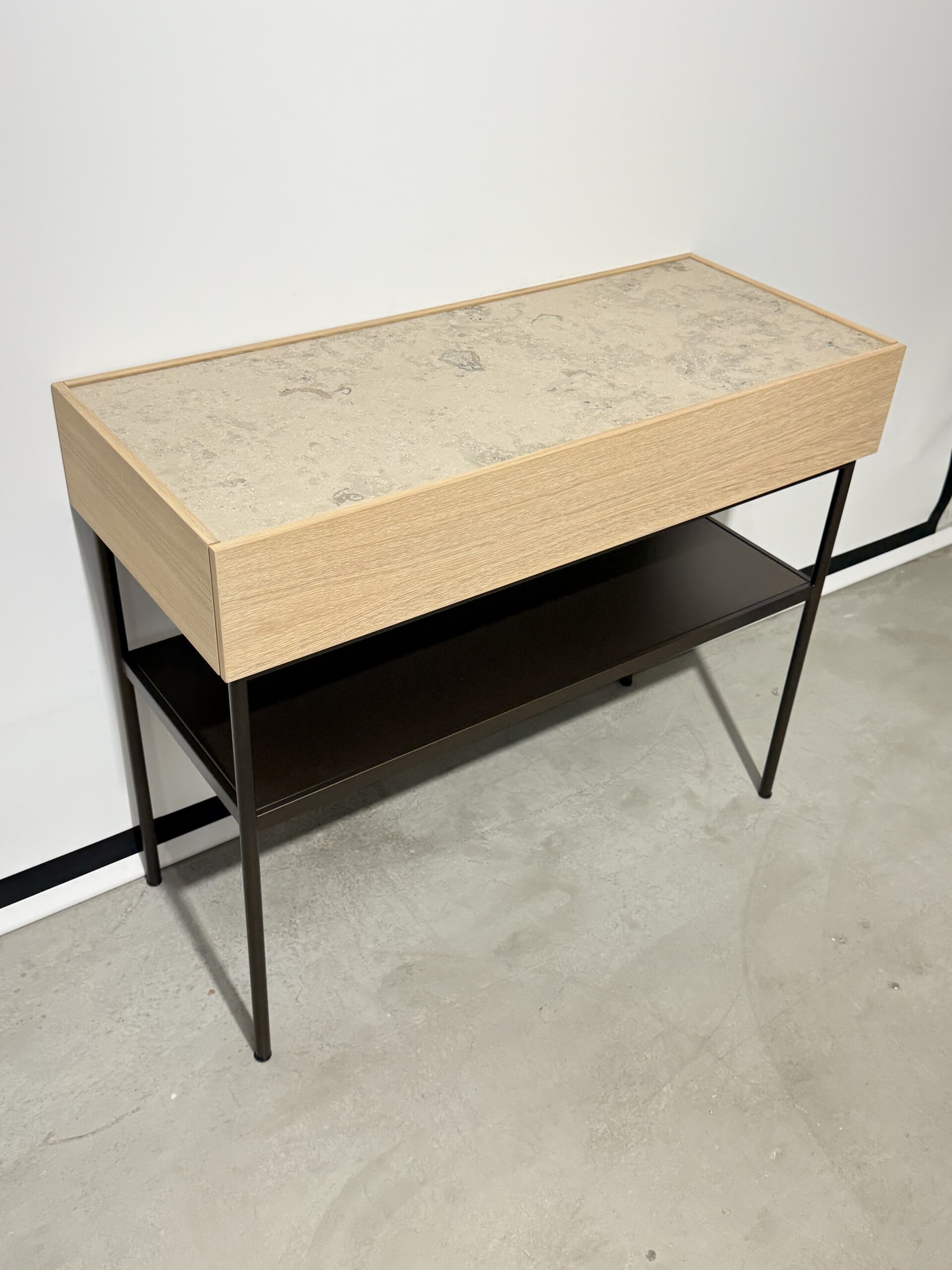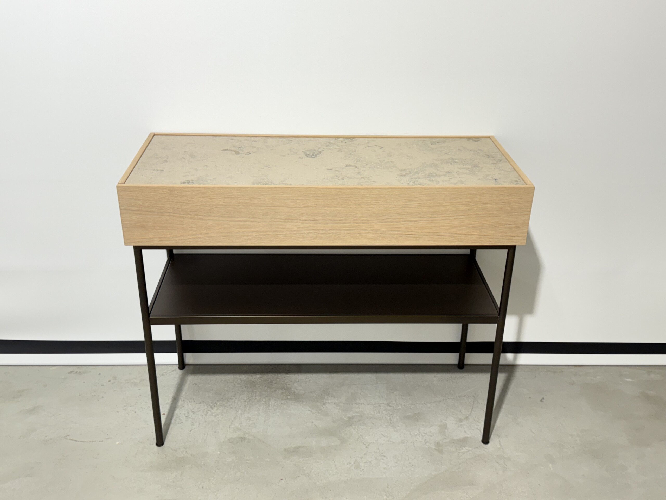 Frame in metall (black). Front in trä (oak).