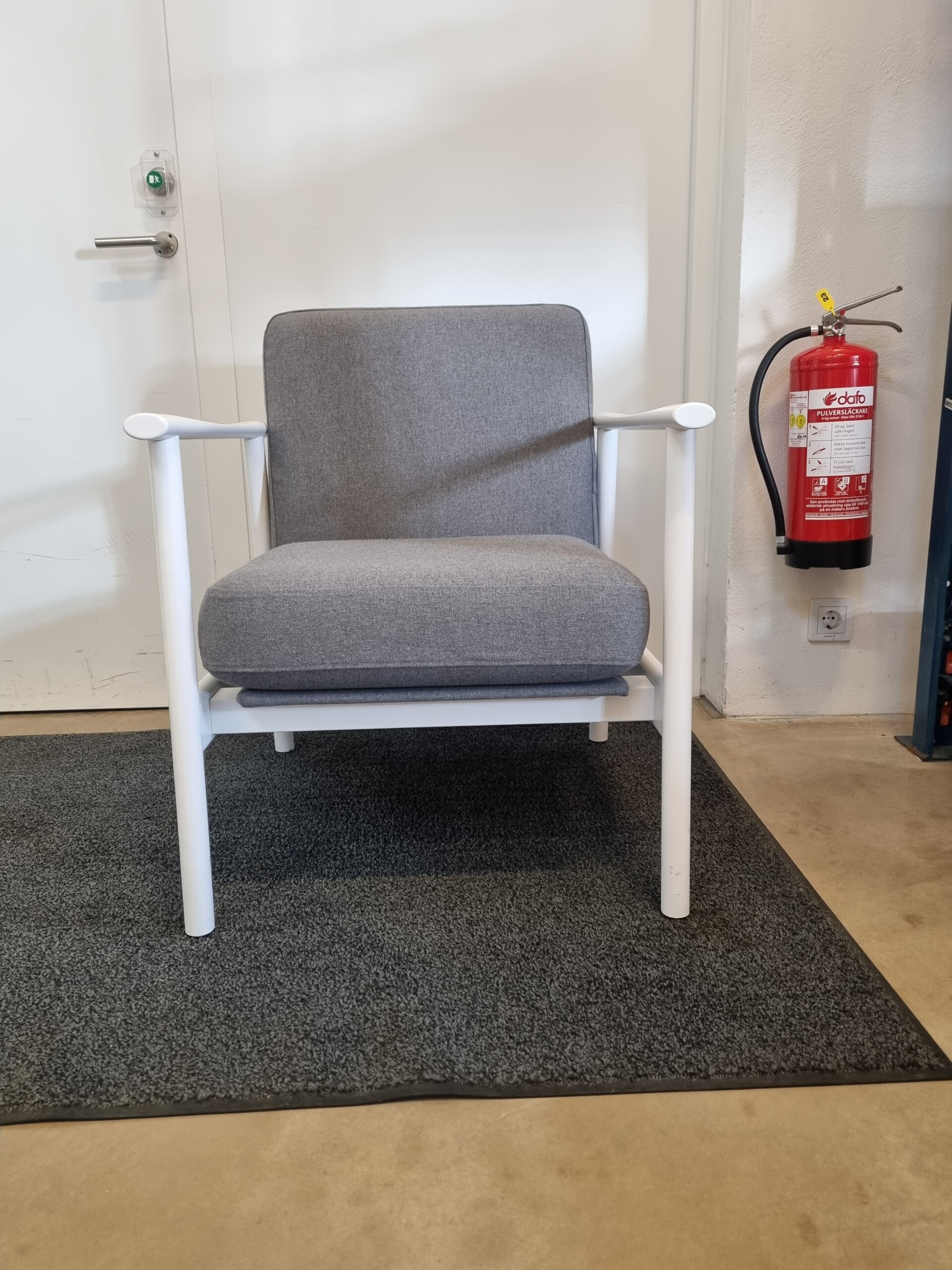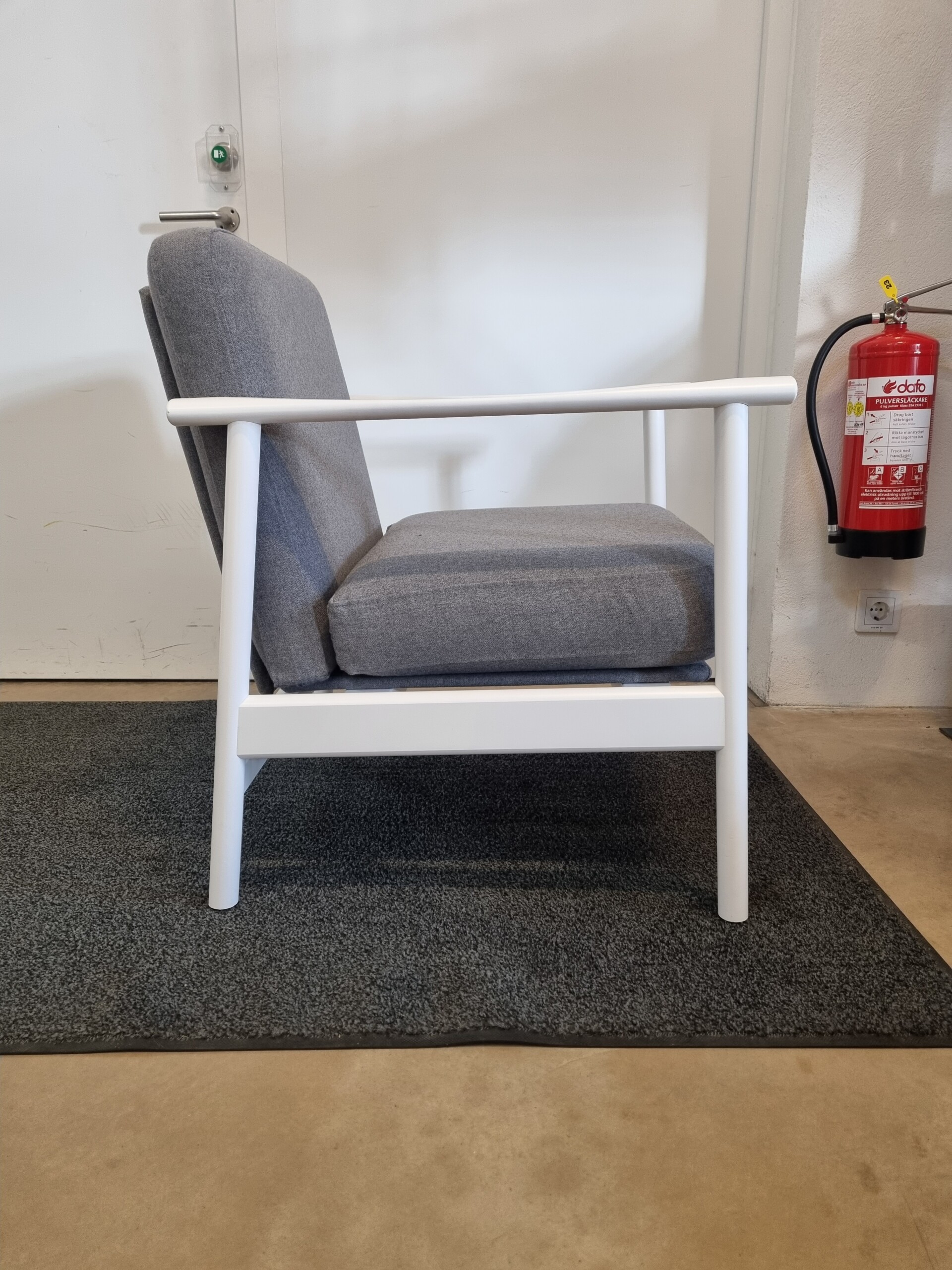 Seat and backrest in fabric (grey). Legs in wood (white).