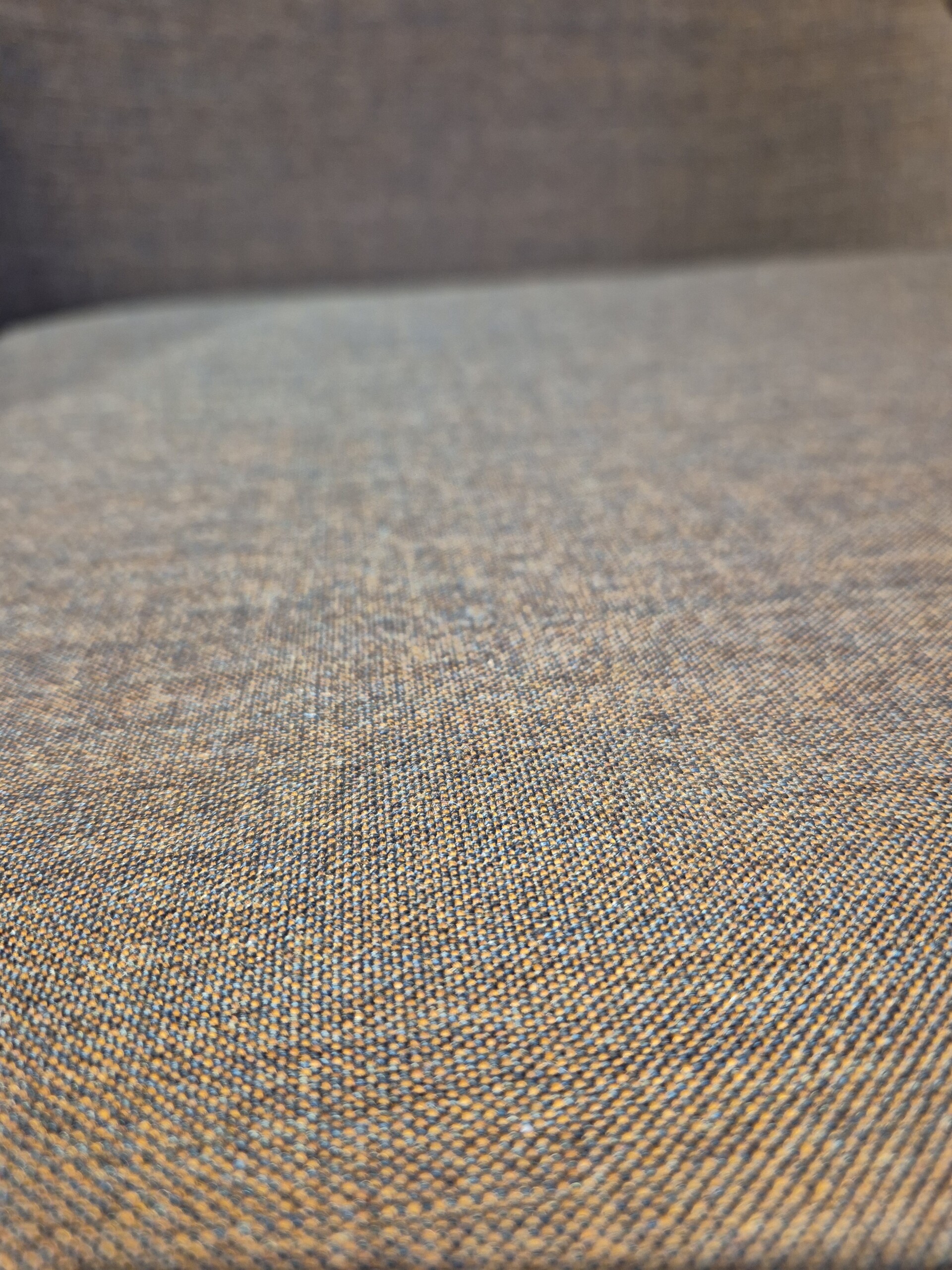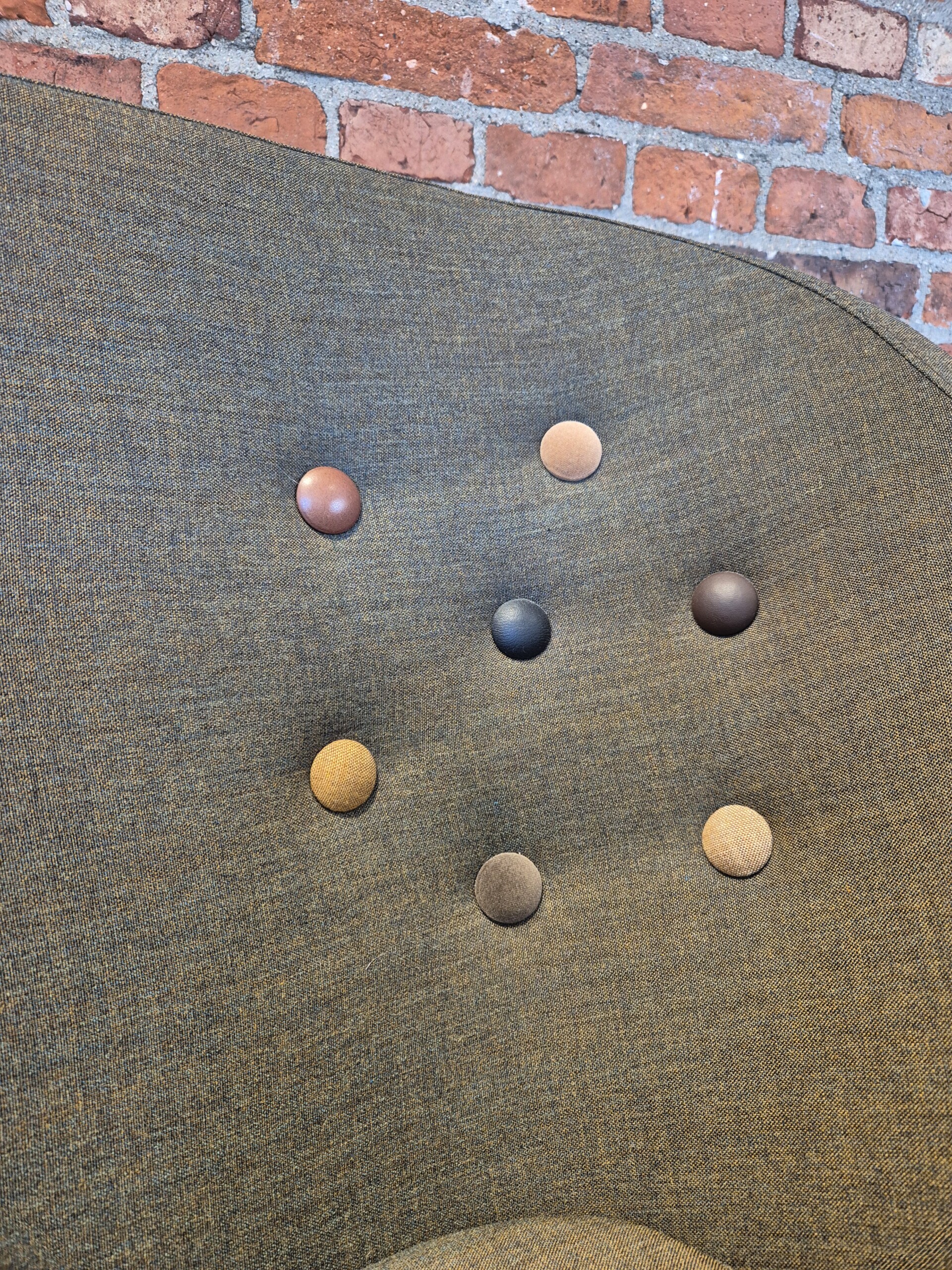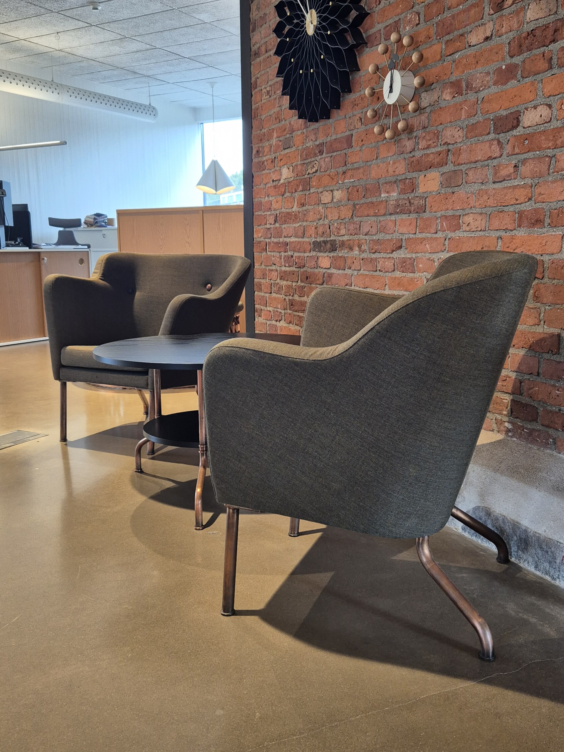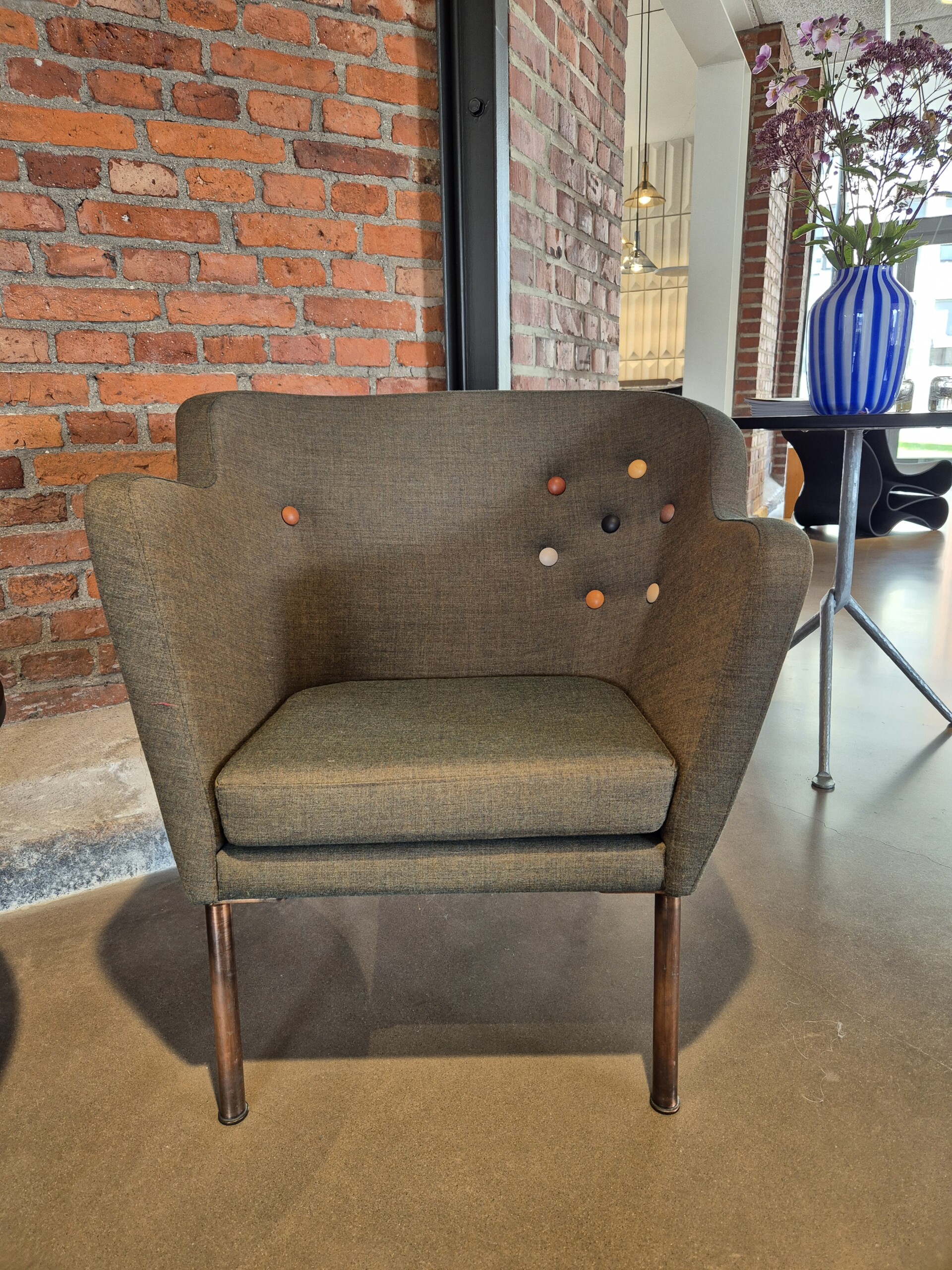 Seat and backrest in fabric (green). Legs in metal (koppar).