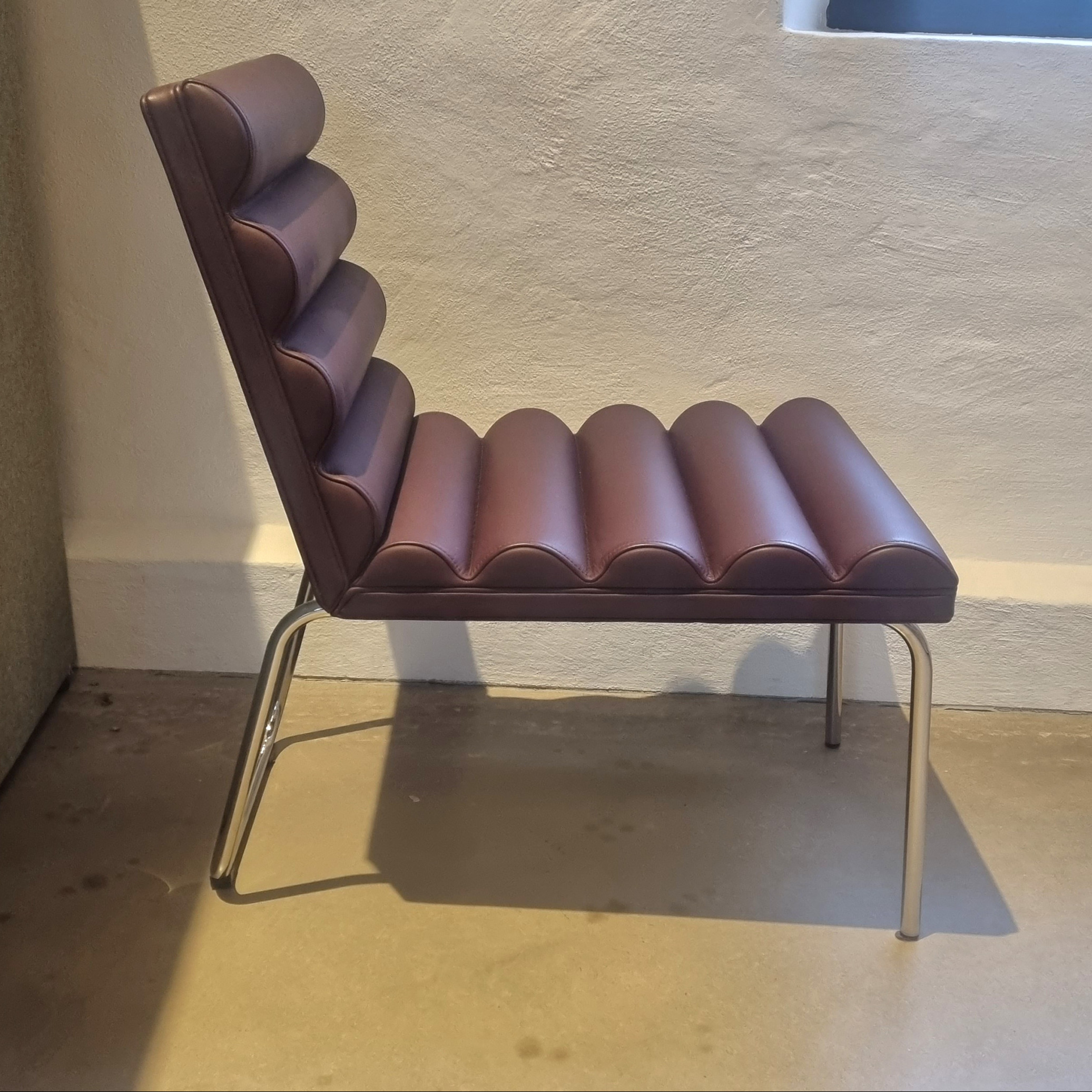 Seat and backrest in leather (brown). Sledgebase in metal (chrome).