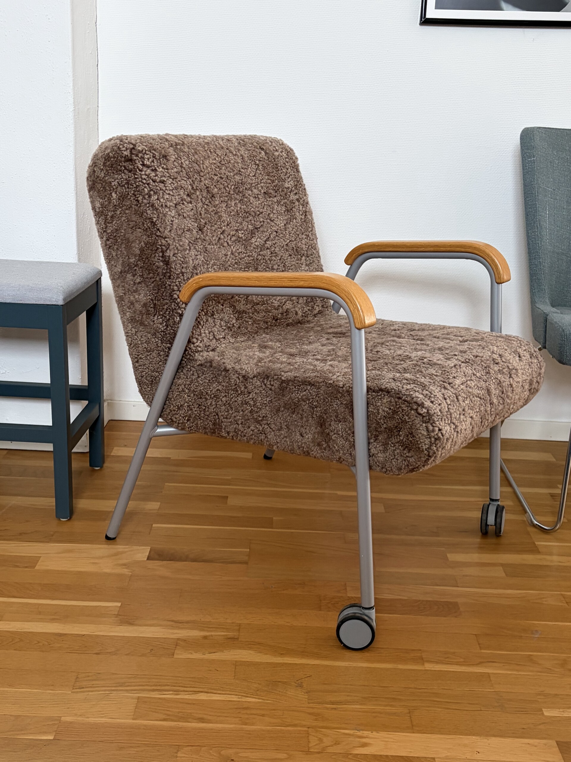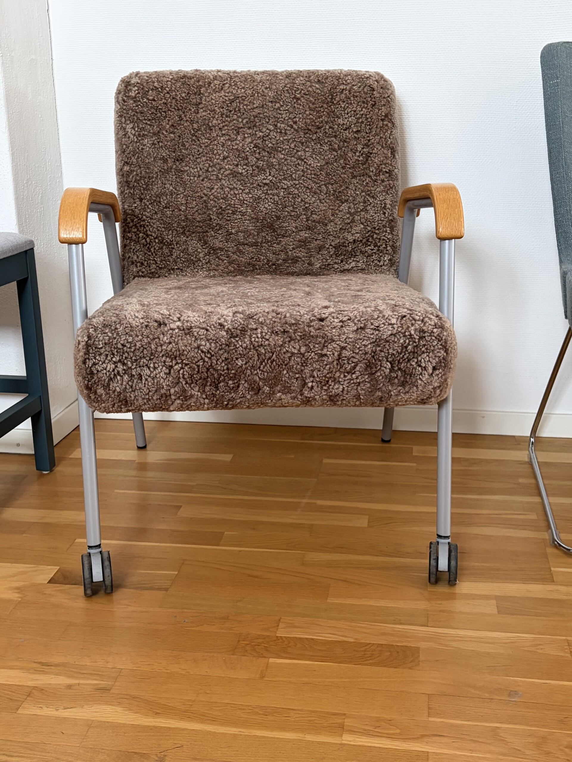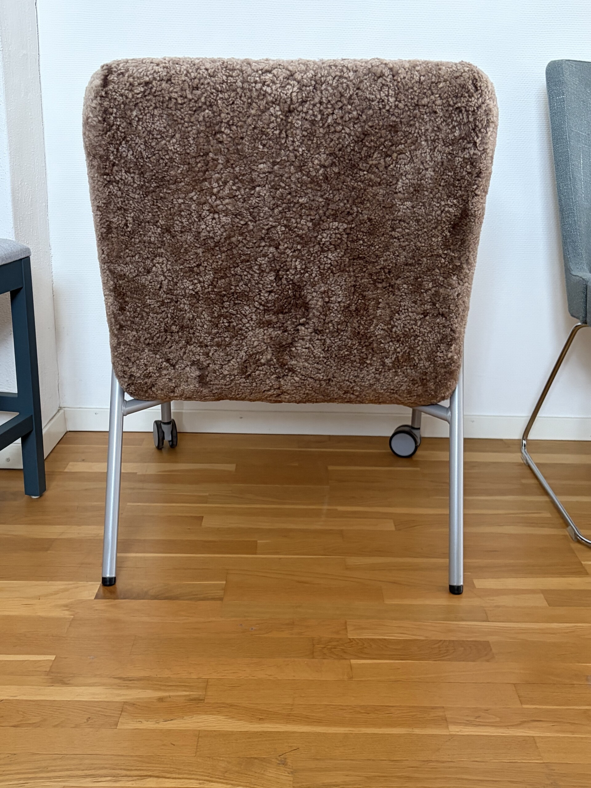 Seat and backrest in sheepskin (brown). Legs in metal (silver).
