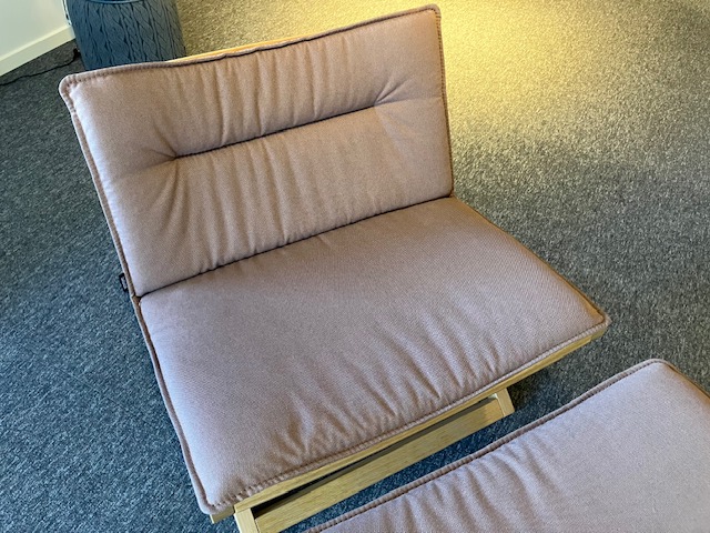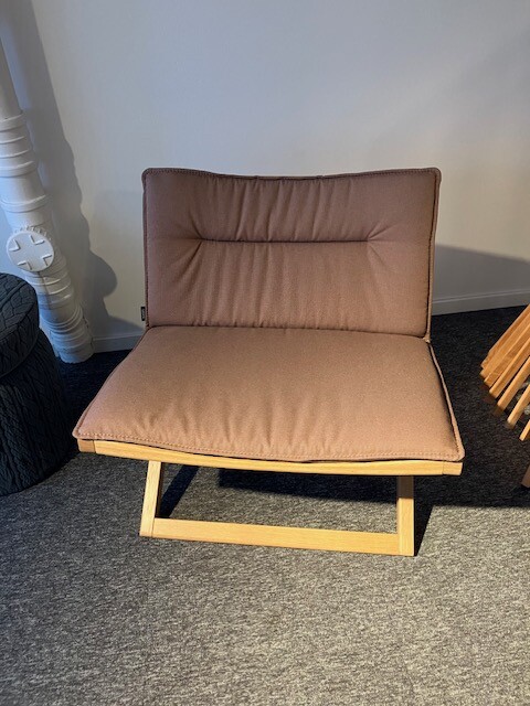 Seat and backrest in fabric (pink). Sledgebase in wood (oak).