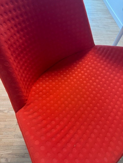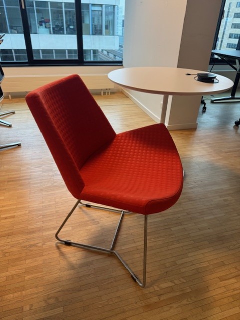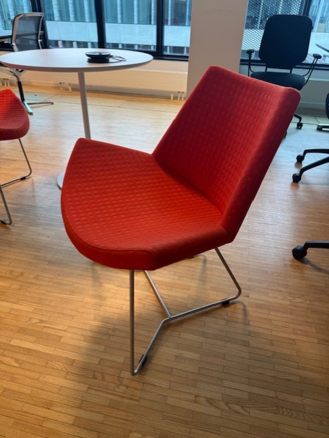 Seat and backrest in fabric (red). Sledgebase in metal (stainless).