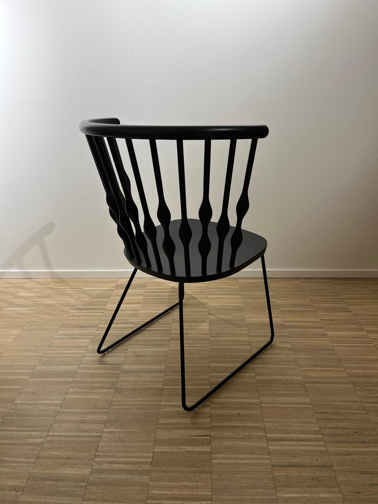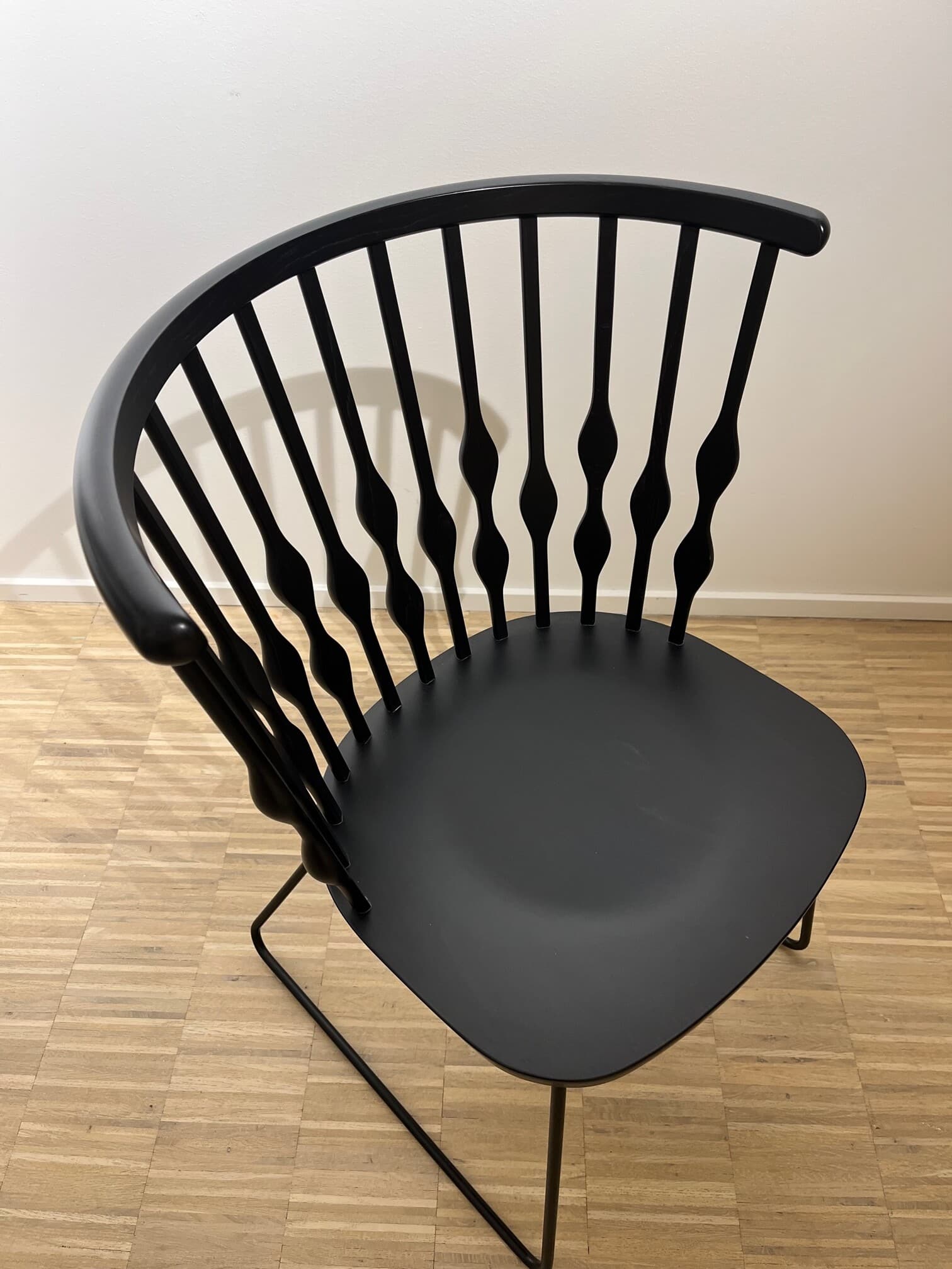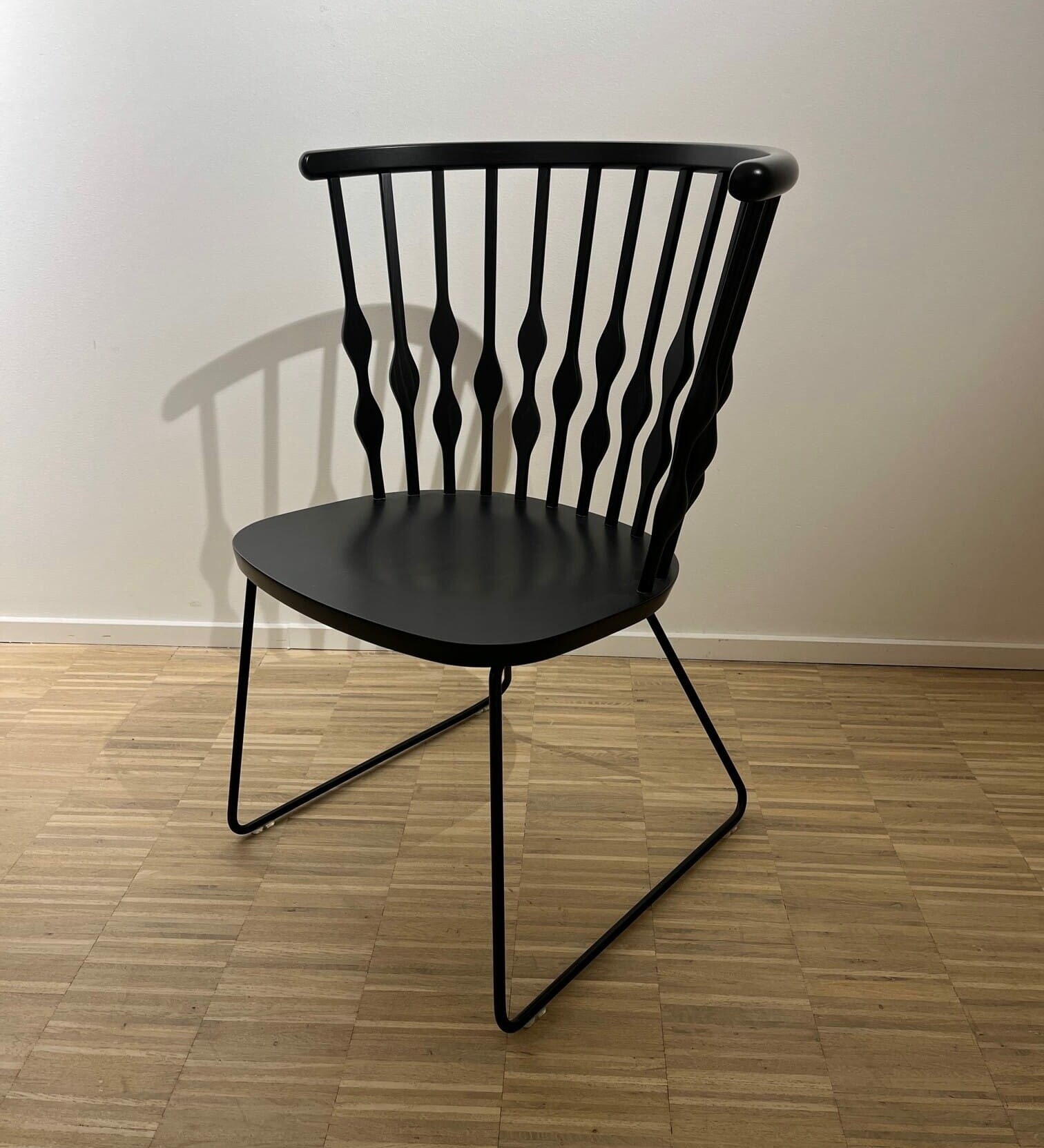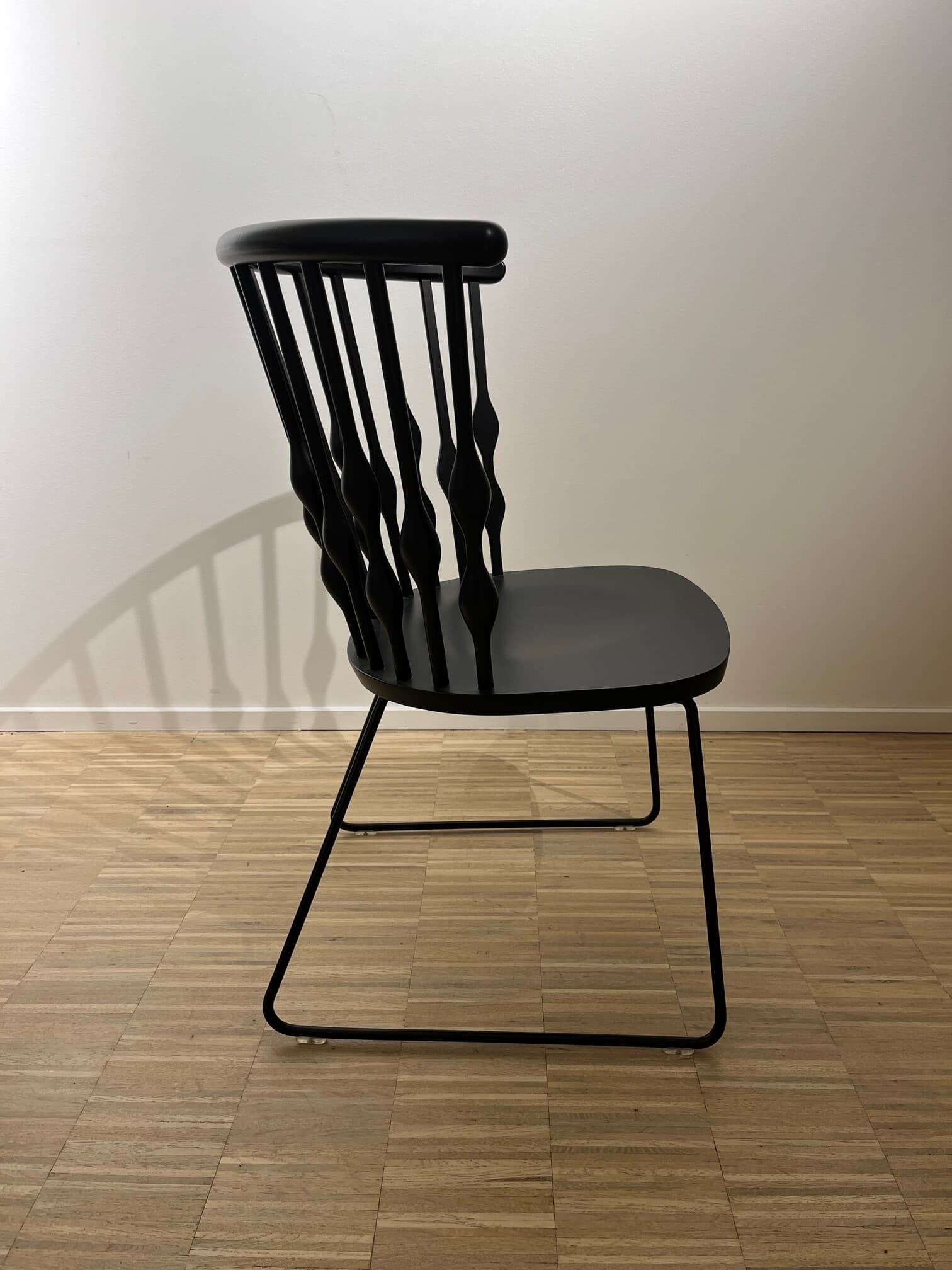 Seat and backrest in wood (black). Sledgebase in metal (black).
