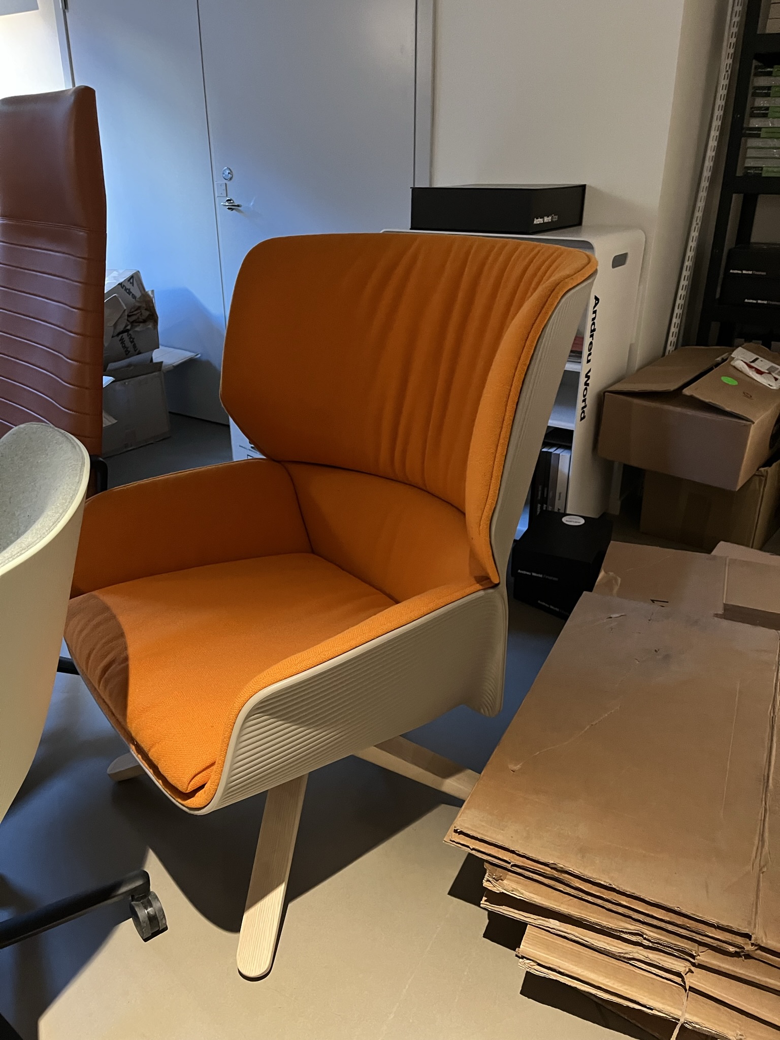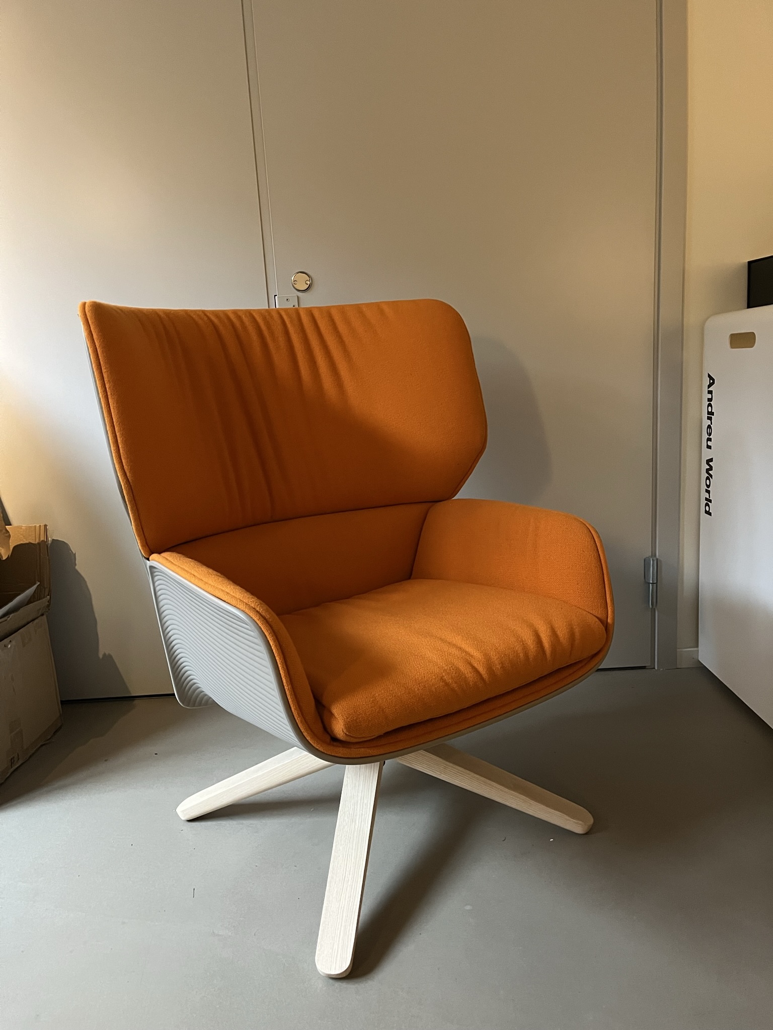 Seat and backrest in fabric (orange). Star base in wood.
