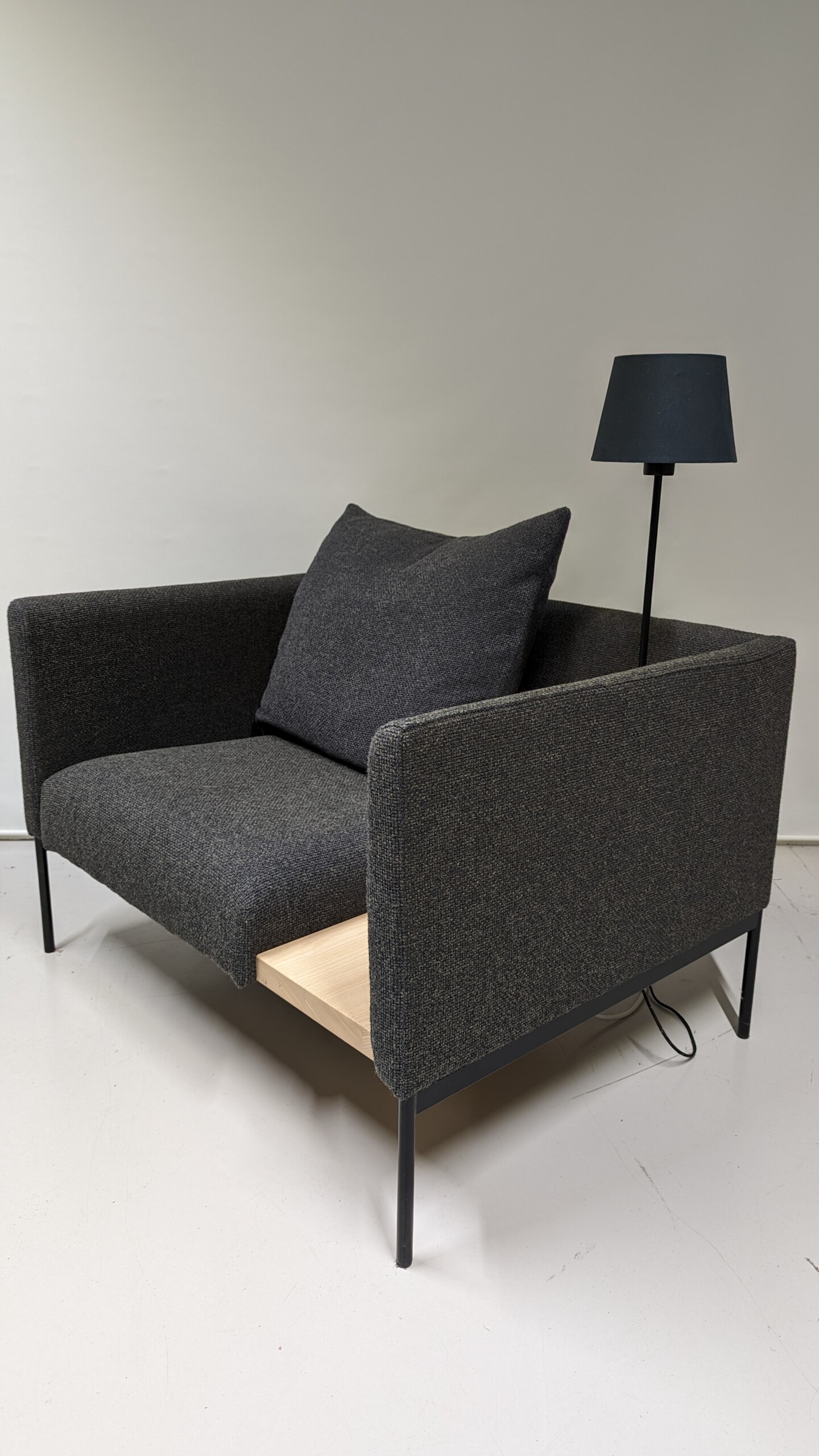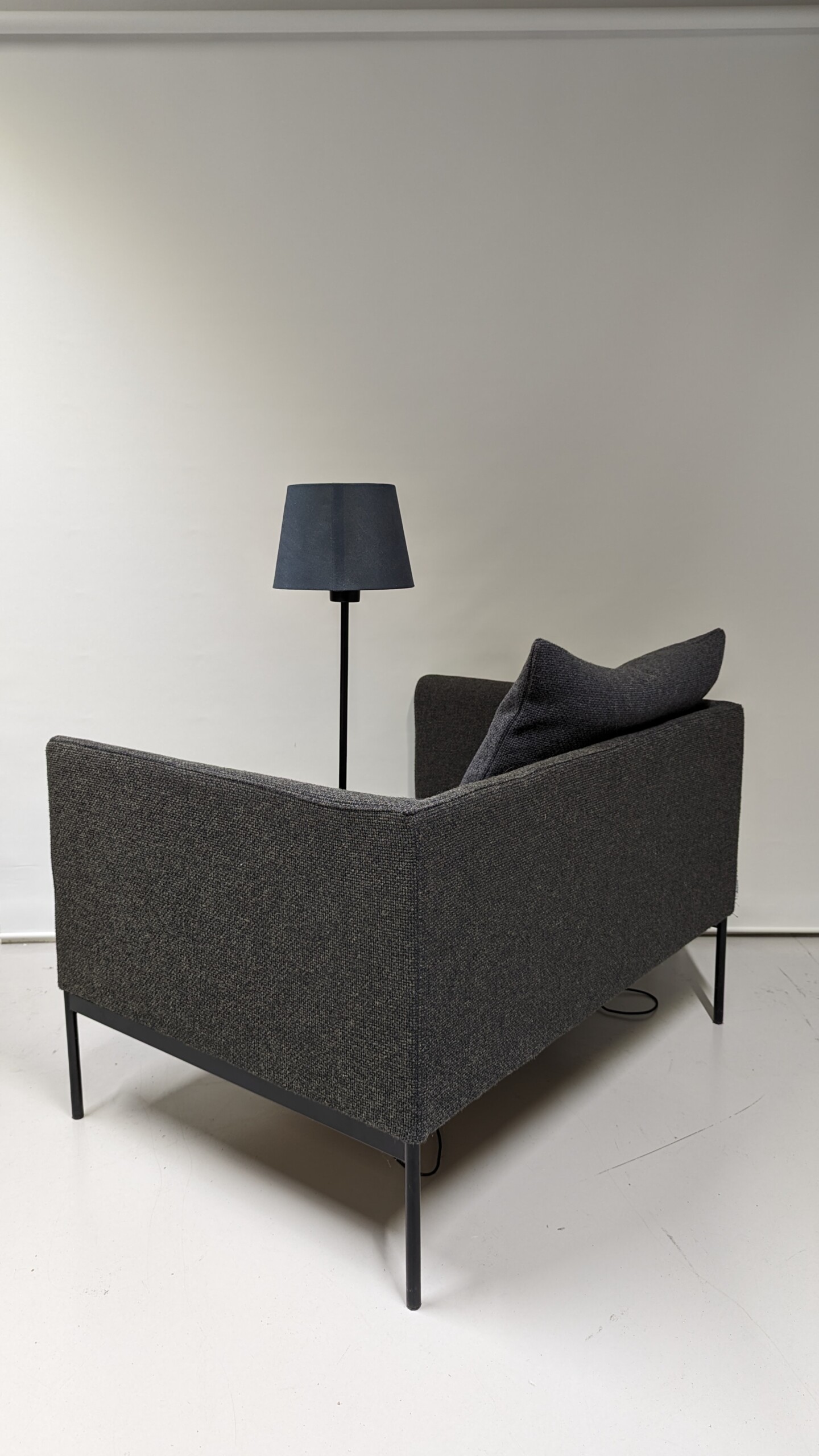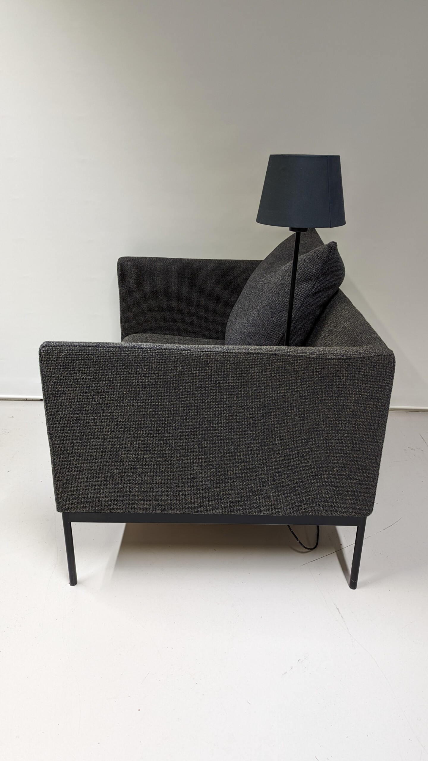 Seat and backrest in fabric (grey). Legs in metal (black).