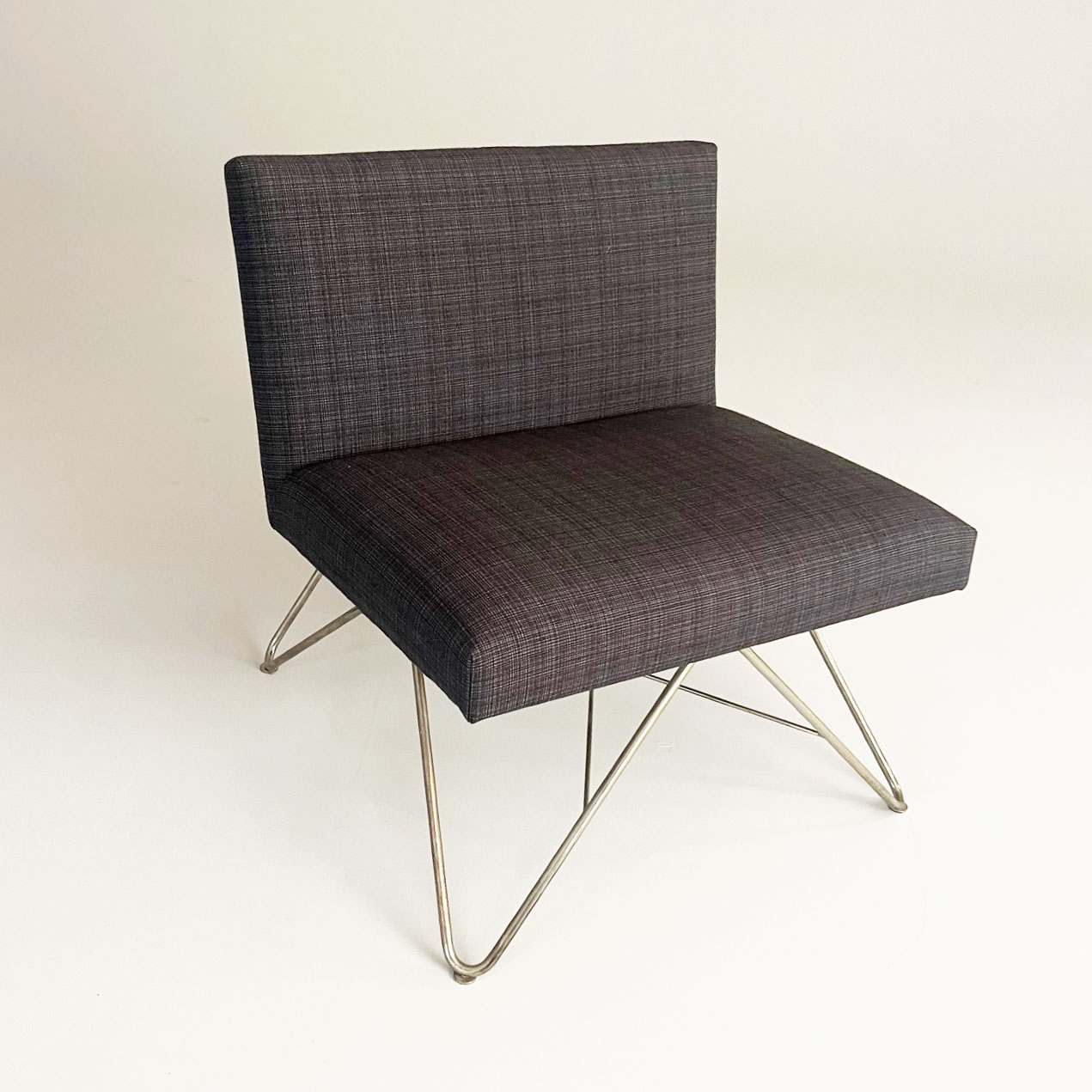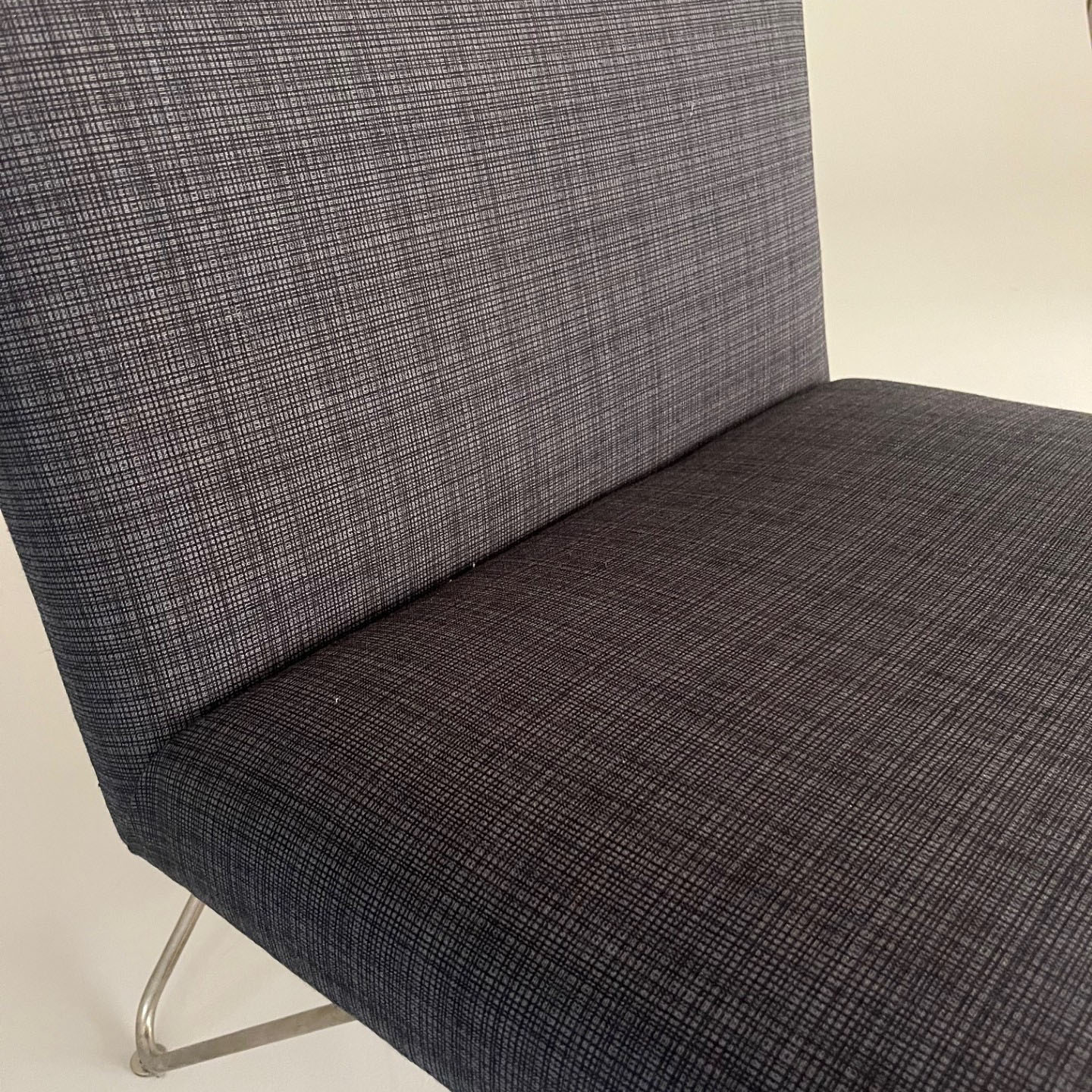Seat and backrest in fabric (grey). Legs in metal (mässing).