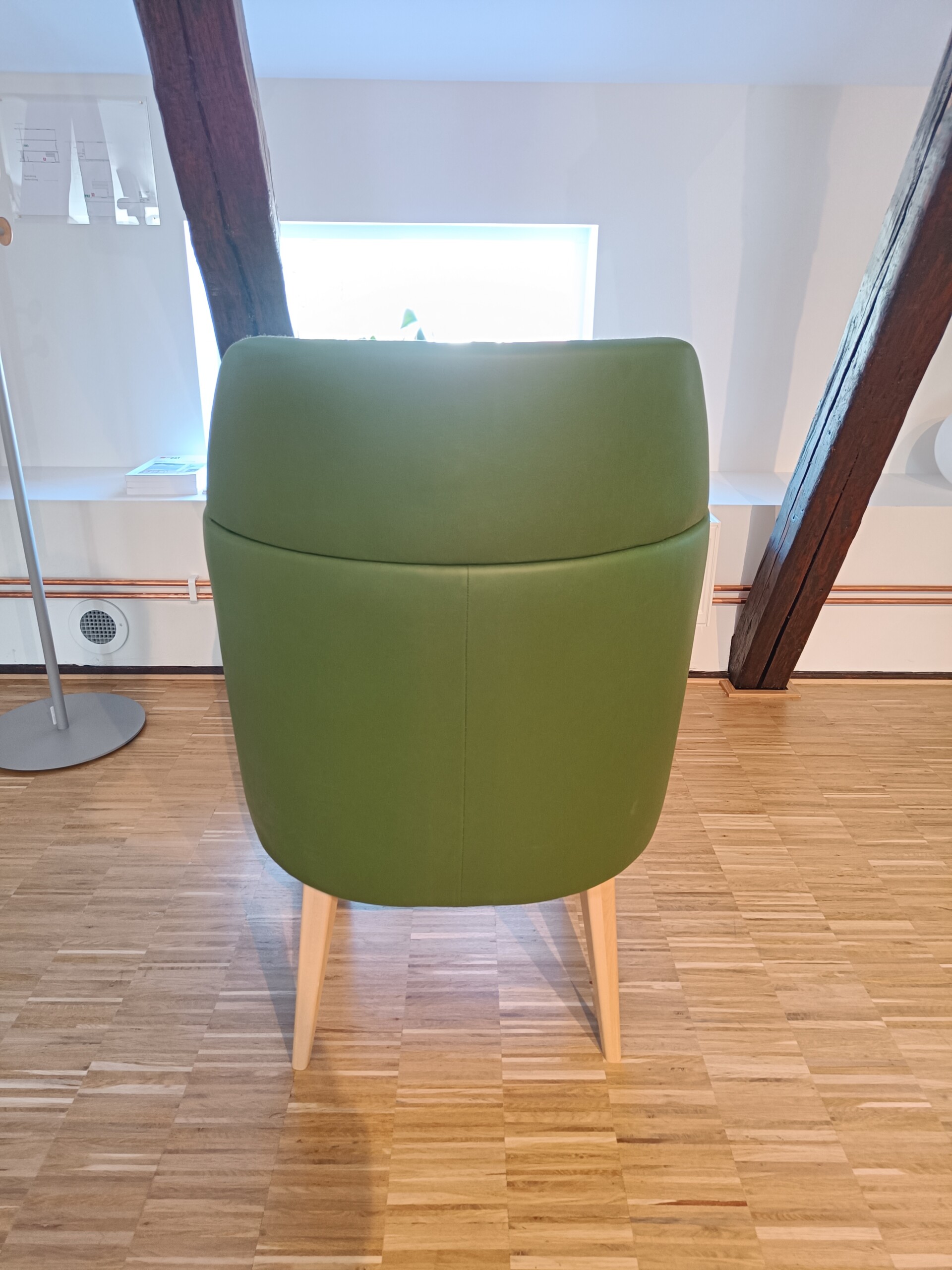 Seat and backrest in artificial leather (green). Legs in wood (birch).