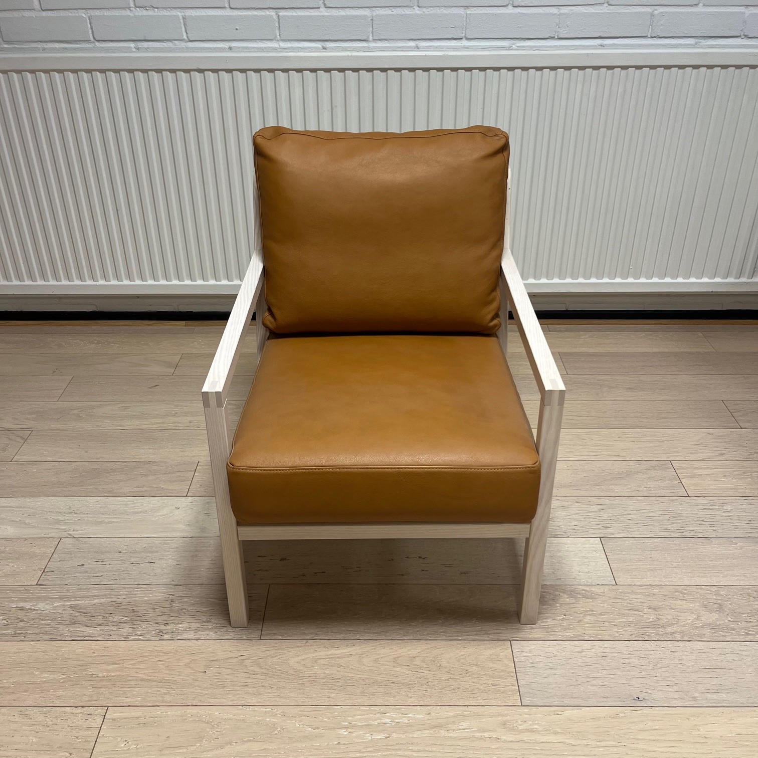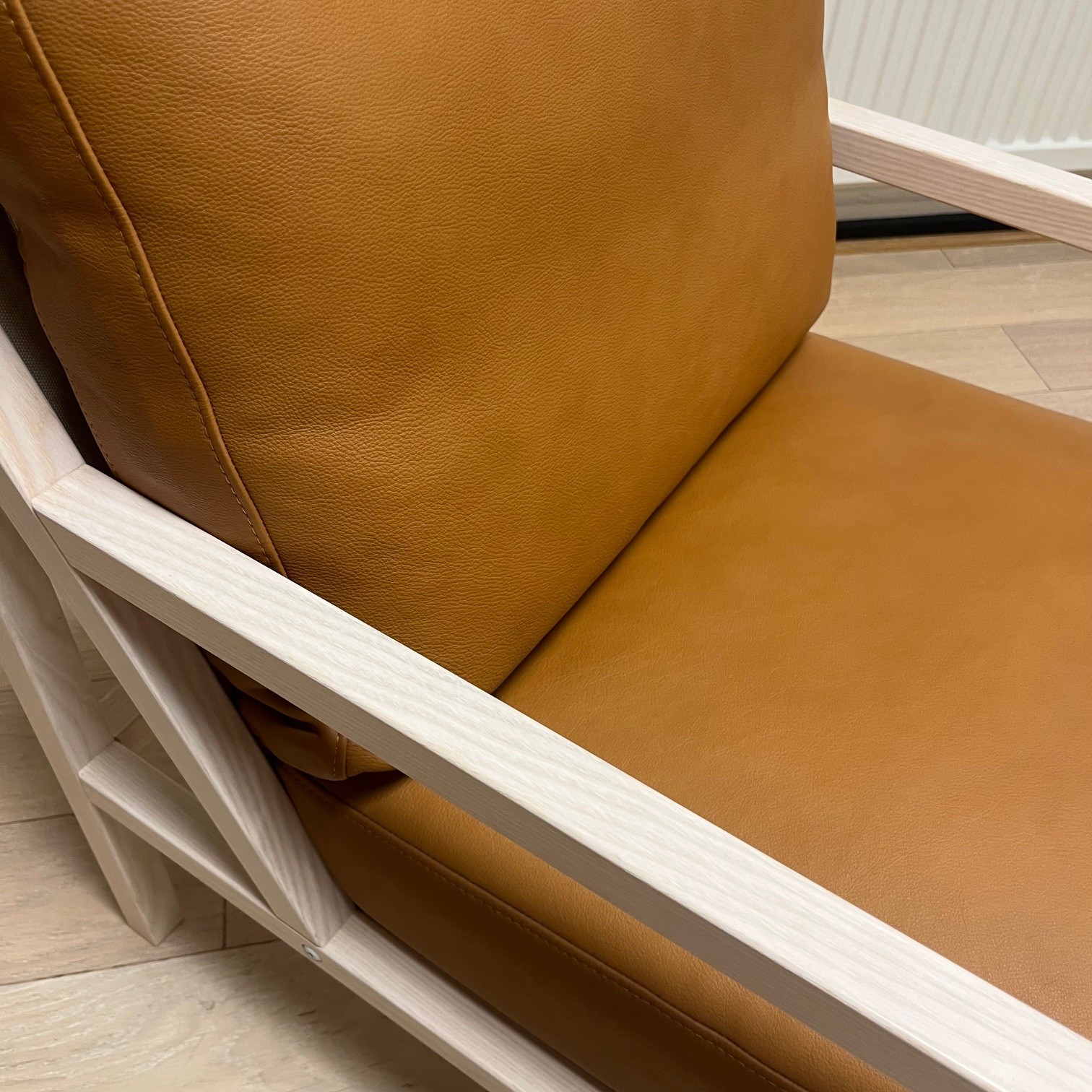 Seat and backrest in leather (brown). Legs in wood (ash).