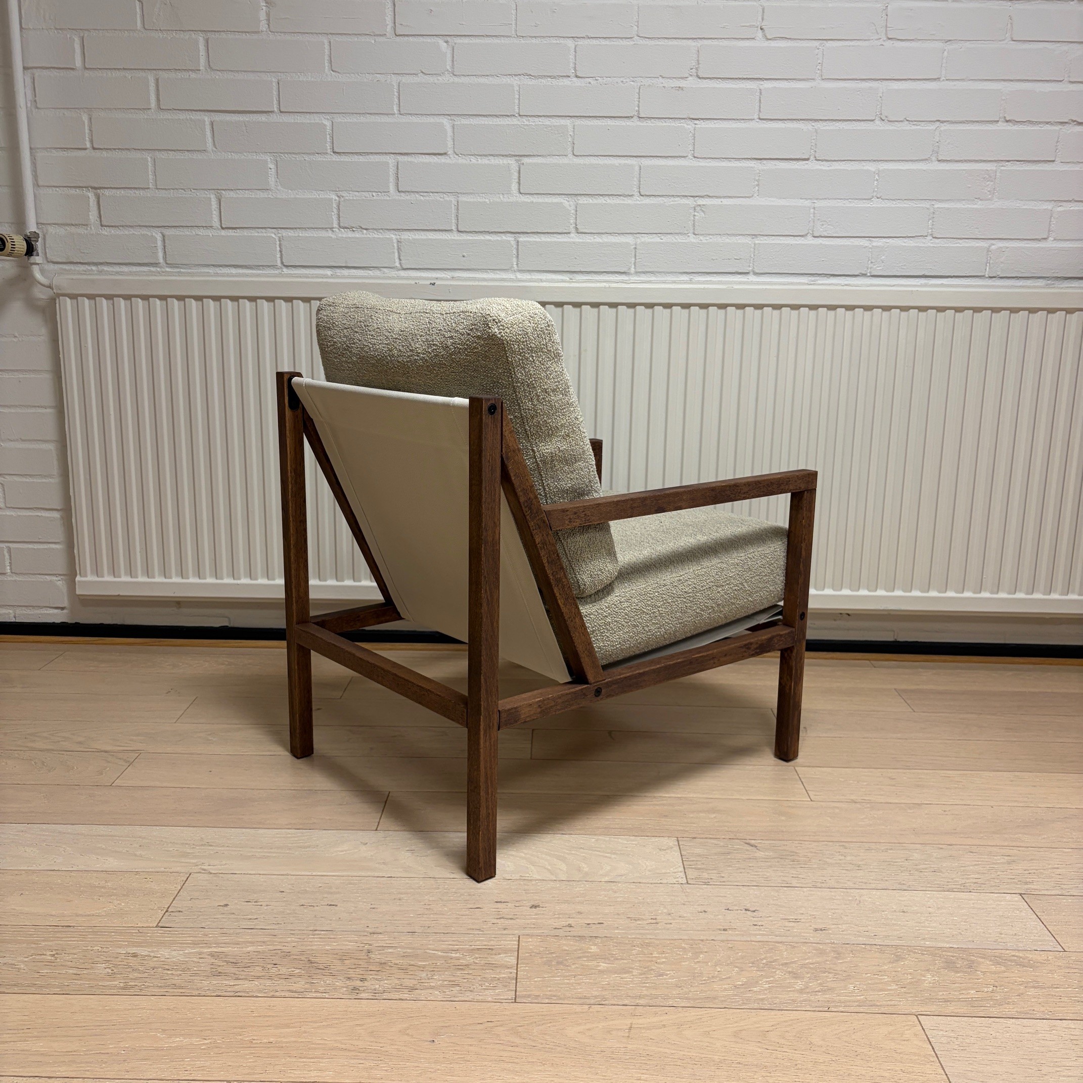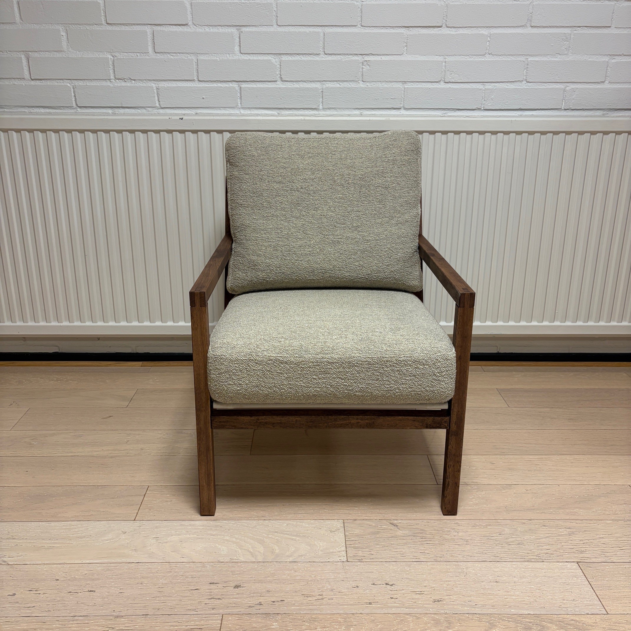 Seat and backrest in fabric (beige). Legs in wood (brown).