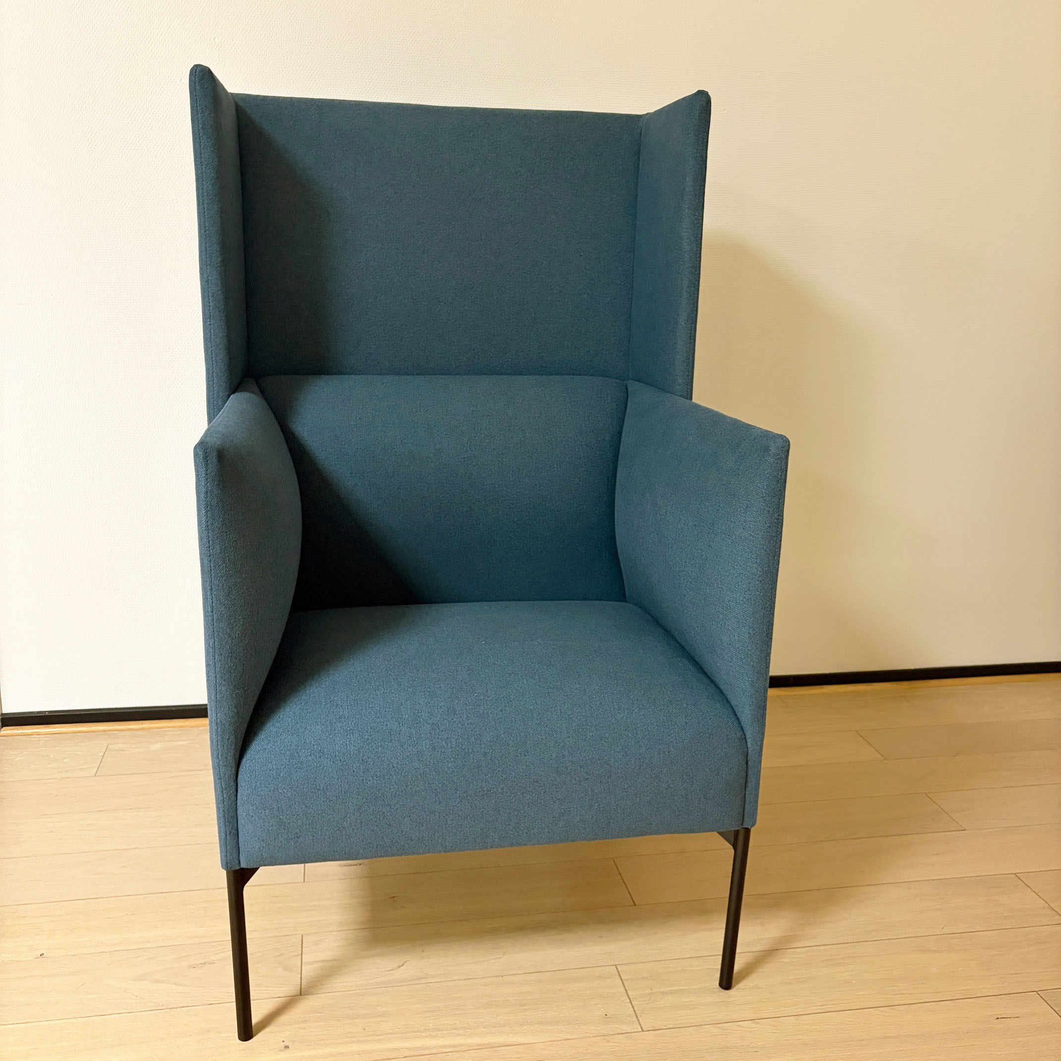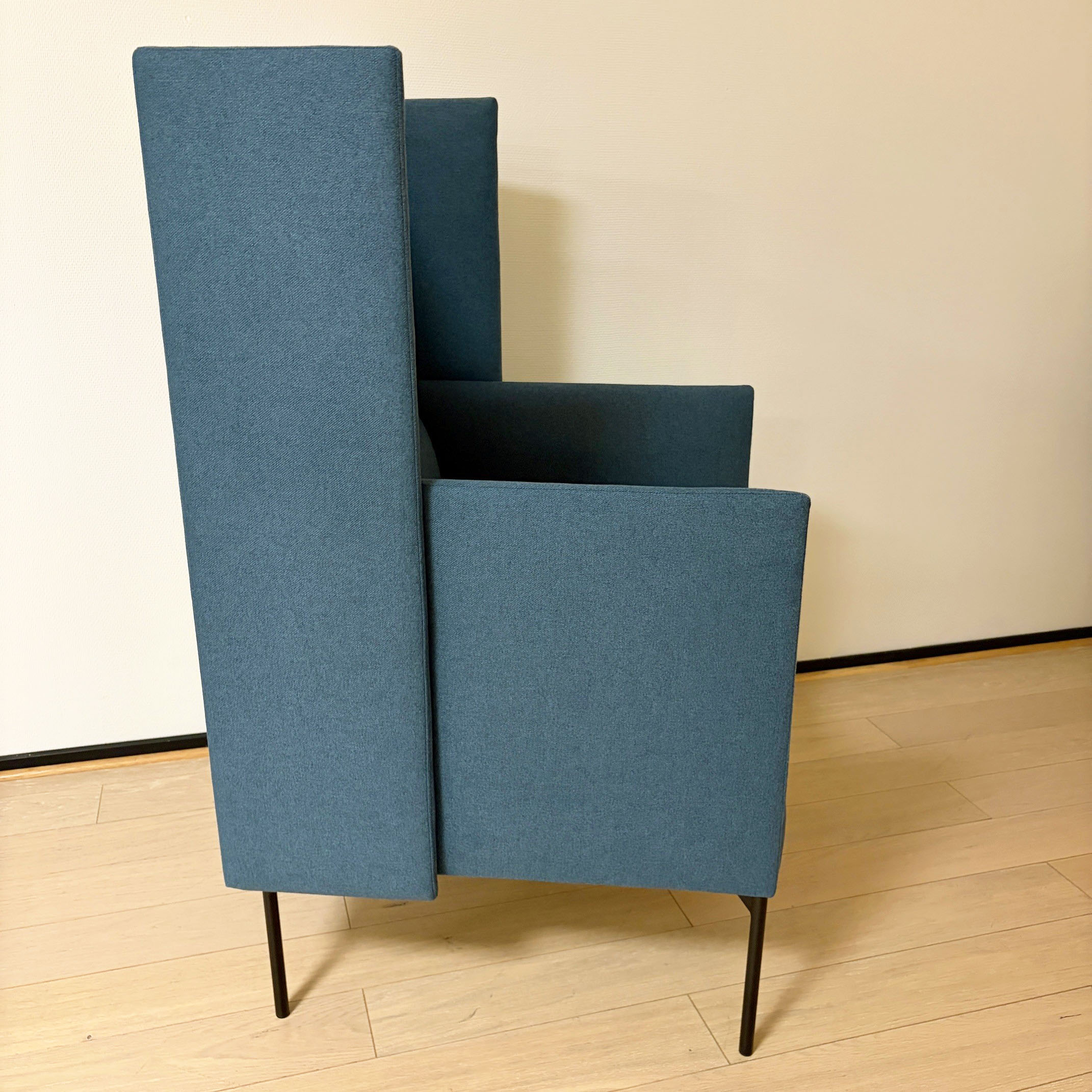 Seat and backrest in fabric (blue). Legs in metal (black).