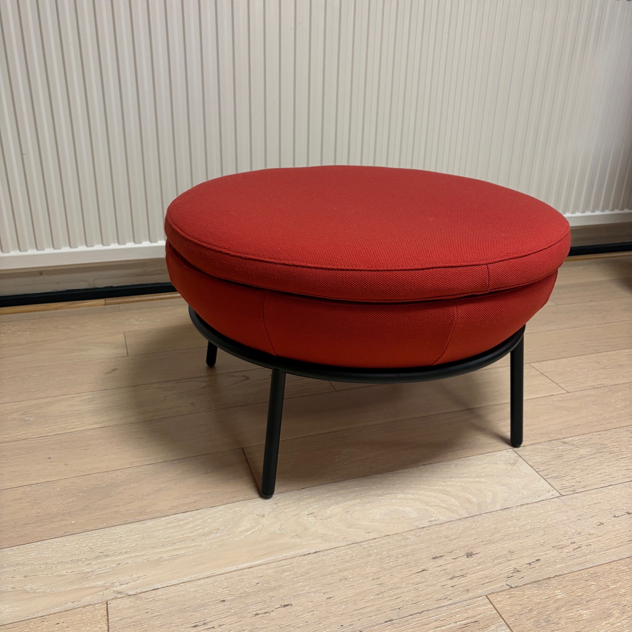 Seat in fabric (red). Legs in metal (black).