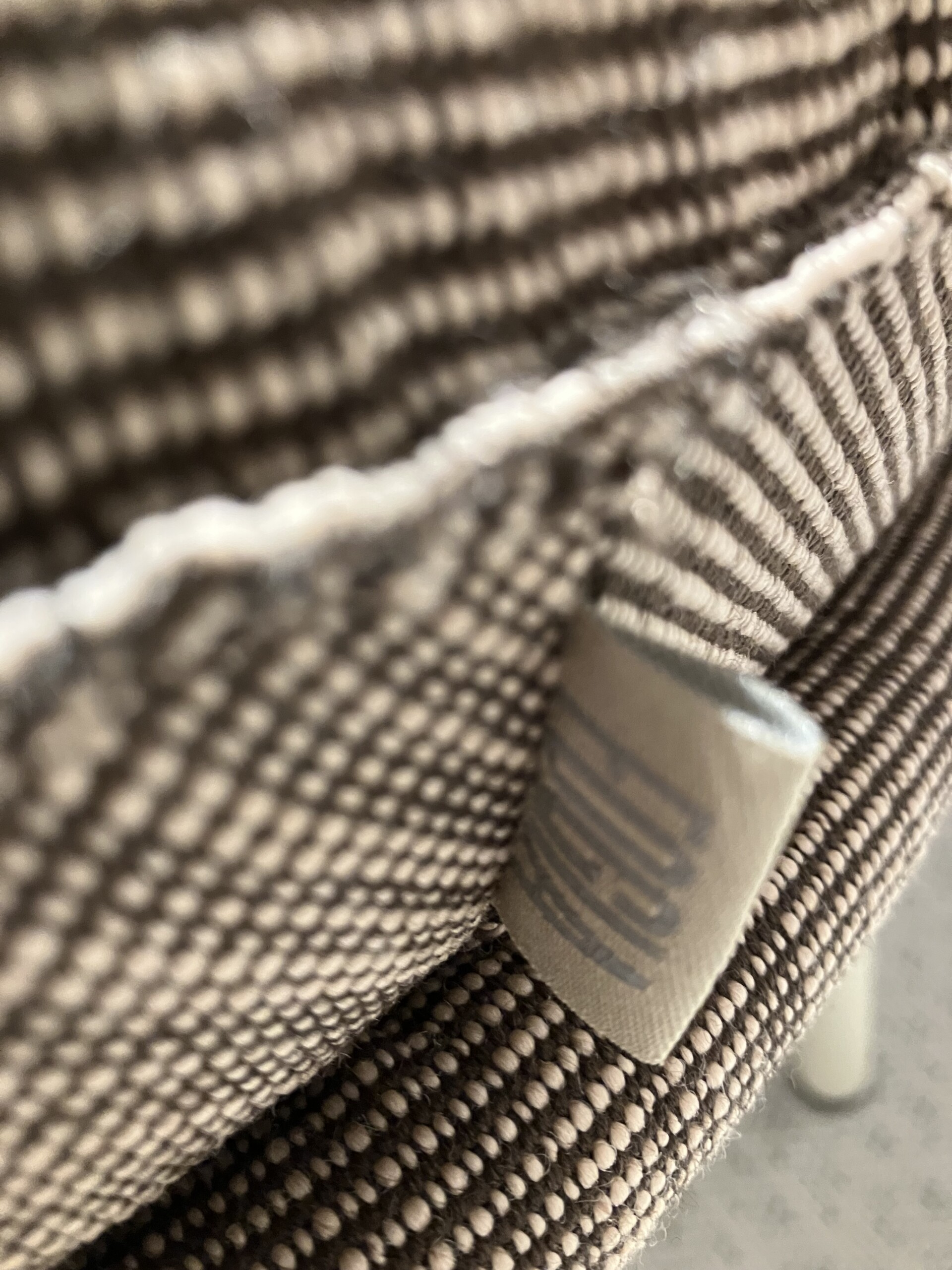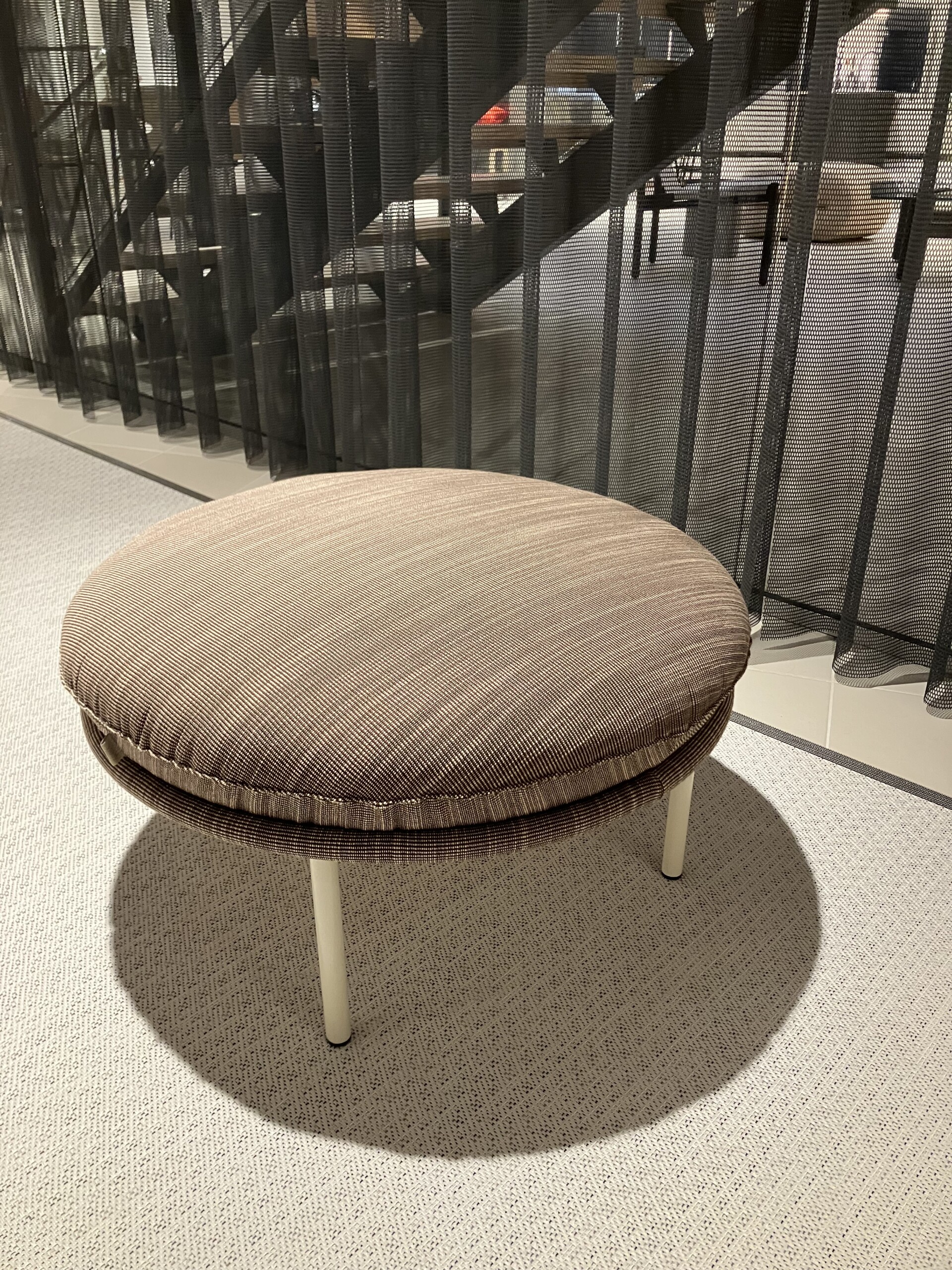 Seat in fabric (brown). Legs in metal (white).